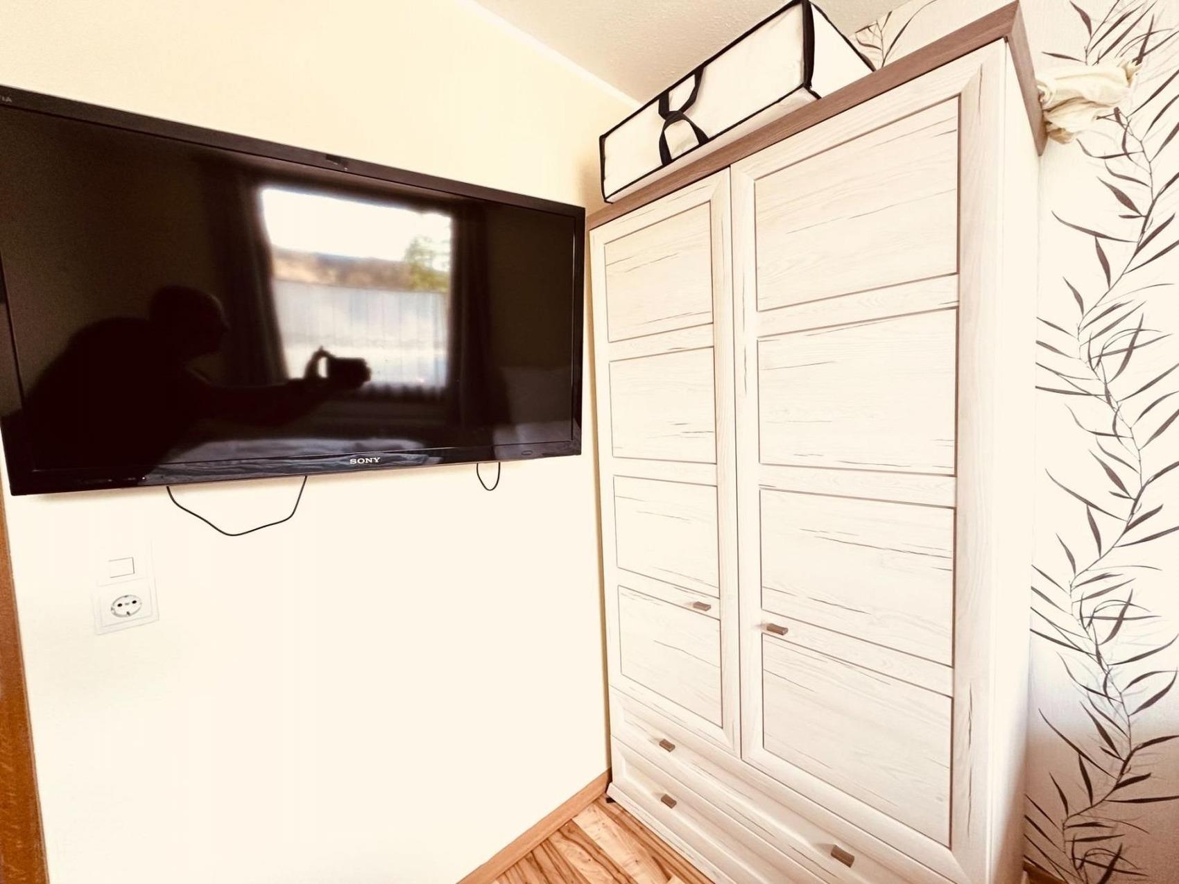Im Schlafzimmer wartet ein Boxspringbett (1,80m x 2,00m) und ein Einzelbett (0,90m x 2,00m) auf Euch. Ebenso ein Kleiderschrank und ein weiterer Smart TV.