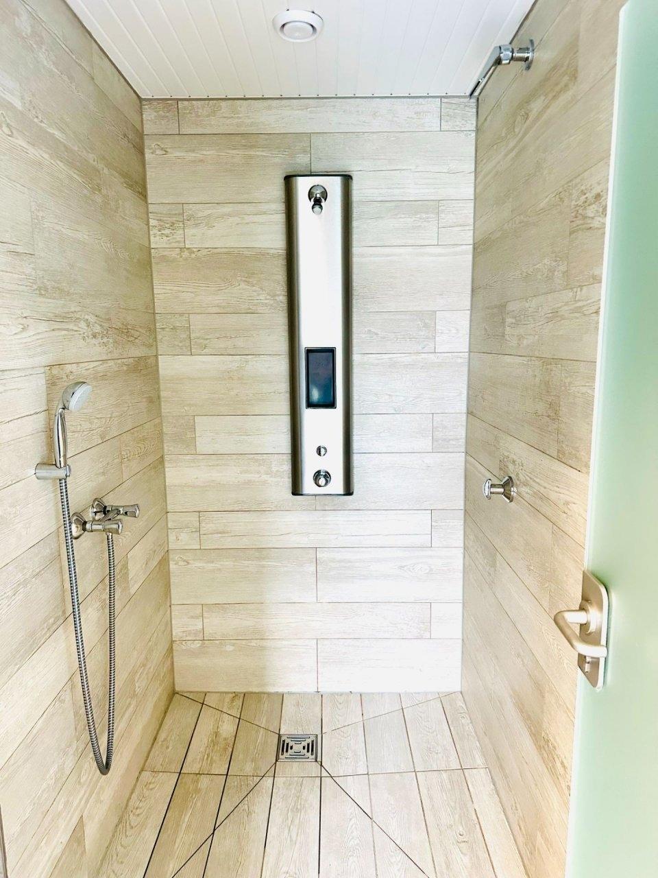 Das sehr geräumige Wohnzimmer hat ein supergemütliches Sofa und ein Schrankbett. Der 55 Zoll TV ist Smart. Hier könnt Ihr natürlich auch Apps auf dem TV nutzen (Mediatheken, YouTube etc.). Schlafen könnt ihr im Wohnzimmer auf einem vollwertigen, ausklappbaren Schrankbett mit 1,60m x 2,00m.