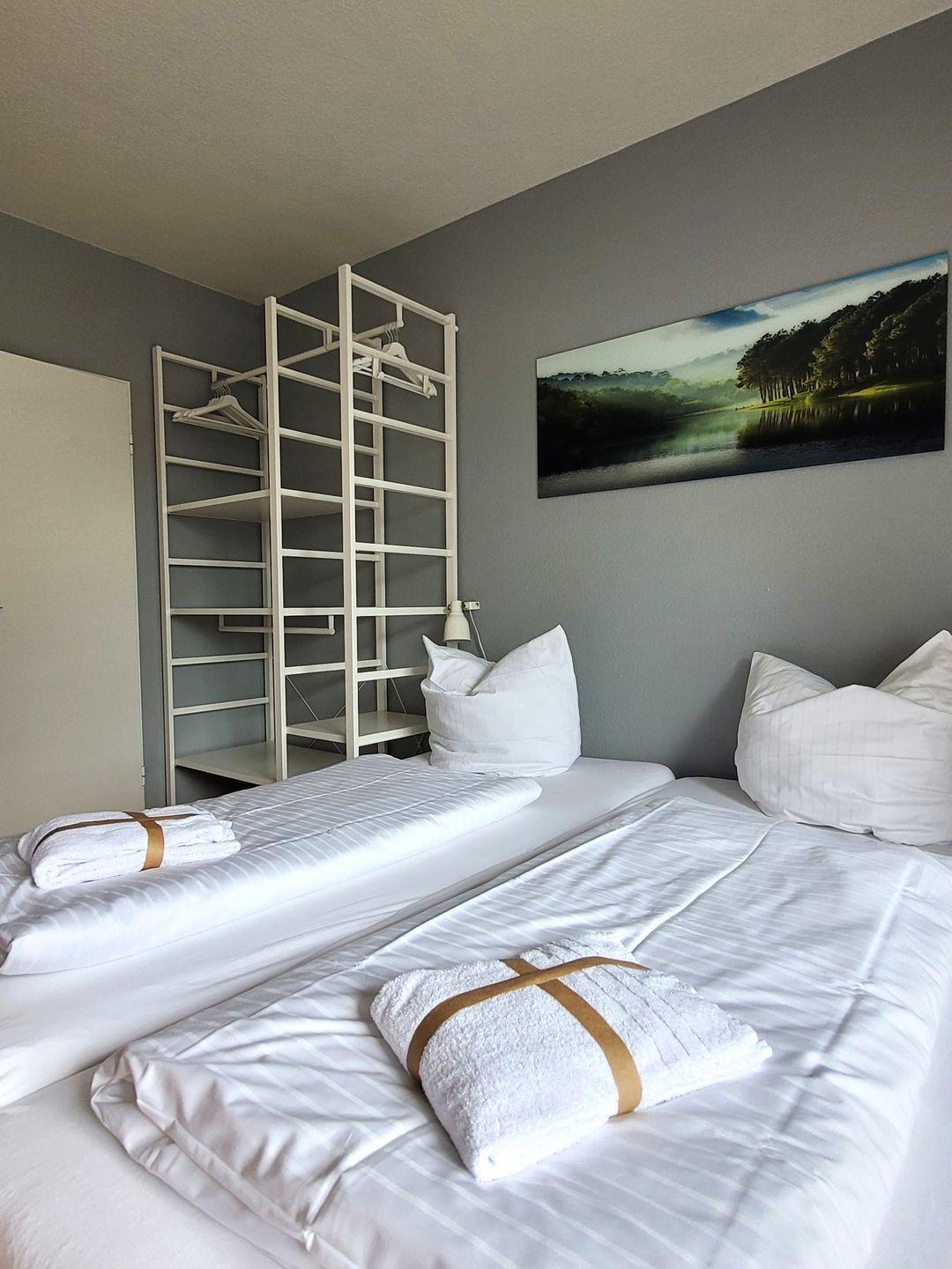 Insgesamt ca. 76 m² Wohnfläche verteilen sich auf eine großzügige Diele, ein Bad mit Dusche/WC/Waschtisch, einen Wohn-Essraum mit integrierter Küche und direktem Zugang auf den ersten Balkon sowie ein Schlafzimmer mit Doppelbett und Etagenbett mit direktem Zugang auf den zweiten Balkon. Für die 5. und 6. Person gibt es im Wohn-Essraum zwei bequeme Schlafmöglichkeiten.