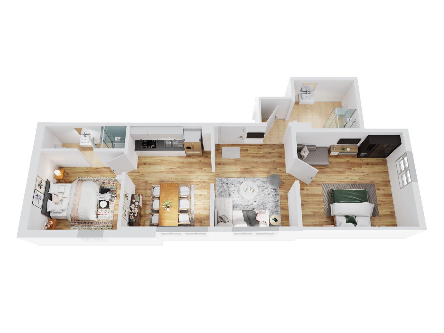 Die komplett renovierte und hochwertig ausgestattete 3-Zimmer Ferienwohnung mit 68m² im 2. OG verfügt über: