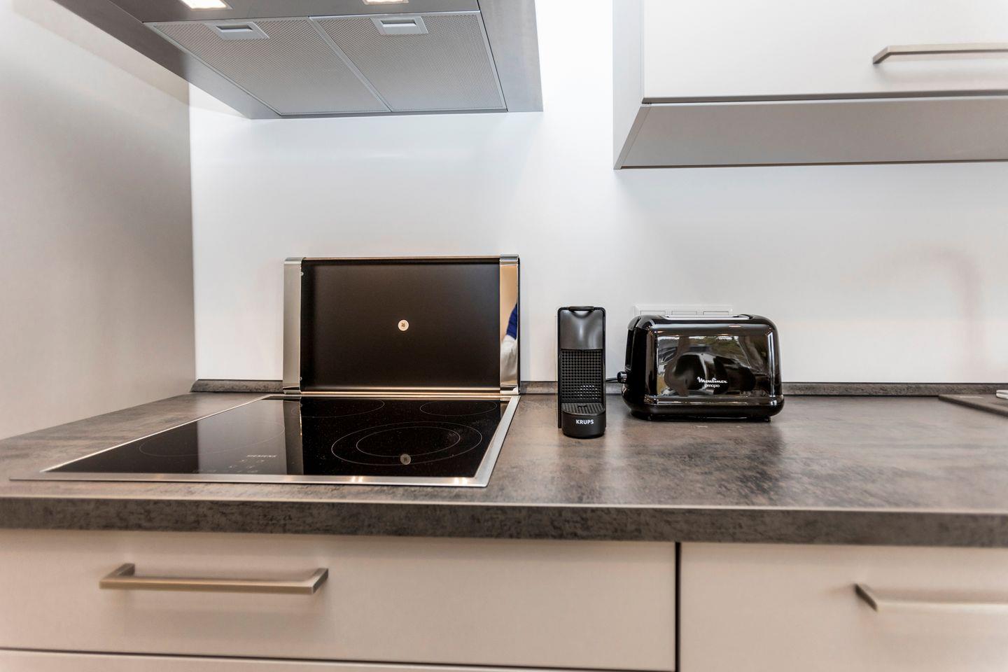 - Eine voll ausgestattete Küchenzeile mit Kühlschrank, einem vierflammigen Ceranfeld, Backofen, Spülmaschine, Nespresso-Kaffeemaschine inklusive Kapseln für den Ankunftstag, Wasserkocher mit einer erlesenen Auswahl an Teesorten und einem Toaster.