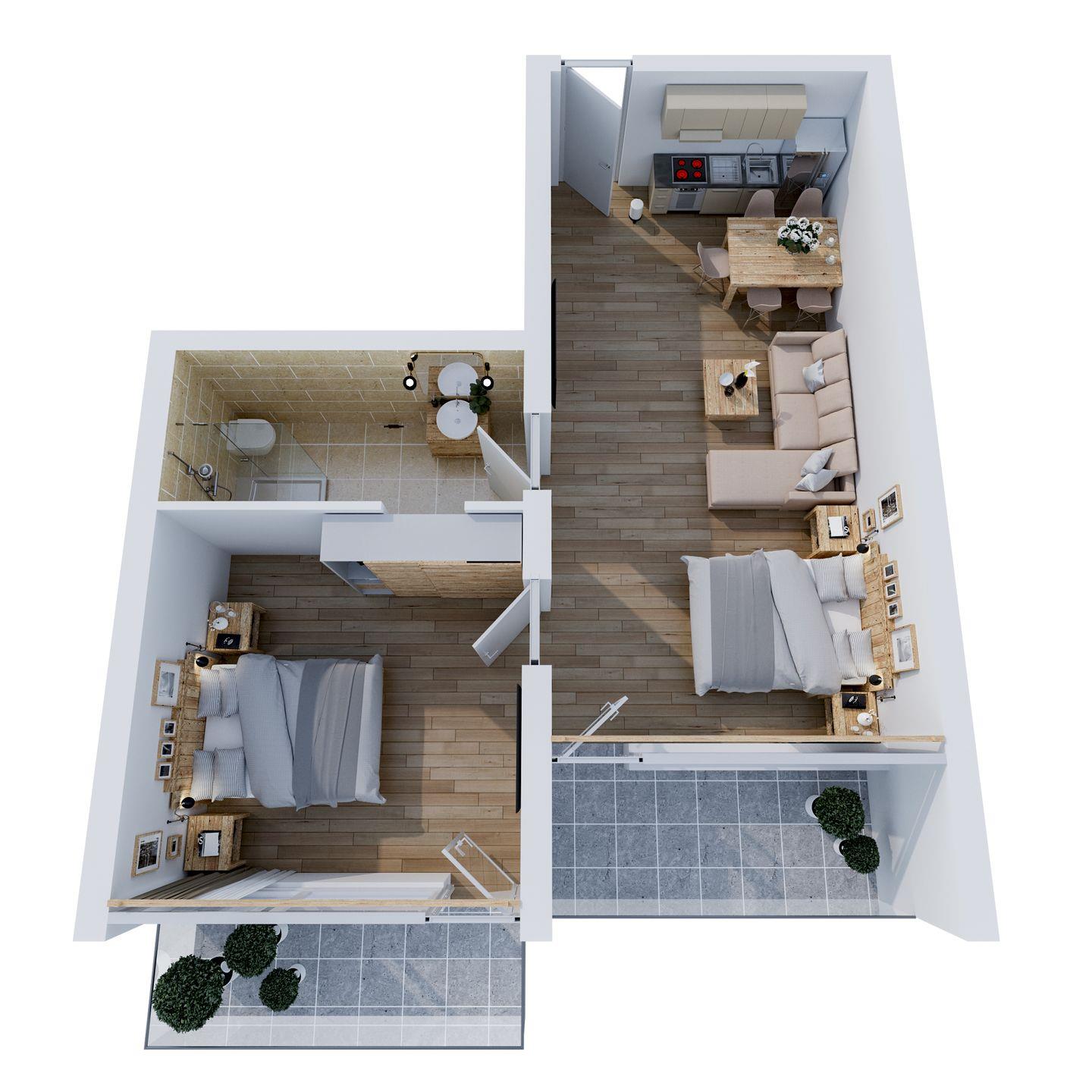 - Einen großzügigen Ess- und Wohnbereich mit Studiocharakter, der ein Doppelbett sowie ein bequemes, ausziehbares Schlafsofa bietet