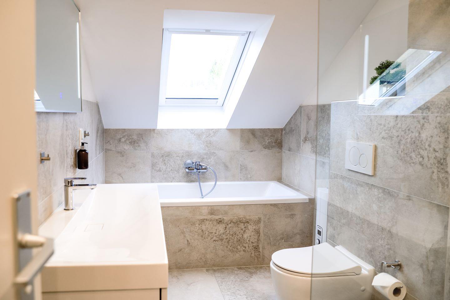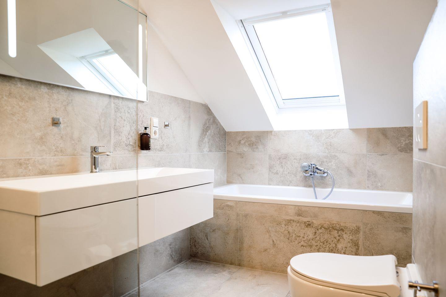 - Ein modernes Badezimmer mit einer Rainshower-Dusche und einer Badewanne, inklusive Föhn.