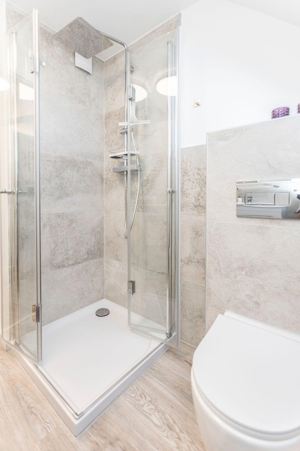 - Ein modernes Badezimmer mit einer Rainshower-Dusche, inklusive Föhn.