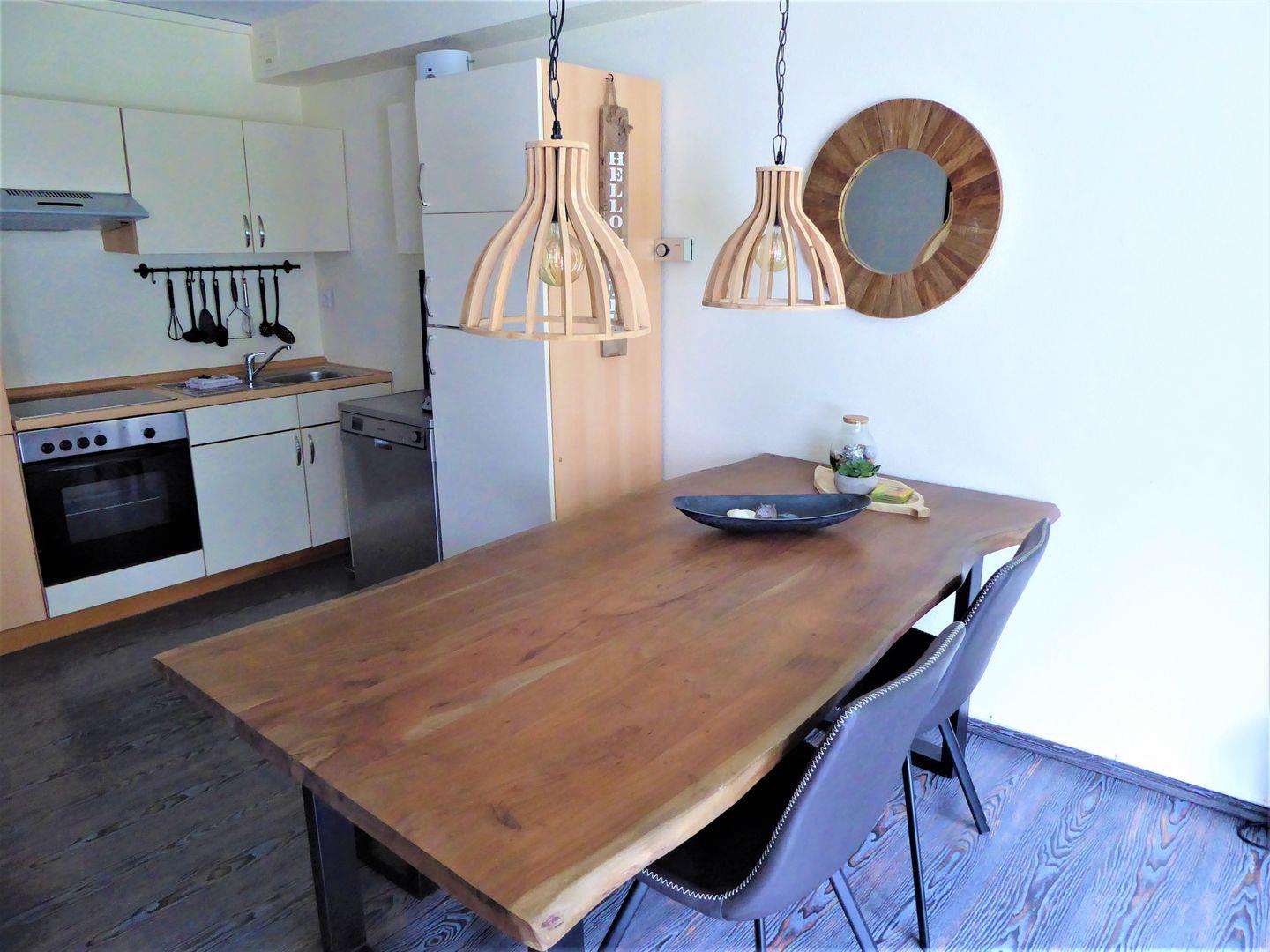 Der Wohnraum ist sehr gemütlich eingerichtet. Der offene Wohn Essbereich ist perfekt zum verweilen mit Freunden und Familie. Der Weg in die Stadt ist sehr kurz es liegt also an euch ob ihr Essen geht oder selber kocht. Dieses Apartment hat eine schöne Terrasse mit Blick in den Wald. Hier könnt ihr grillen und die Ruhe genießen. Die Wohnung ist mit allem wichtigen ausgestattete: Kaffeemaschine, Spülmaschine, Wasserkocher, Toaster uvm.