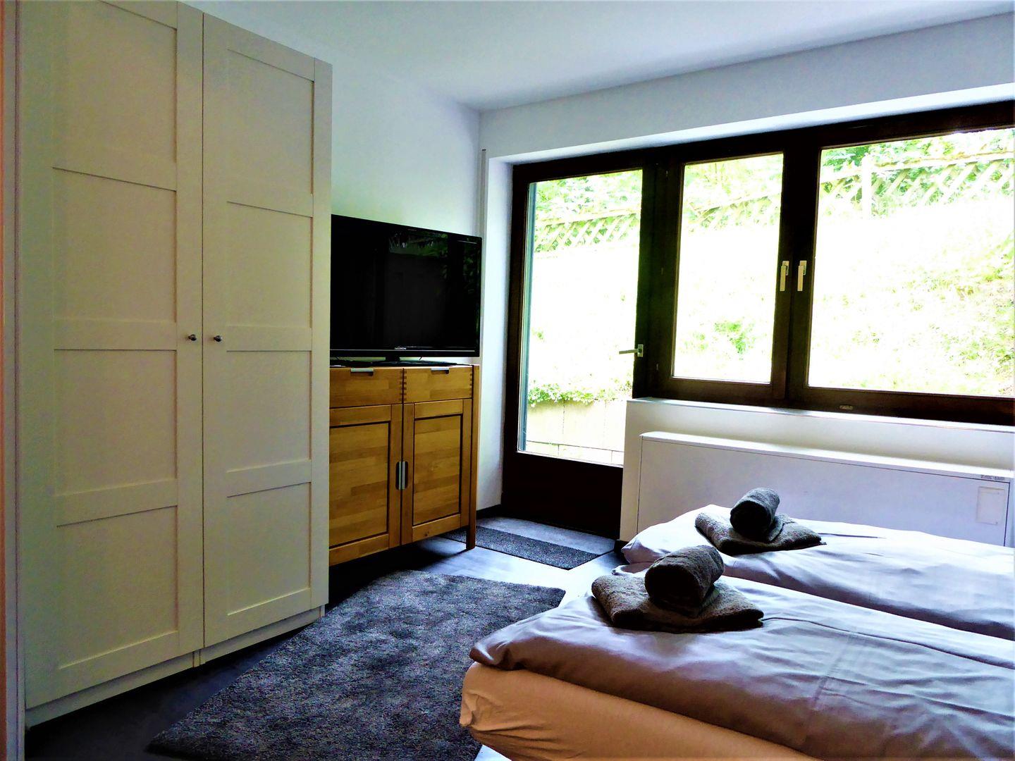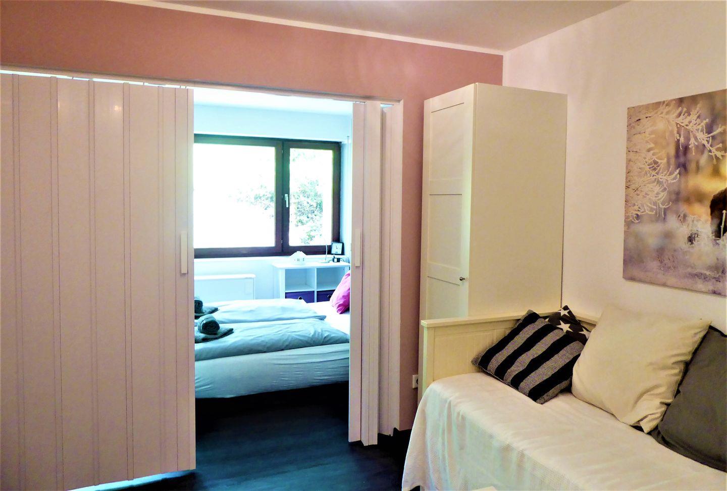 Das Apartment hat ein separates Schlafzimmer mit einem Doppelbett.