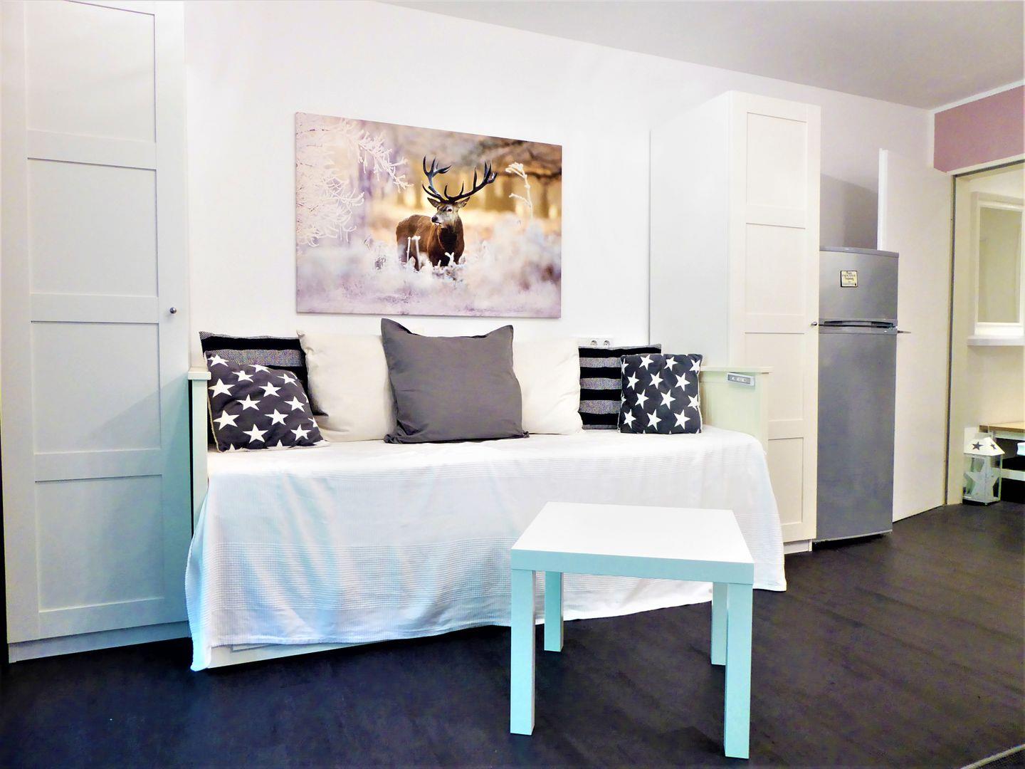 Im Wohnzimmer befindet sich ein weiteres Bett für 2 Personen welches ausgezogen werden kann für 2 weitere Schlafmöglichkeiten. Der Wohn Essbereich ist hell und großzügig. Vom Schlafzimmer aus erreicht man die kleine Terrasse mit angrenzenden Garten.
