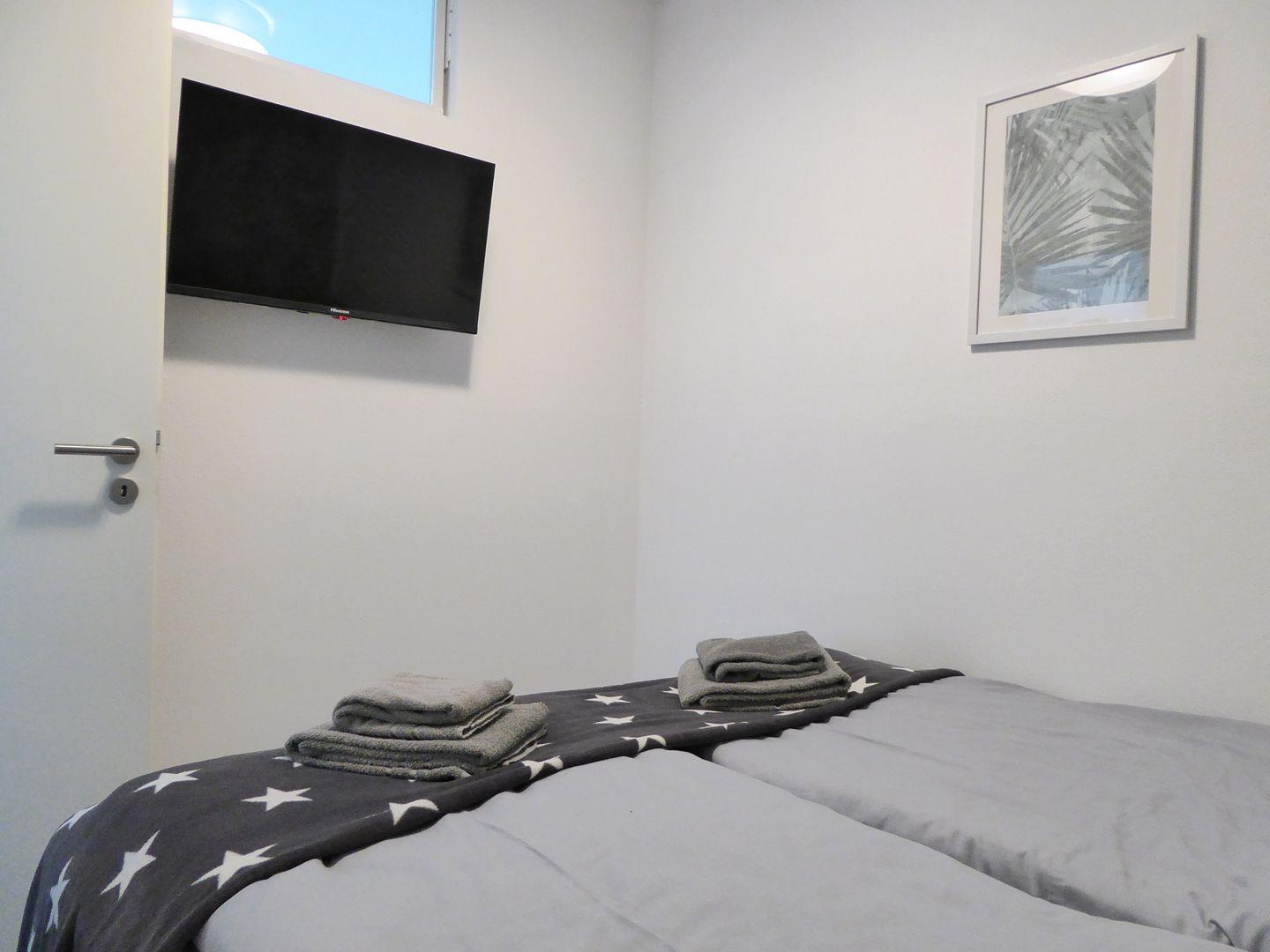 Die Betten sind entsprechend der gebuchten Personenanzahl immer frisch bezogen. Handtücher und Badetücher sind inklusive und vorhanden. Im vorderen Schlafzimmer befindet sich ein Smart TV. Im Wohnbereich befindet sich ein weiterer Smart Tv und eine Playstation 4 mit Controllern.