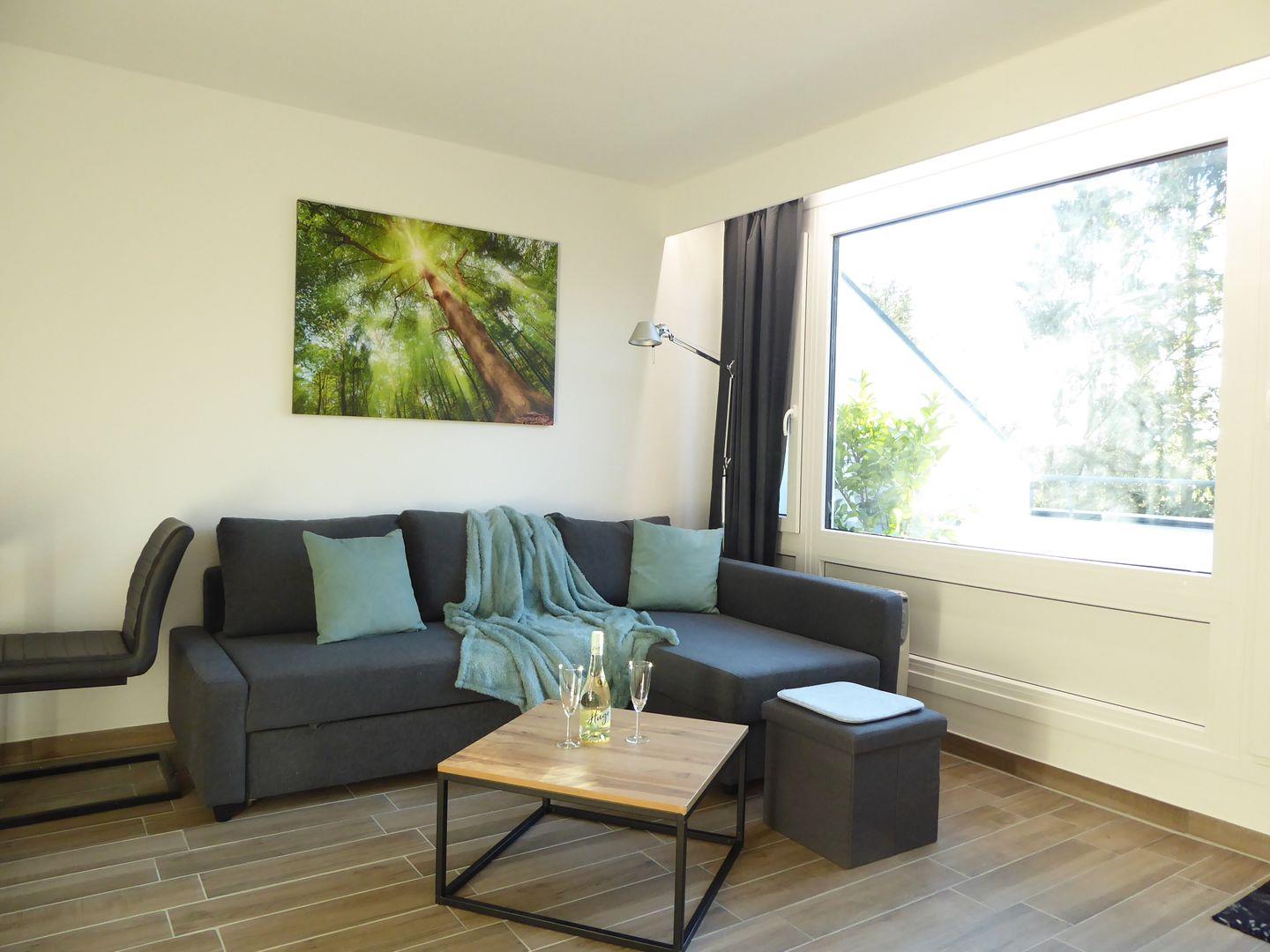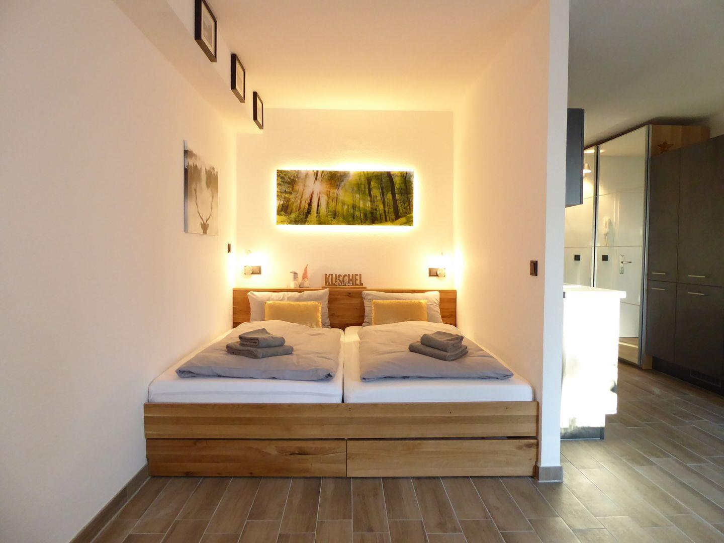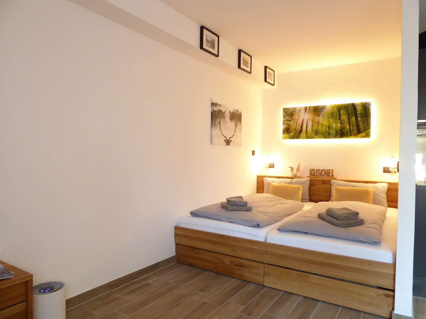 Das Apartment hat einen großen Schlaf und Wohnraum. Der Schlafbereich ist etwas abgetrennt. Hier schläft man auf einem 200 x 200cm großem Bett. Die Schlafcouch wird mit einem Topper bezogen und dient auch als Schlafplatz.