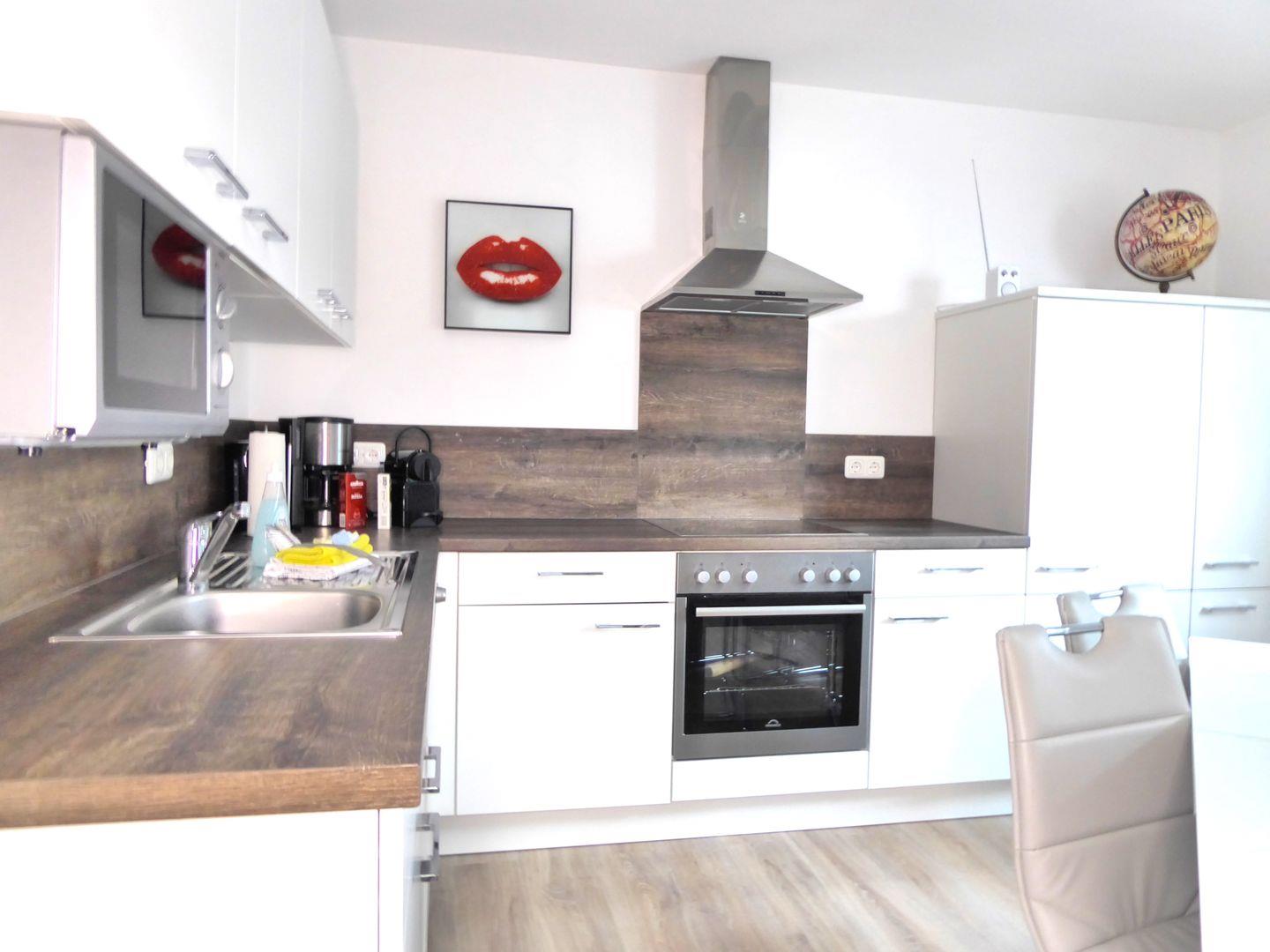 Die Küche ist vollausgestattet. Ihr verfügt über eine normale Kaffeemaschine, Toaster, Wasserkocher, Herd und eine Spülmaschine. Wir haben ein kleine Willkommenspaket für euch bereit gestellt darin befinden sich Kaffee Tee, Milch, Zucker.