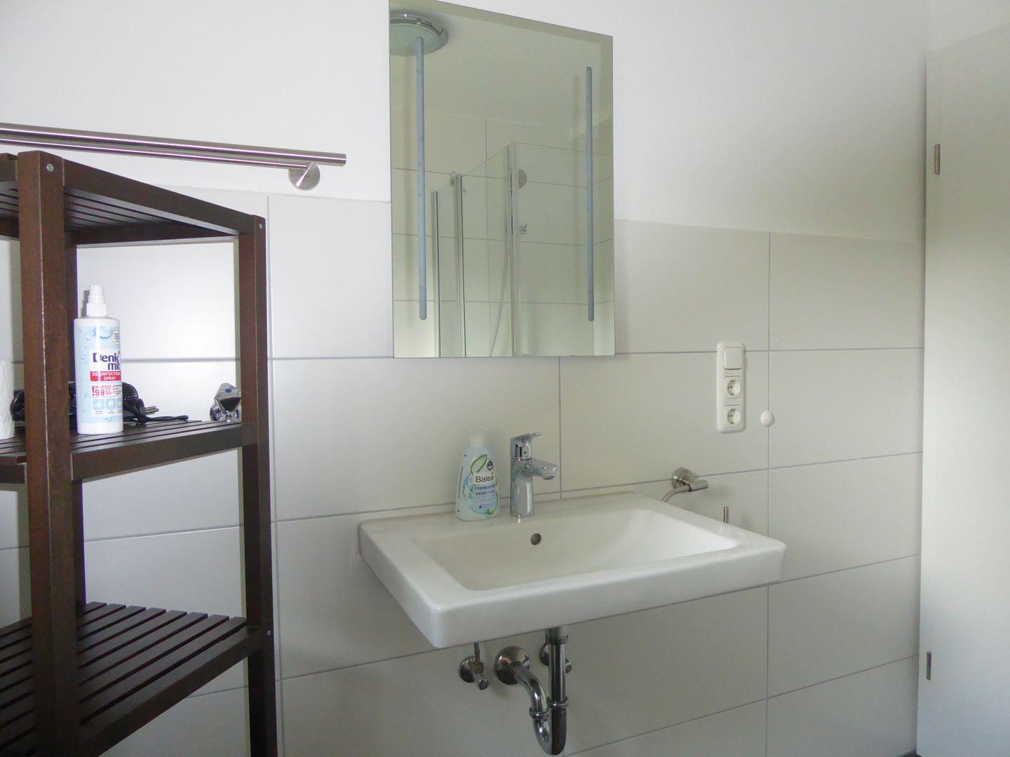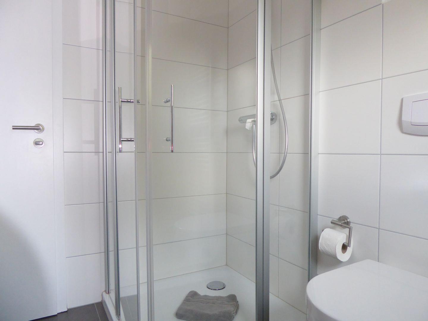 Das Badezimmer ist komplett gefliest und verfügt über eine Dusche, ein WC und ein Waschbecken.