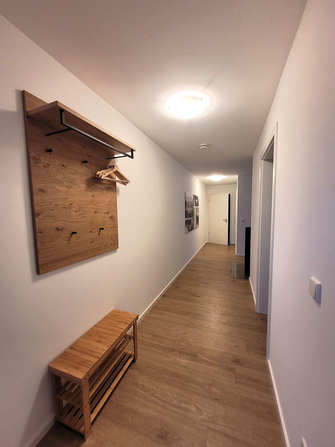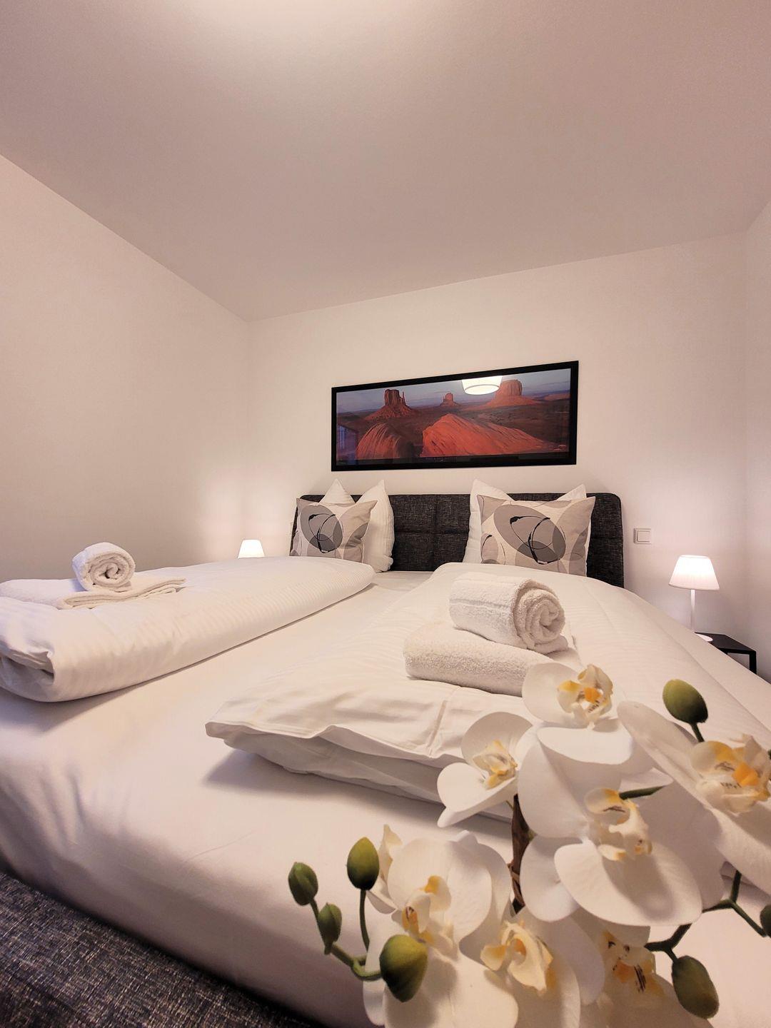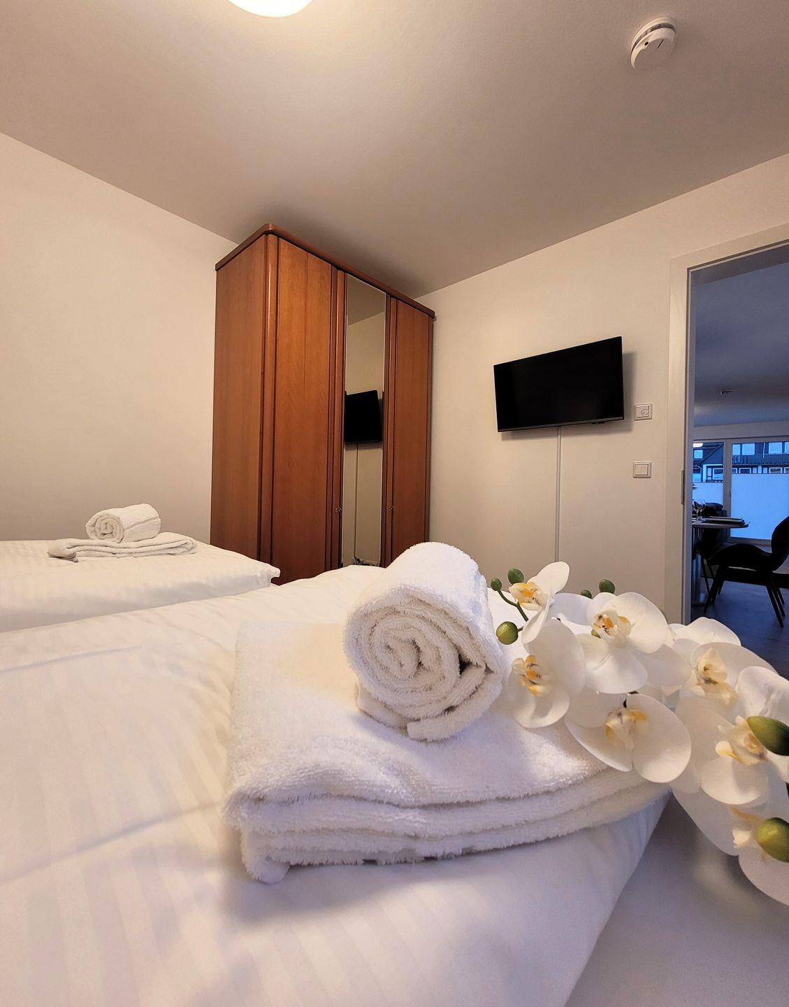 Insgesamt ca. 110 m² Wohnfläche verteilen sich auf eine Diele, ein sehr großes Wohnzimmer mit Fernseher, einer offenen, perfekt eingerichteten Küche mit großem Esstisch und einem bequemen Schlafsofa für die 5. und 6. Person, ein geschmackvolles Schlafzimmer mit Doppelbett und Fernseher und ein weiteres schönes Schlafzimmer mit zwei Einzelbetten und ebenfalls einem Fernseher. Bei allen Betten handelt es sich um Boxspringbetten. Alle Fernseher haben Netflix-Empfang. Des Weiteren gehört ein großzügiges Badezimmer zur Wohnung, in dem sich auch noch eine Infrarotkabine für 2 Personen und eine Waschmaschine befinden. Vom Wohnzimmer aus haben Sie einen Zugang zum großen Balkon, welcher außerhalb der Wintersaison mit Gartenmöbeln bestückt ist.