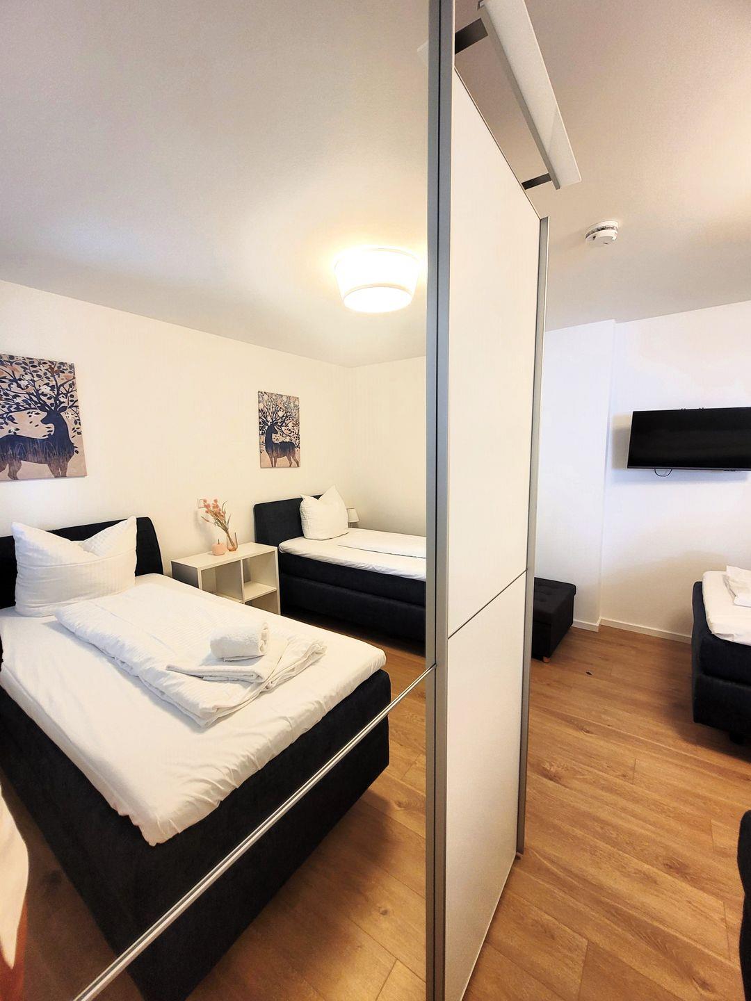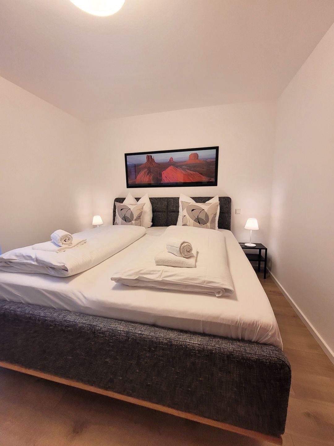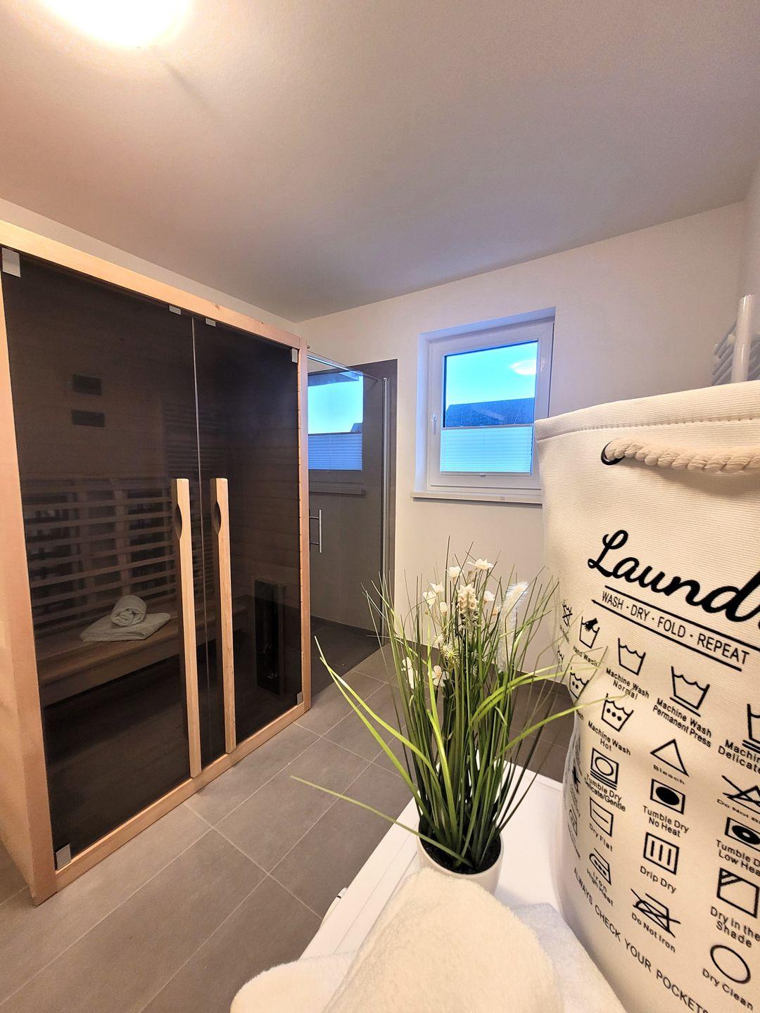Insgesamt ca. 110 m² Wohnfläche verteilen sich auf eine Diele, ein sehr großes Wohnzimmer mit Fernseher, einer offenen, perfekt eingerichteten Küche mit großem Esstisch und einem bequemen Schlafsofa für die 5. und 6. Person, ein geschmackvolles Schlafzimmer mit Doppelbett und Fernseher und ein weiteres schönes Schlafzimmer mit zwei Einzelbetten und ebenfalls einem Fernseher. Bei allen Betten handelt es sich um Boxspringbetten. Alle Fernseher haben Netflix-Empfang. Des Weiteren gehört ein großzügiges Badezimmer zur Wohnung, in dem sich auch noch eine Infrarotkabine für 2 Personen und eine Waschmaschine befinden. Vom Wohnzimmer aus haben Sie einen Zugang zum großen Balkon, welcher außerhalb der Wintersaison mit Gartenmöbeln bestückt ist.