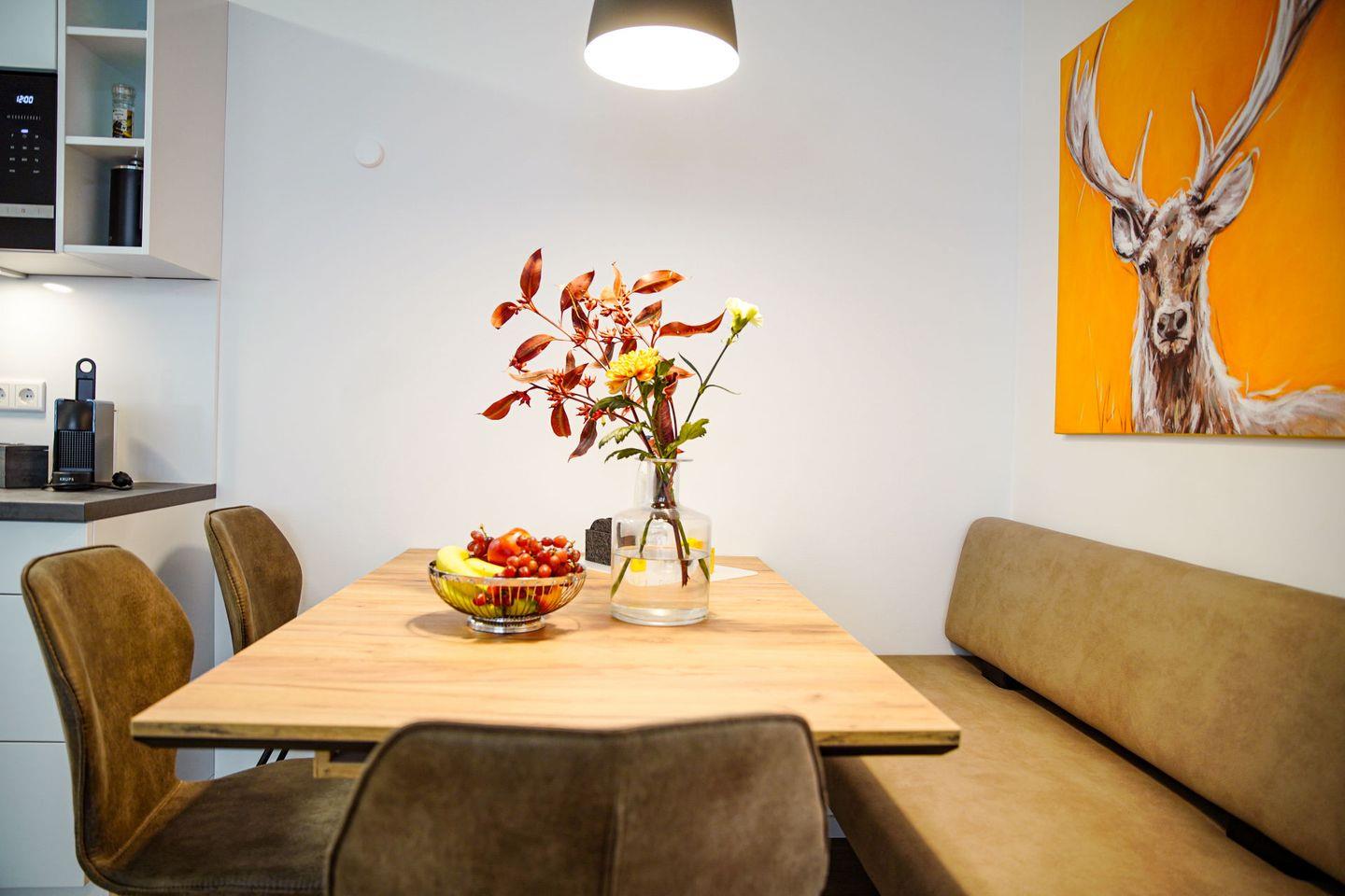 - Geräumiges Wohnzimmer mit Essbereich und einer gemütlichen Einrichtung sowie Schlafsofa und Magenta-TV