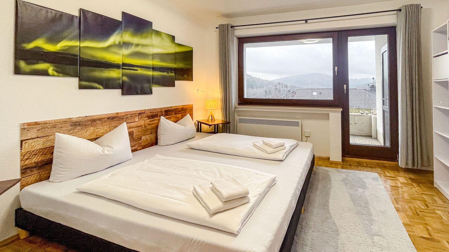 - Ein Schlafzimmer mit einem Doppelbett und Kleiderschrank