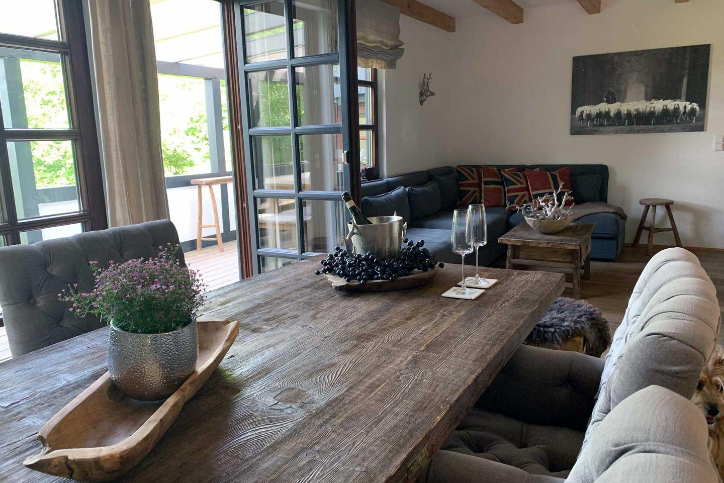 Die Romantikhütte beherbergt 2-6 Personen auf ca. 96 m² Wohnfläche. Vom Wohn-Esszimmer mit seinen bis zu 6 Meter hohen Decken gelangt man auf eine große überdachte Terrasse, die man auch bei kühlerem Wetter gut nutzen kann. In der wärmeren Jahreszeit lässt es sich hier wunderbar frühstücken – Panoramablick inklusive. Die schöne Echtholzküche mit Kochinsel bietet alles, was man für das gemeinsame Kochen benötigt. Der Garten ist perfekt um zu zweit oder mit Familie und Freunden zu grillen.