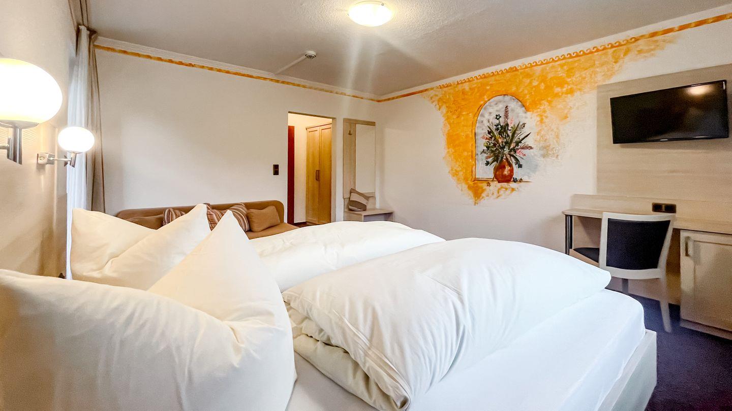 Herzlich willkommen in unserem charmanten Zimmer, das perfekt für drei Personen geeignet ist. Mit einer großzügigen Fläche von 28 qm bietet es viel Raum zum Entspannen und Wohlfühlen. Ausgestattet mit einem bequemen Doppelbett sorgt es für eine erholsame Nachtruhe. Zudem gibt es ein komfortables Einzelbett/Sofa. Ein moderner Fernseher steht Ihnen zur Verfügung, um Ihre Lieblingssendungen zu genießen. Ein Balkon ist vorhanden.