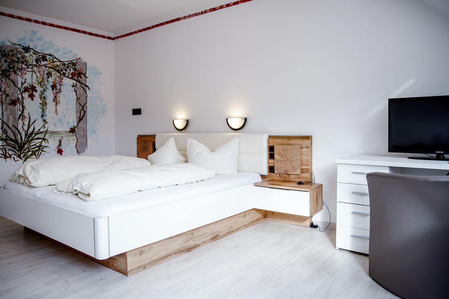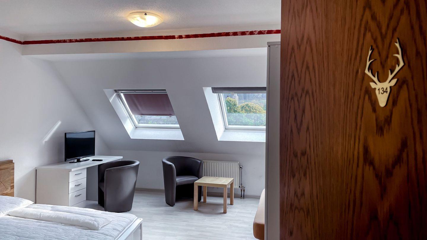 Herzlich willkommen in unserem charmanten Zimmer, das perfekt für drei Personen geeignet ist. Mit einer großzügigen Fläche von 28 qm bietet es viel Raum zum Entspannen und Wohlfühlen. Ausgestattet mit einem bequemen Doppelbett sorgt es für eine erholsame Nachtruhe. Zudem gibt es ein komfortables Einzelbett/Sofa. Zudem ist das Zimmer um ein Raum mit einem Doppelbett erweiterbar. (ohne eigenes Bad) Ein moderner Fernseher steht Ihnen zur Verfügung, um Ihre Lieblingssendungen zu genießen. Ein Balkon ist vorhanden.