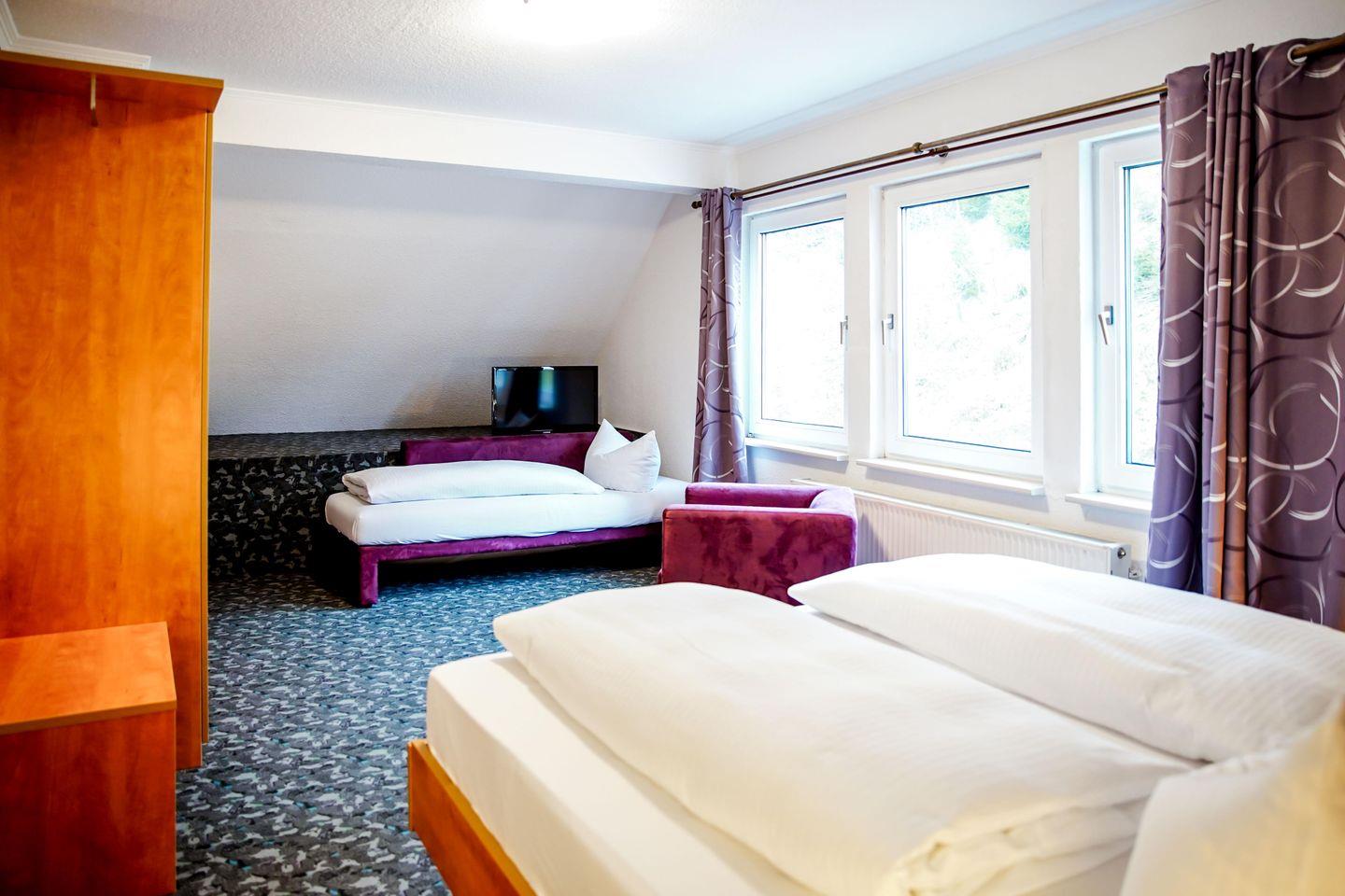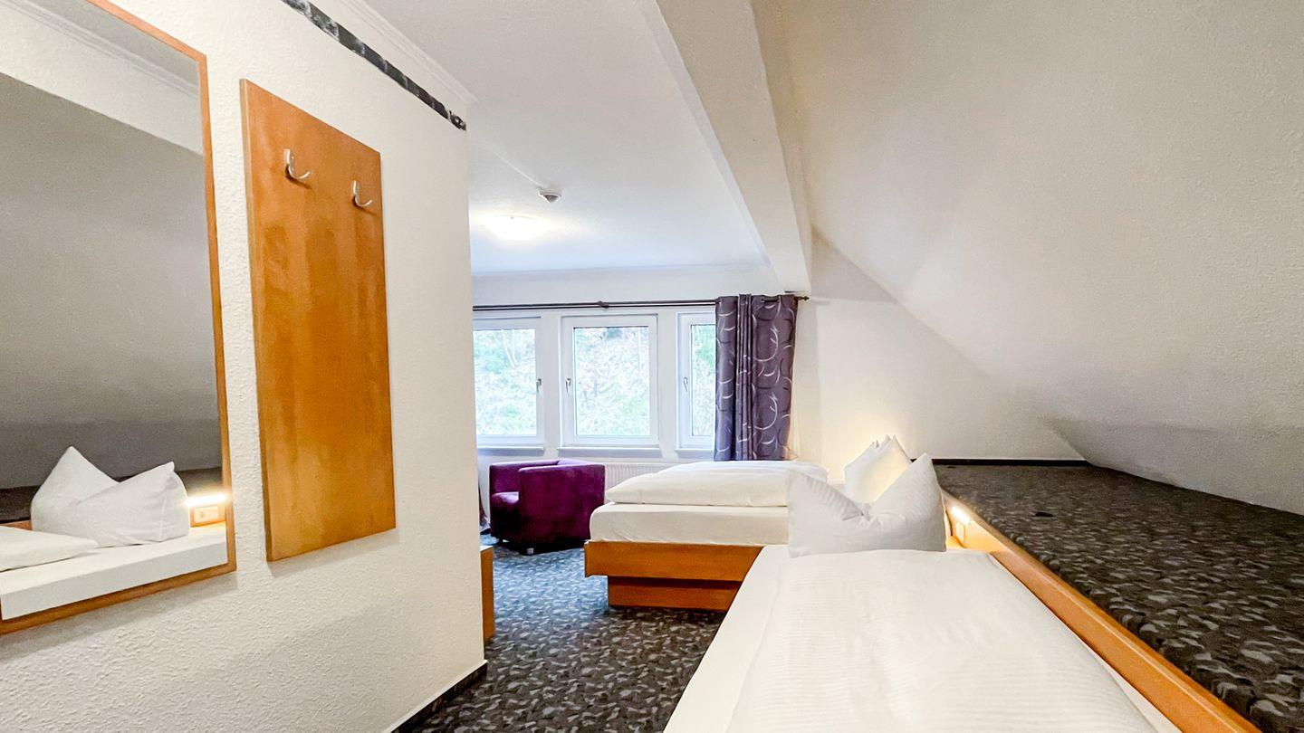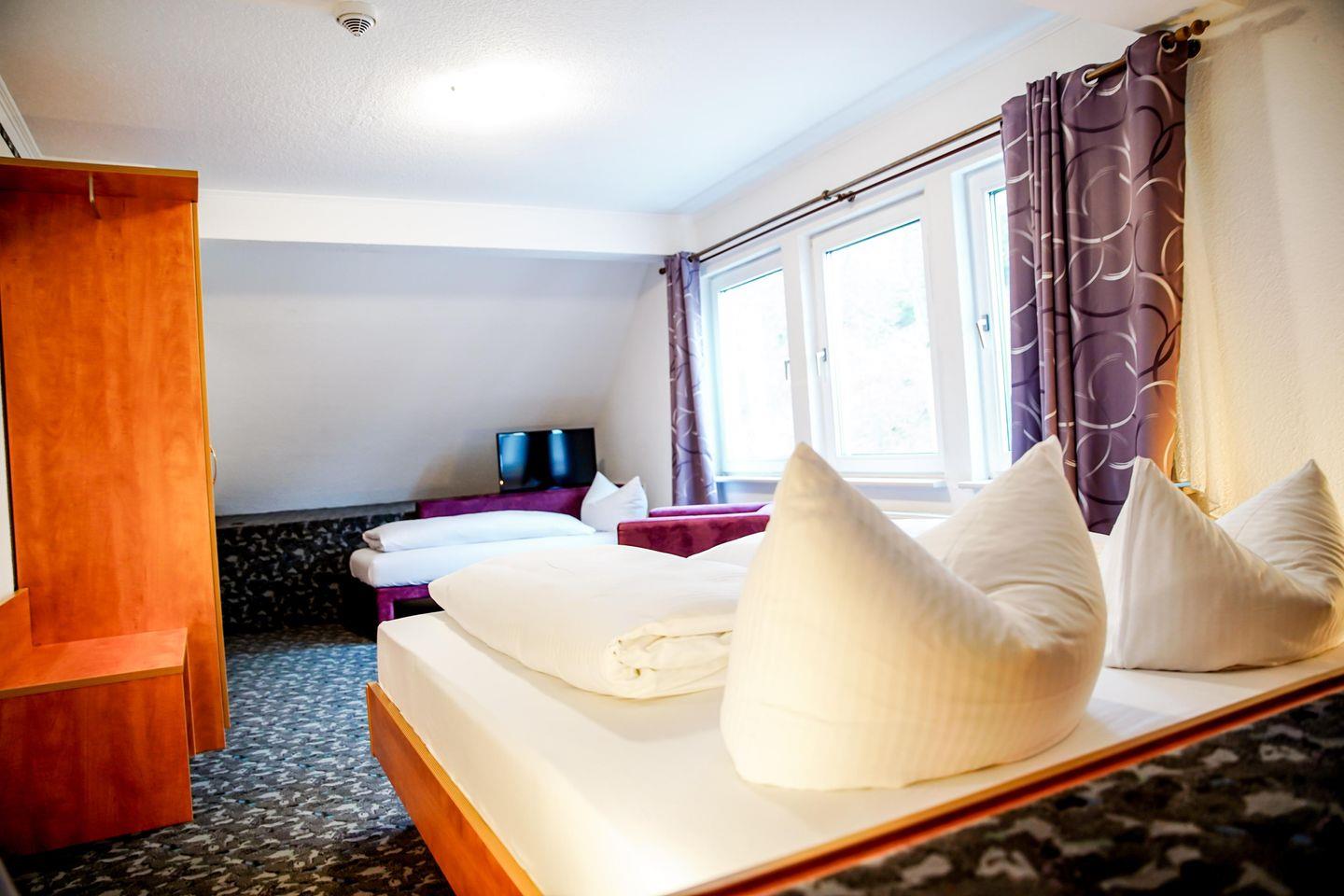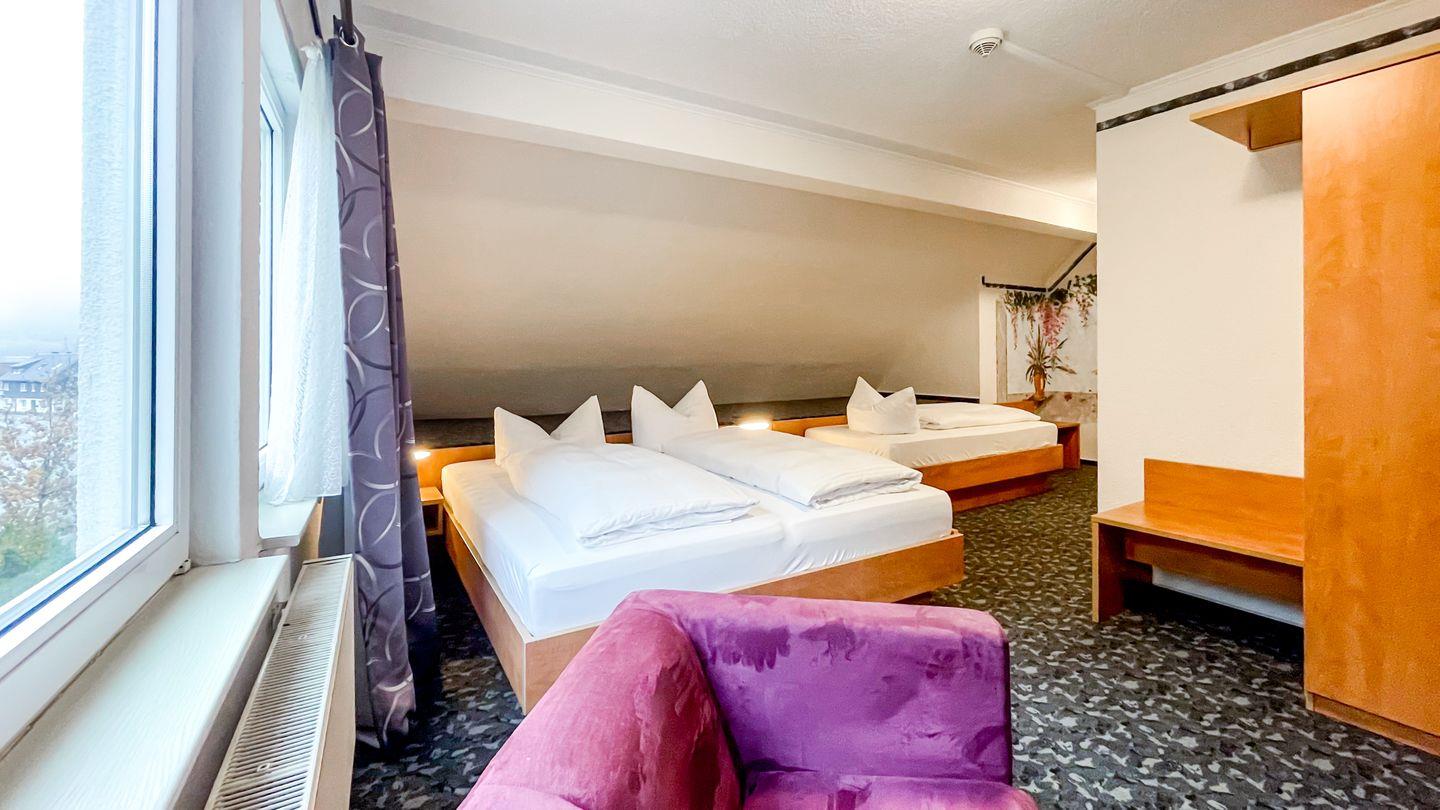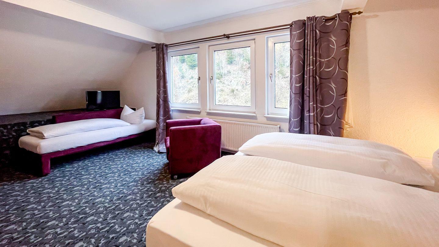 Willkommen in unserem charmanten Zimmer für bis zu vier Personen! Mit 42 qm bietet es ausreichend Platz zum Entspannen. Es verfügt über ein komfortables Doppelbett, einem Einzelbett, einem Schlafsofa, sowie einen modernen Fernseher.