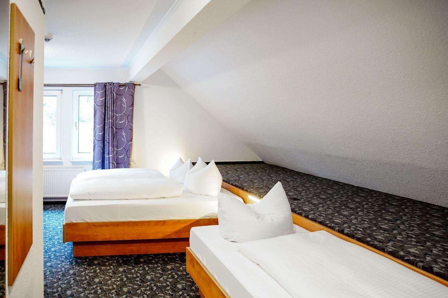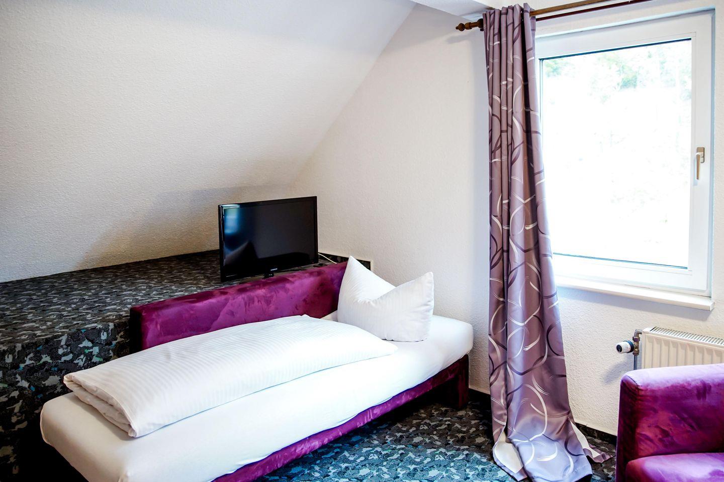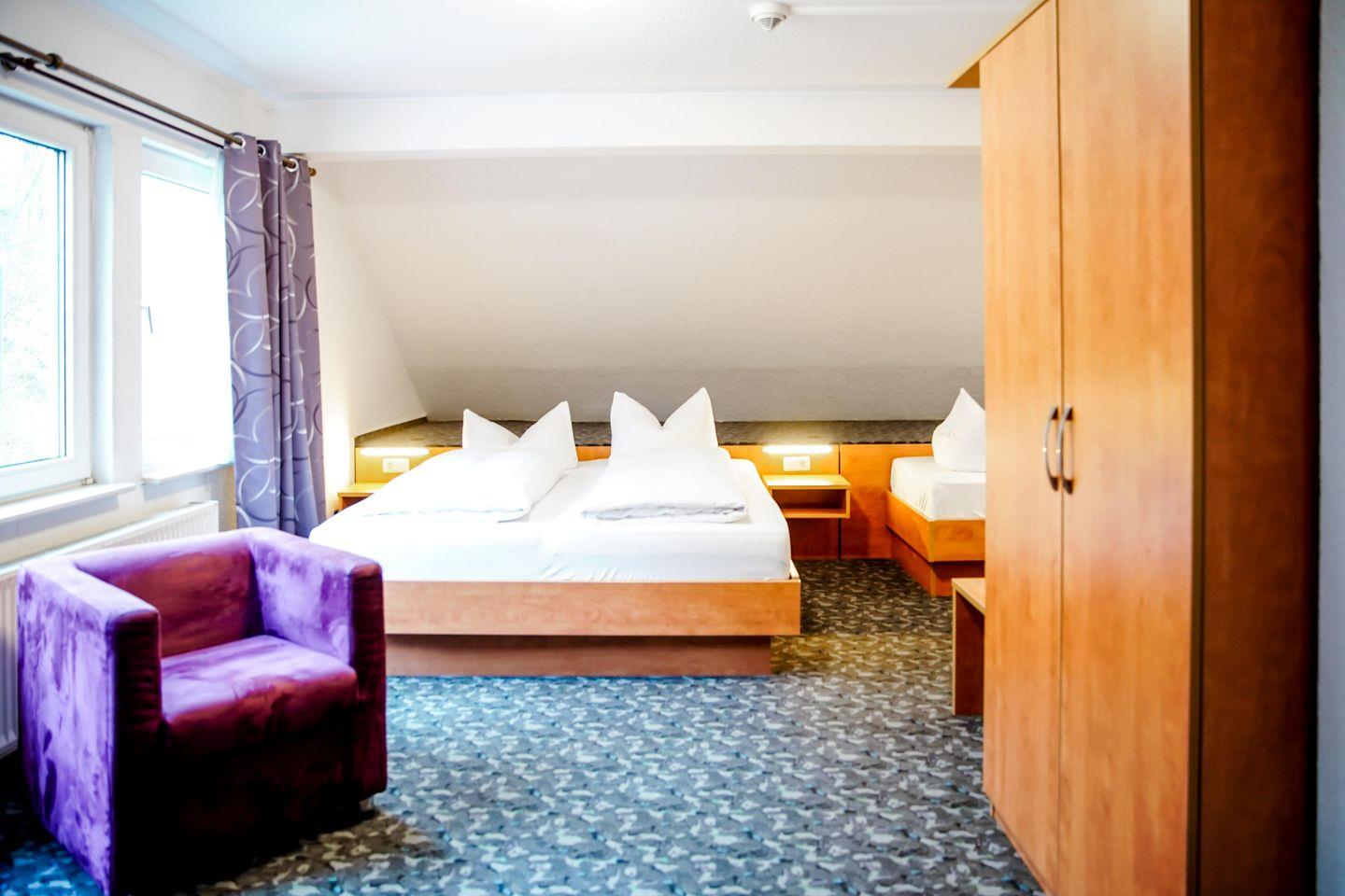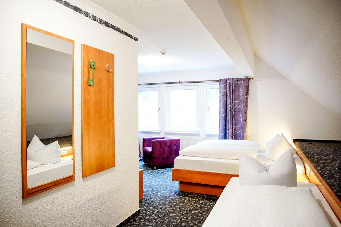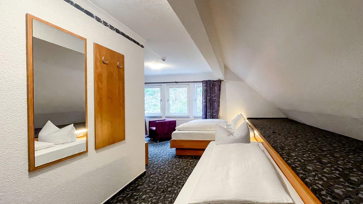 Willkommen in unserem charmanten Zimmer für bis zu vier Personen! Mit 42 qm bietet es ausreichend Platz zum Entspannen. Es verfügt über ein komfortables Doppelbett, einem Einzelbett, einem Schlafsofa, sowie einen modernen Fernseher.