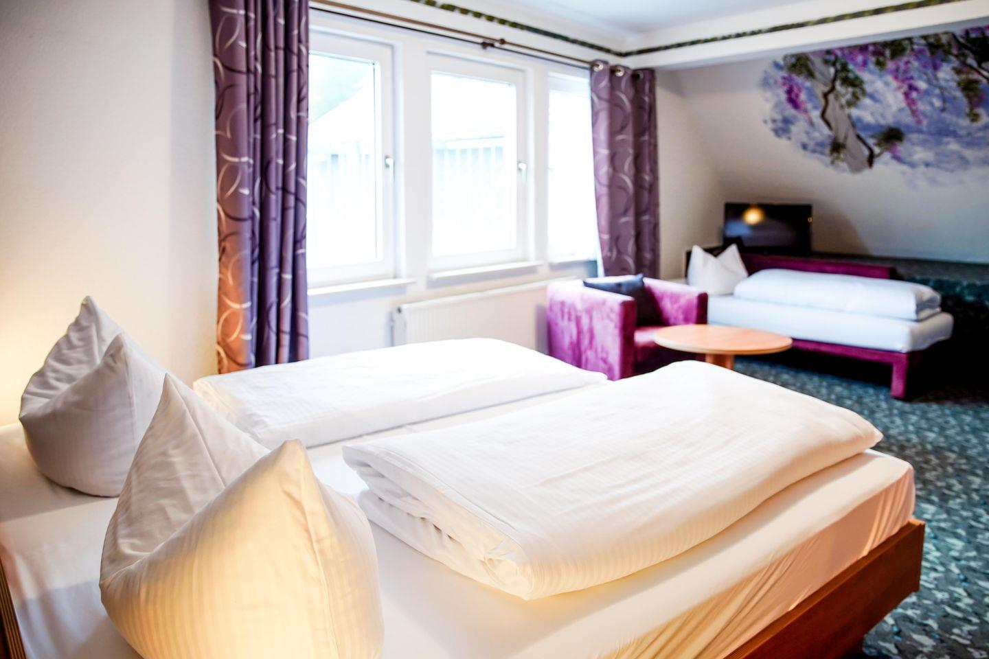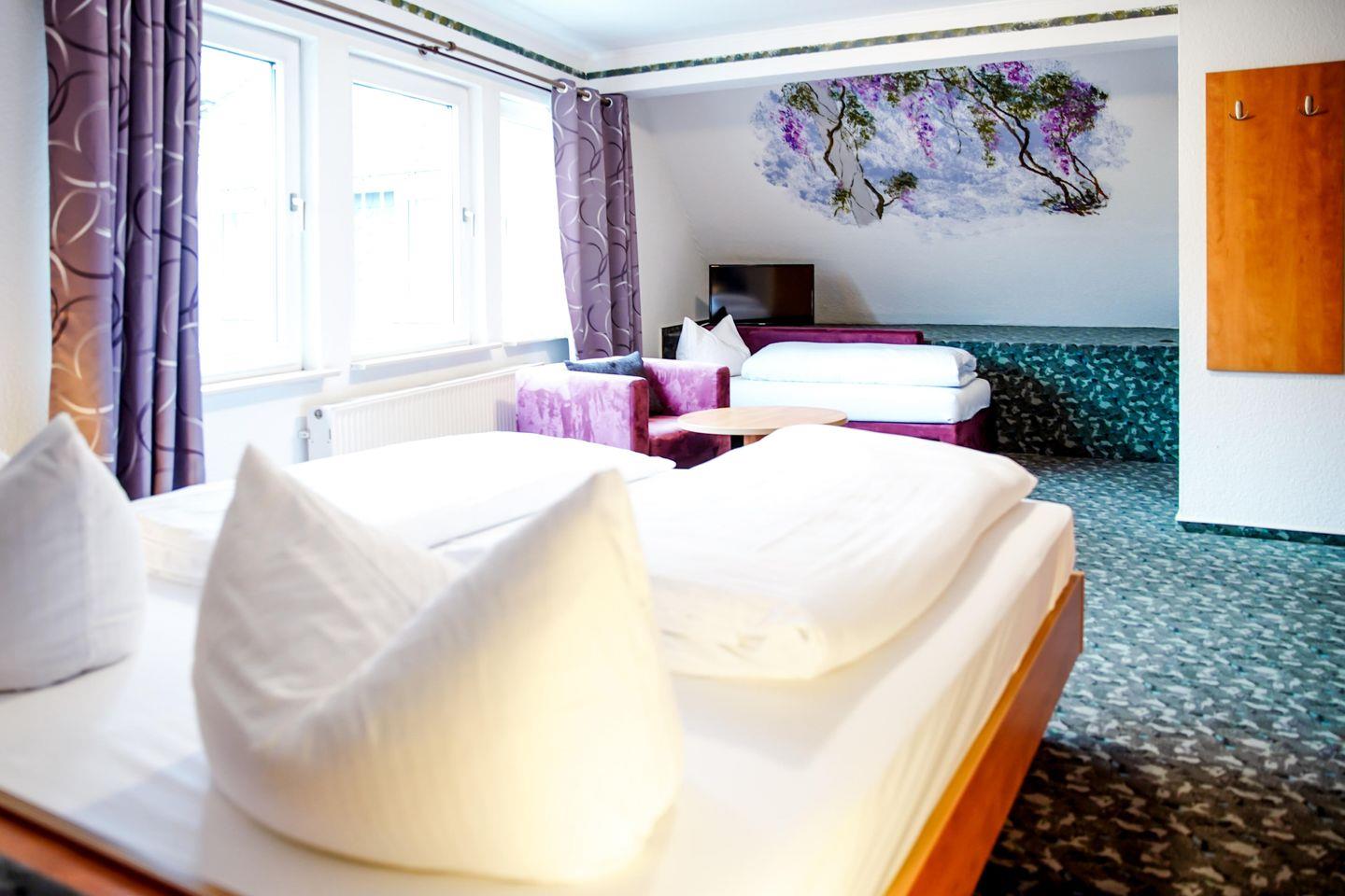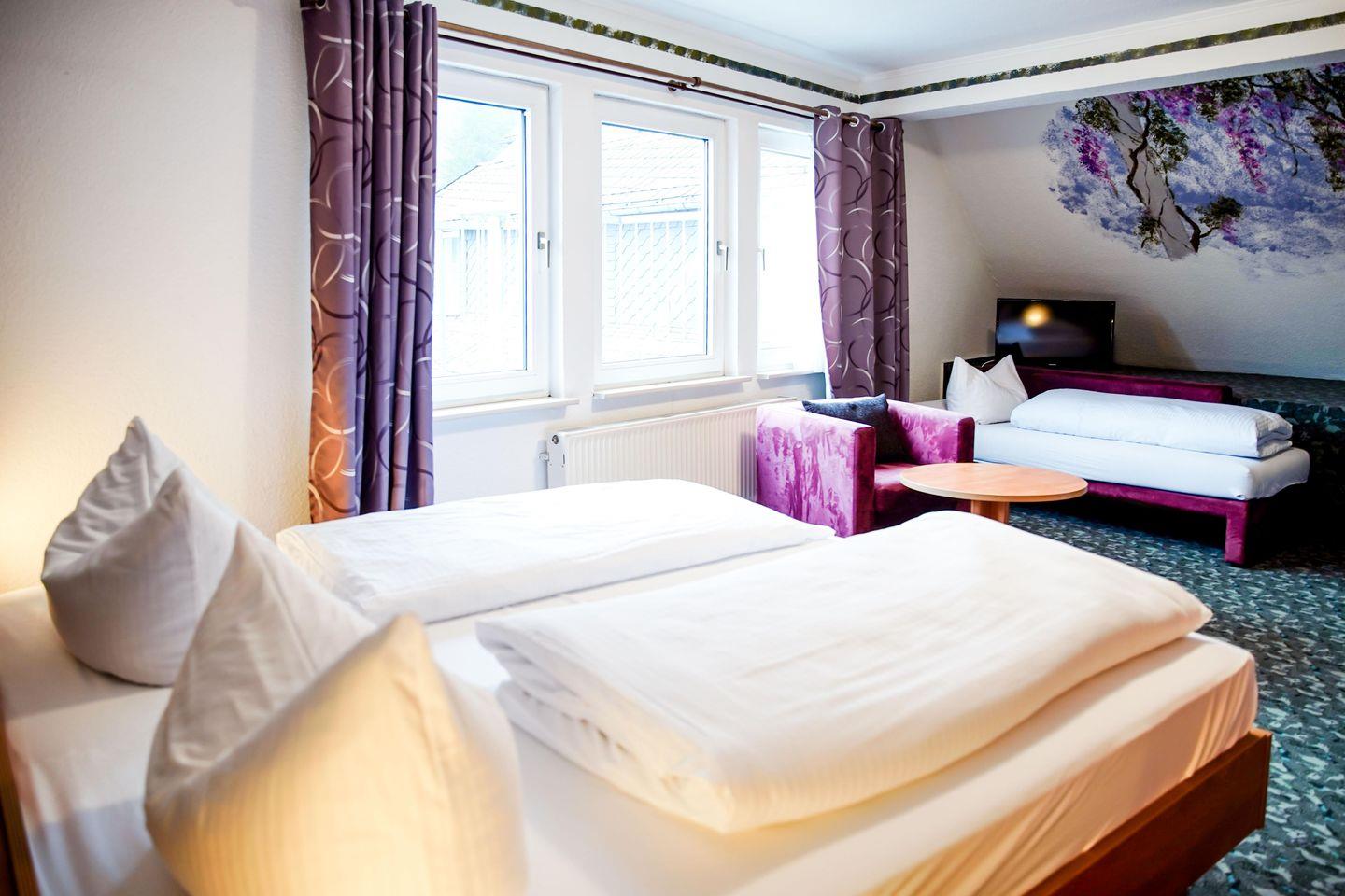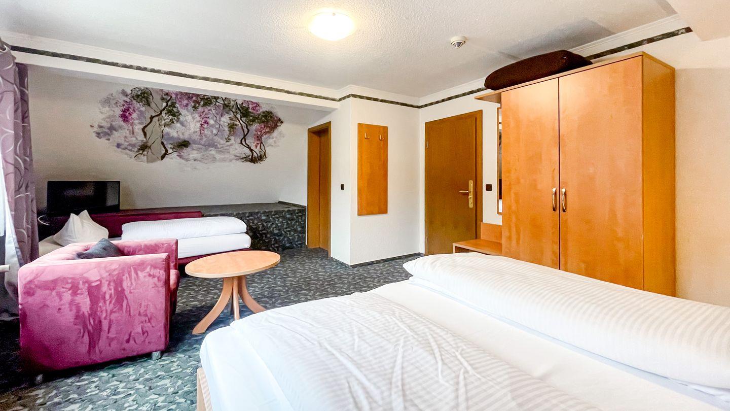Willkommen in unserem charmanten Zimmer für bis zu drei Personen! Mit 35 qm bietet es ausreichend Platz zum Entspannen. Es verfügt über ein komfortables Doppelbett, einem Einzelbett, einem Schlafsofa, sowie einen modernen Fernseher.