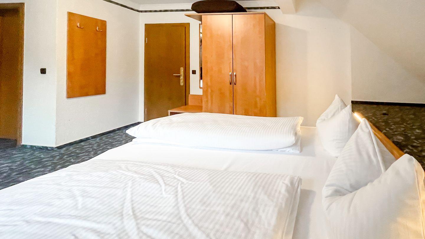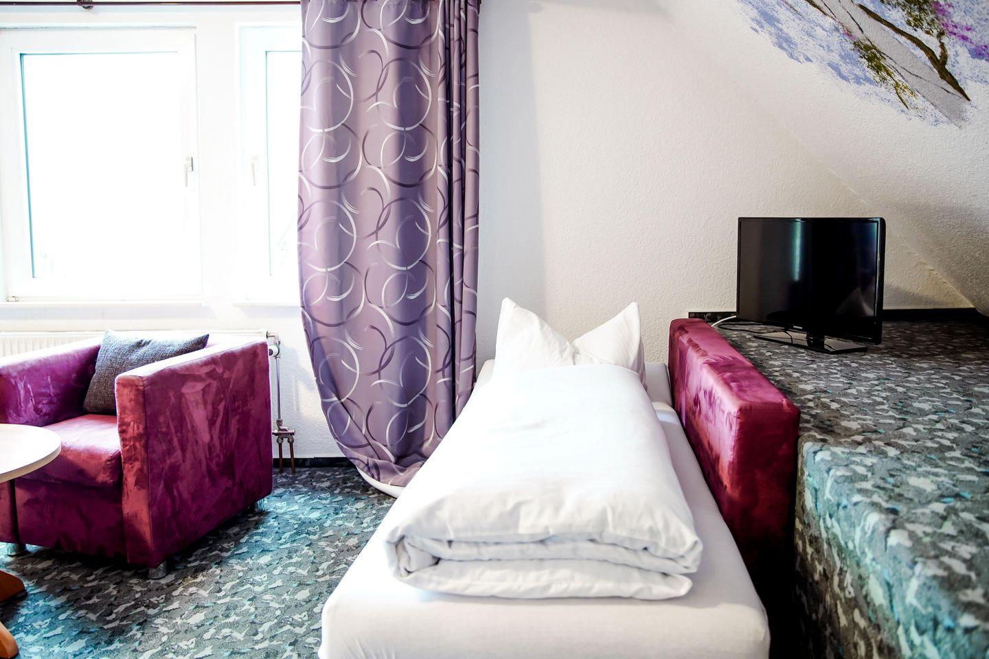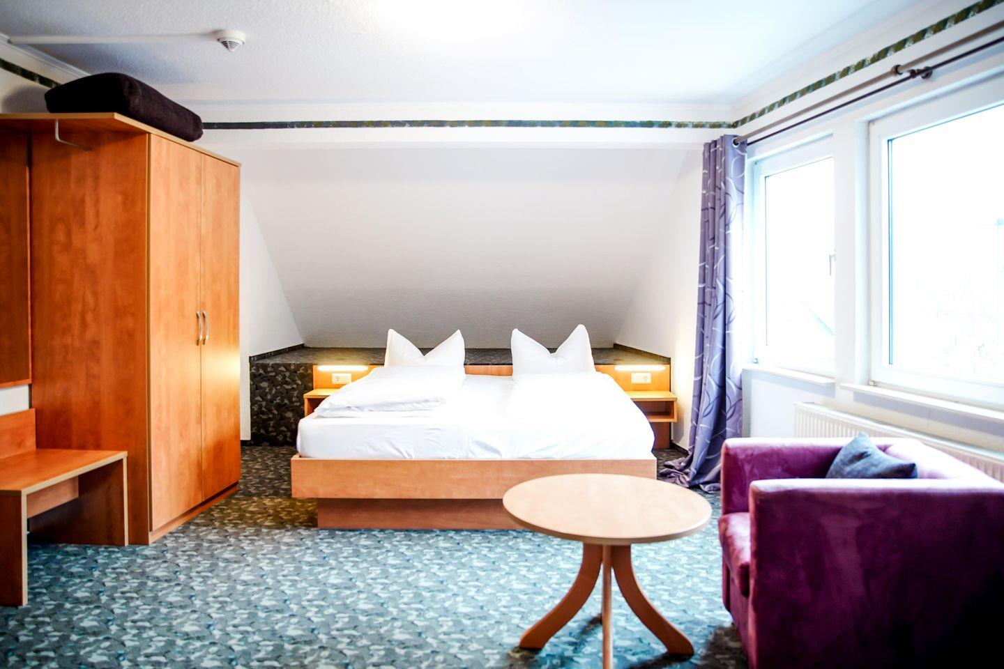 Willkommen in unserem charmanten Zimmer für bis zu drei Personen! Mit 35 qm bietet es ausreichend Platz zum Entspannen. Es verfügt über ein komfortables Doppelbett, einem Einzelbett, einem Schlafsofa, sowie einen modernen Fernseher.