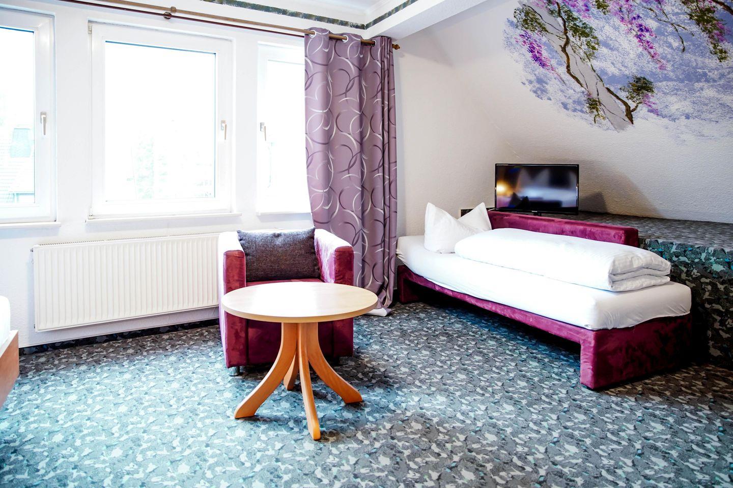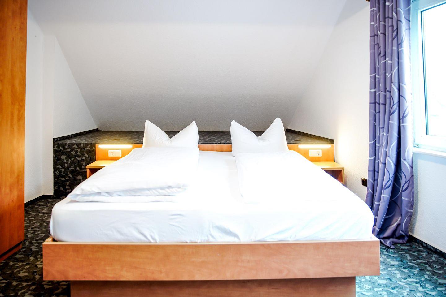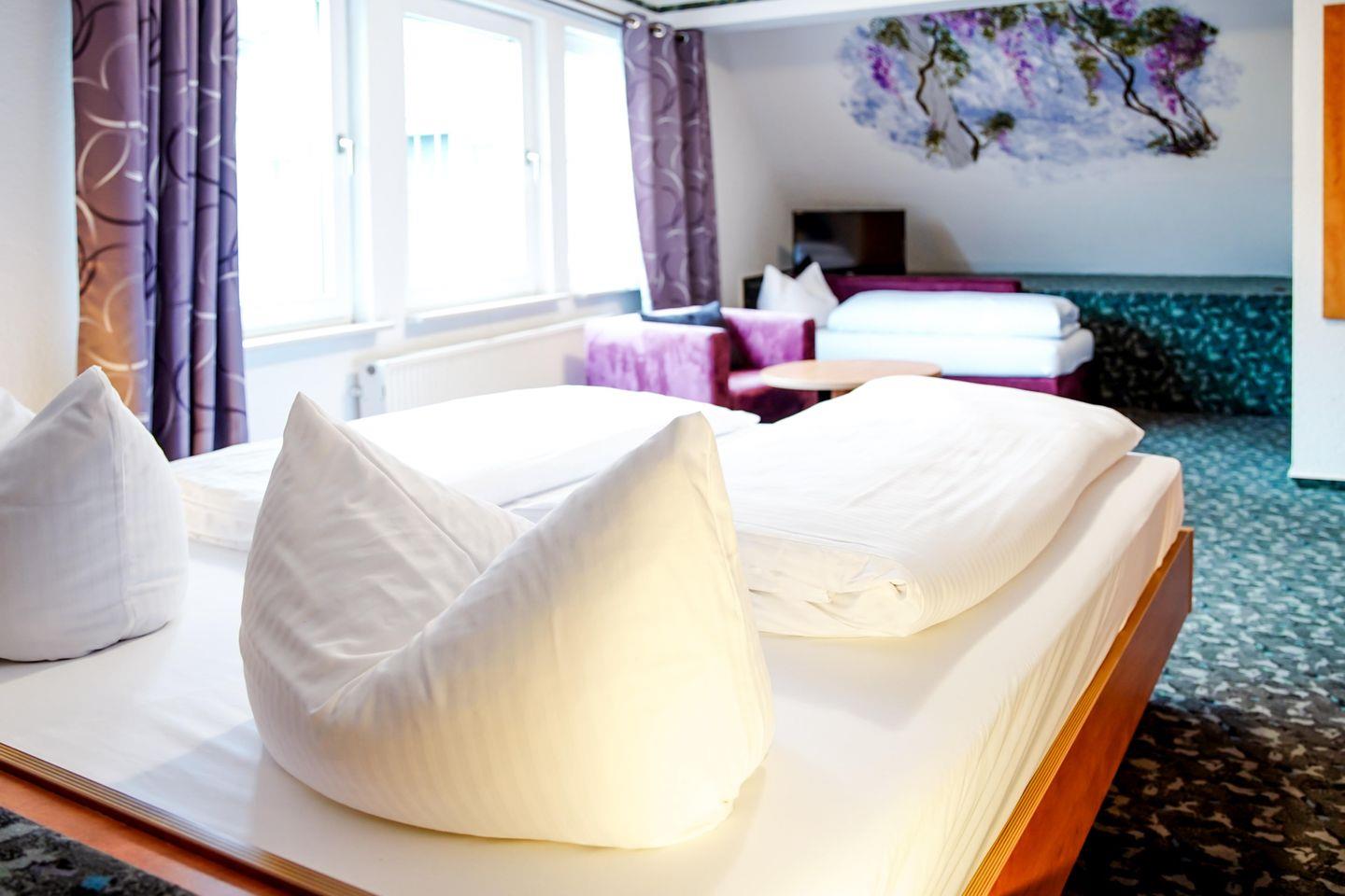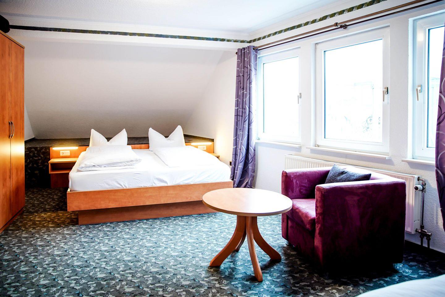 Willkommen in unserem charmanten Zimmer für bis zu drei Personen! Mit 35 qm bietet es ausreichend Platz zum Entspannen. Es verfügt über ein komfortables Doppelbett, einem Einzelbett, einem Schlafsofa, sowie einen modernen Fernseher.