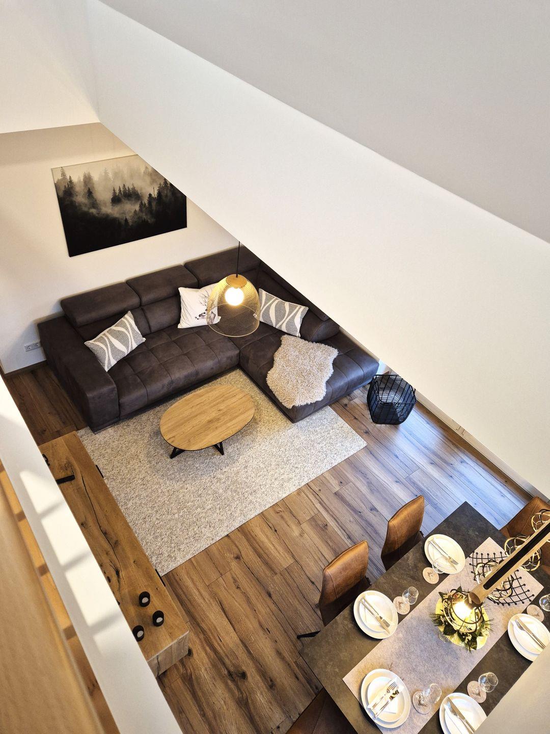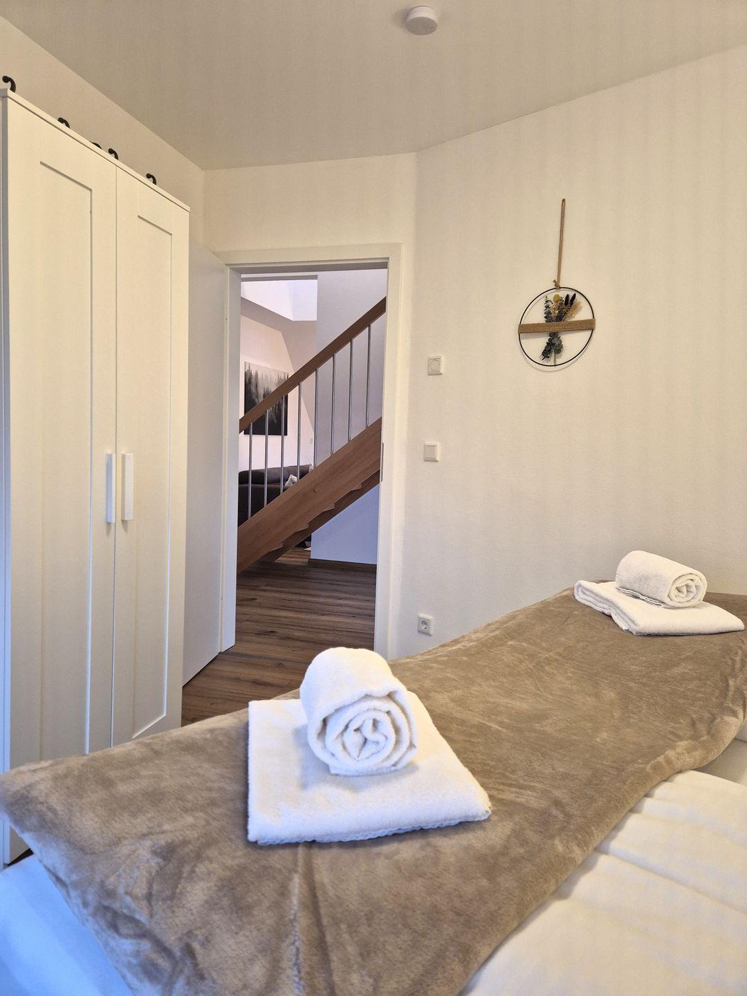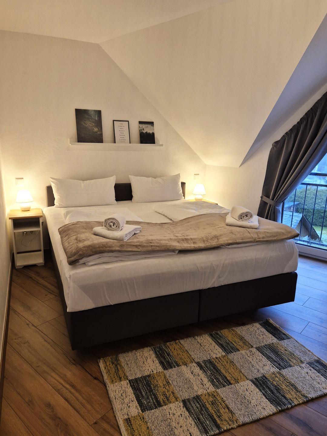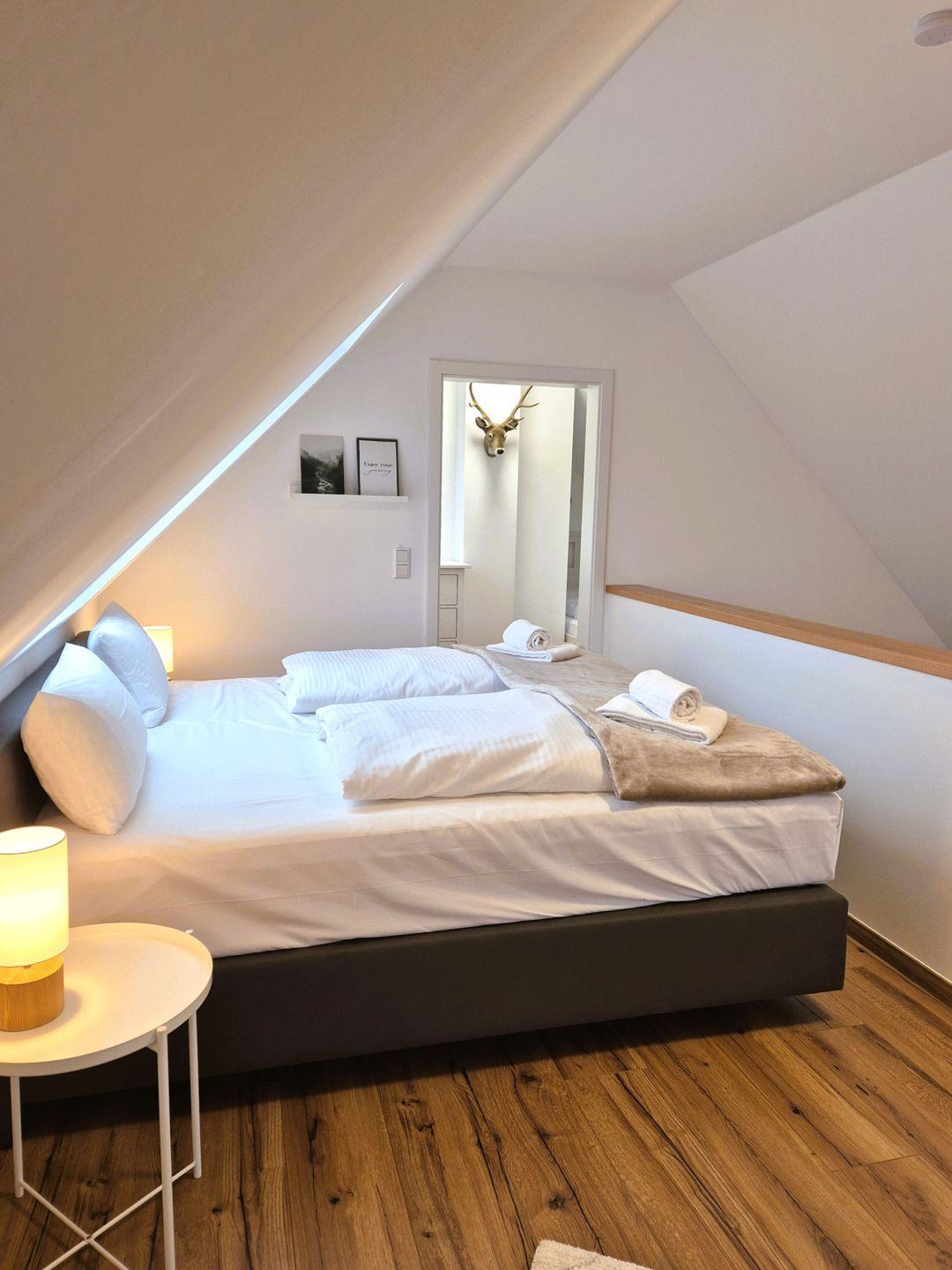 Insgesamt gut 96 m² Wohnfläche verteilen sich über zwei Etagen. Auf der unteren Ebene befinden sich eine Diele mit Garderobe, ein großer Wohn-Essraum mit Fernseher und eine offene Küche mit Zugang zum Balkon, ein geräumiges, gemütliches Doppelschlafzimmer mit Boxspringbett, ein Gäste-WC sowie ein großes Bad mit Doppelwaschbecken, Badewanne und barrierefreier Dusche. Vom Wohnzimmer aus geht es über eine Treppe zu einer offenen Galerie, auf der das zweite Doppelschlafzimmer, ebenfalls mit einem Boxspringbett ausgestattet, untergebracht ist. Hierbei handelt es sich nicht um einen geschlossenen Raum. Von der Galerie aus gibt es den Zugang zum 3. Schlafzimmer, welches mit einem Einzelbett bestückt ist.