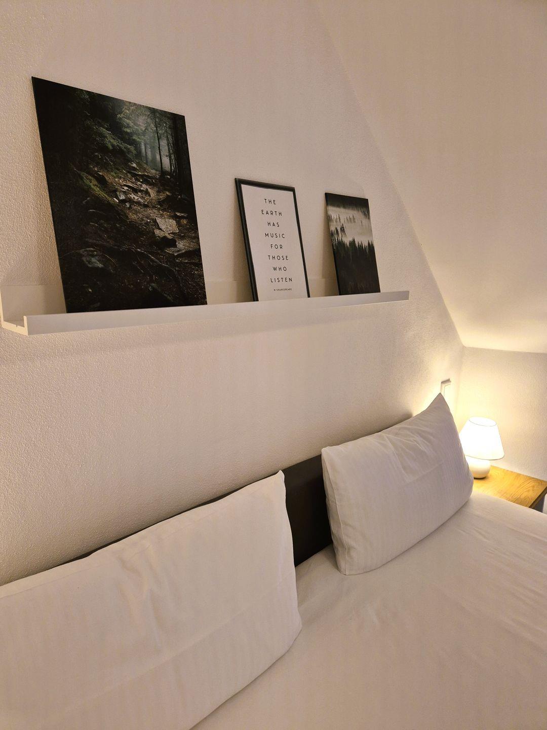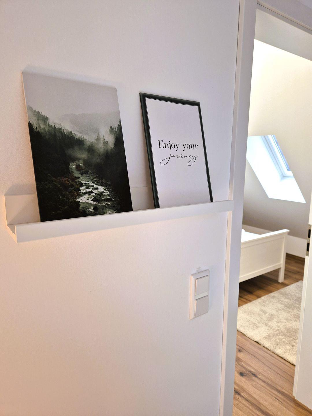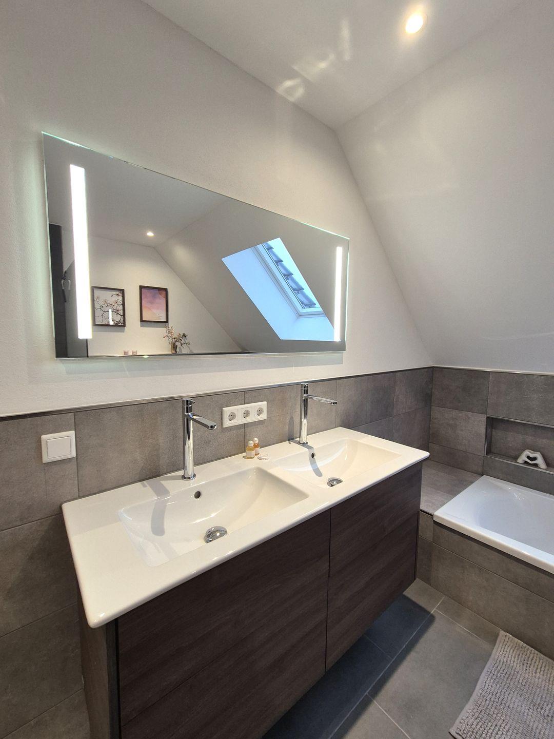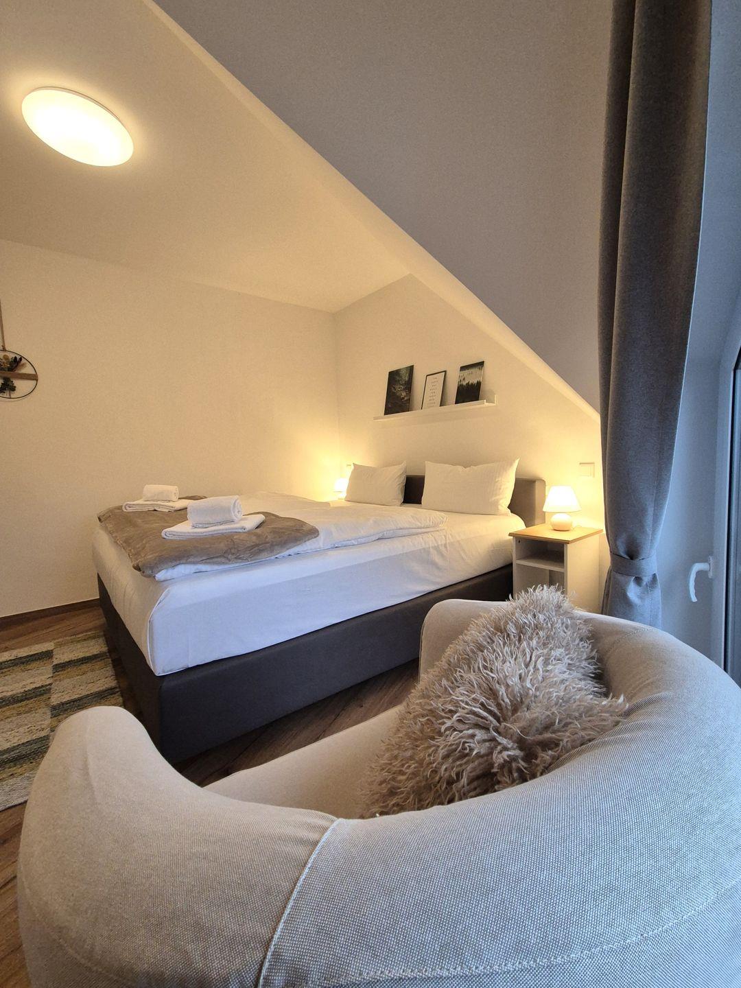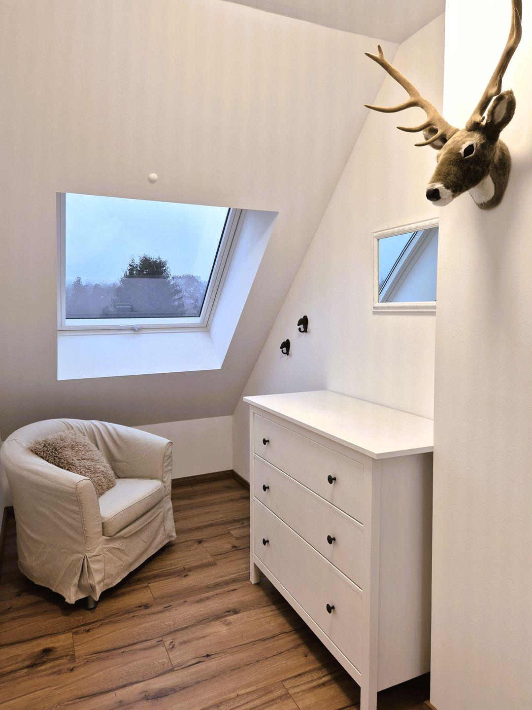 Insgesamt gut 96 m² Wohnfläche verteilen sich über zwei Etagen. Auf der unteren Ebene befinden sich eine Diele mit Garderobe, ein großer Wohn-Essraum mit Fernseher und eine offene Küche mit Zugang zum Balkon, ein geräumiges, gemütliches Doppelschlafzimmer mit Boxspringbett, ein Gäste-WC sowie ein großes Bad mit Doppelwaschbecken, Badewanne und barrierefreier Dusche. Vom Wohnzimmer aus geht es über eine Treppe zu einer offenen Galerie, auf der das zweite Doppelschlafzimmer, ebenfalls mit einem Boxspringbett ausgestattet, untergebracht ist. Hierbei handelt es sich nicht um einen geschlossenen Raum. Von der Galerie aus gibt es den Zugang zum 3. Schlafzimmer, welches mit einem Einzelbett bestückt ist.