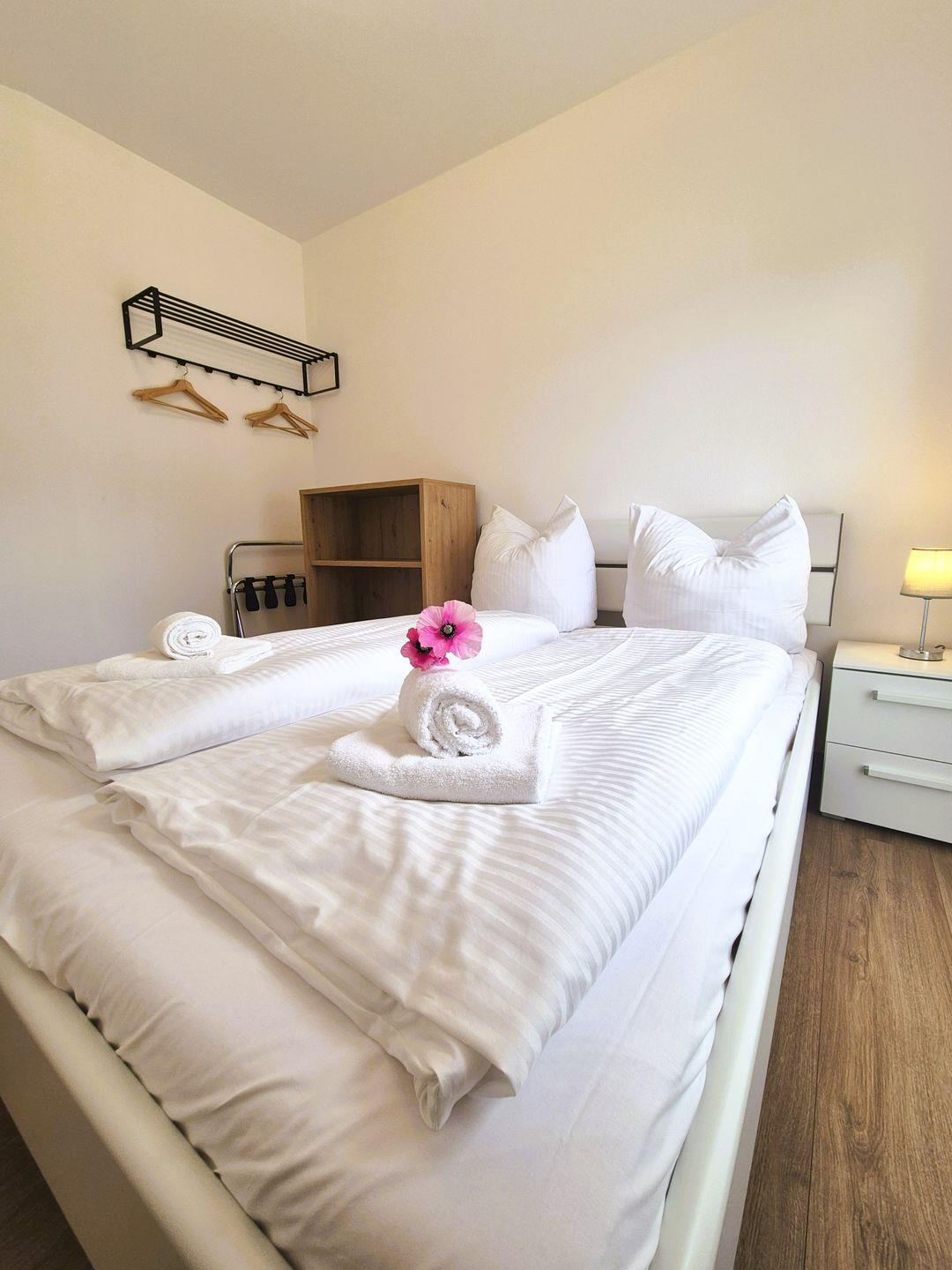 Insgesamt gut 65 m² Wohnfläche verteilen sich auf den Eingangsbereich mit Garderobe und Gäste WC, einen Wohn-Essraum mit SmartTV und offener Küche mit Zugang zur Terrasse sowie ein großes Bad mit Toilette, Doppelwaschbecken und barrierefreier Dusche, ein Doppelschlafzimmer mit einem 1,80 m breiten Boxspringbett (und mit einem weiteren Zugang zur Terrasse) und ein Doppelschlafzimmer mit einem 1,40 m breiten Standardbett. Die Wohnung verfügt außerdem über elektrische Rollläden. Das Sofa im Wohnzimmer ist ausgeklappt die Schlafmöglichkeit für die 5. Person.