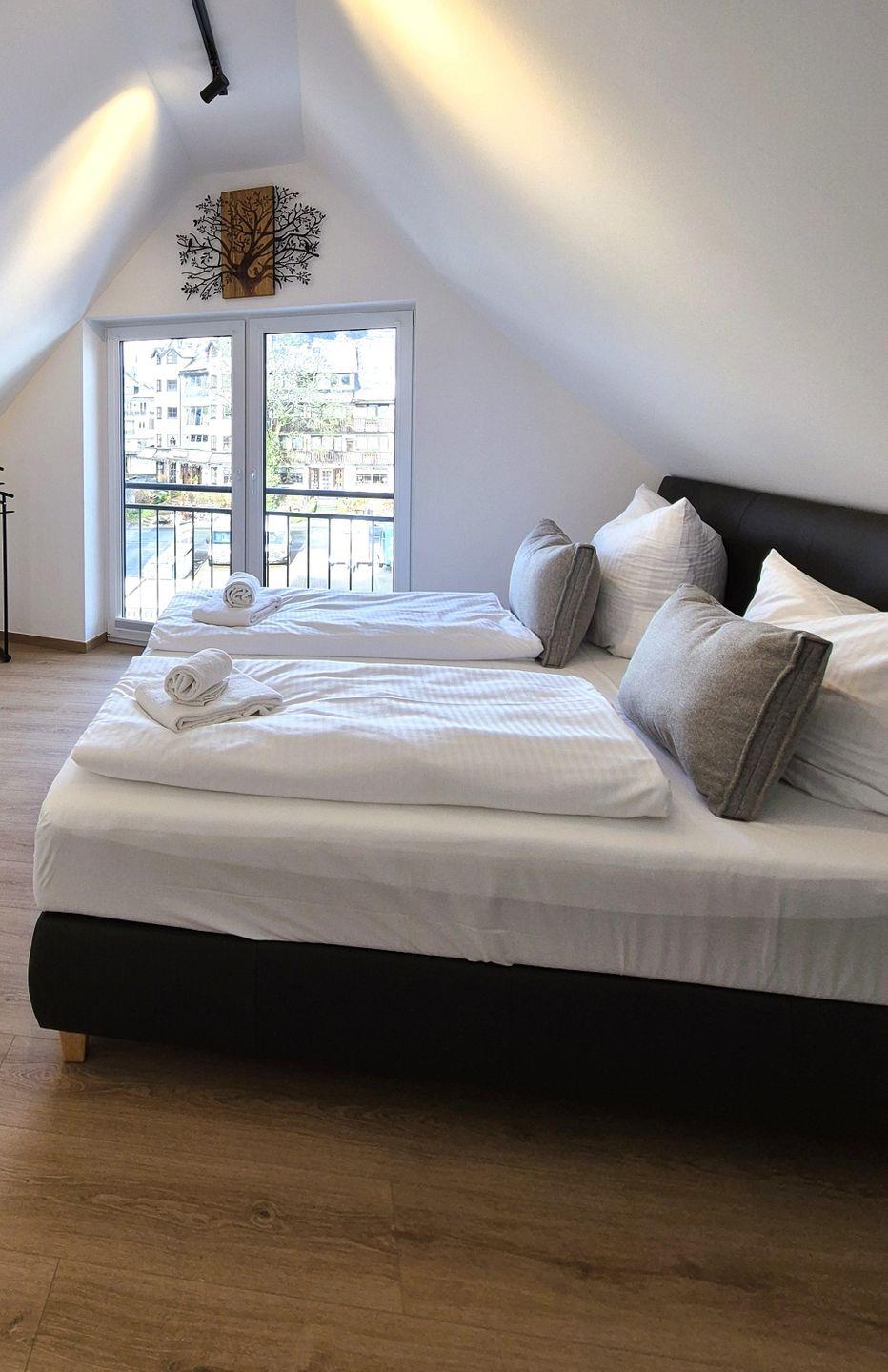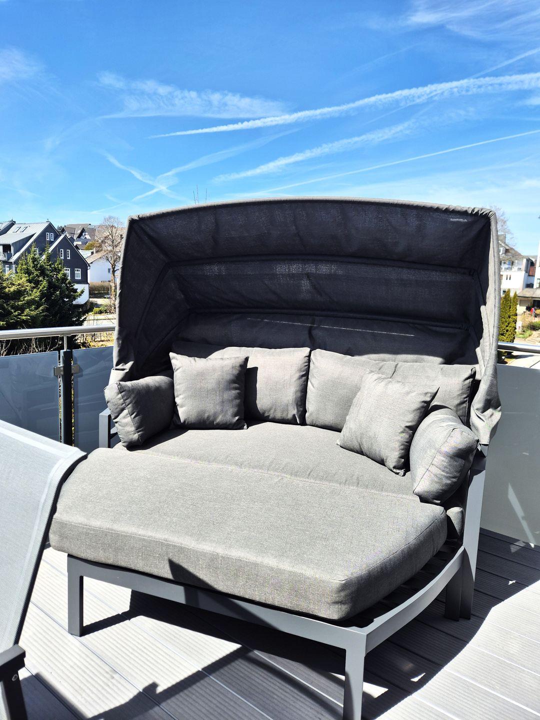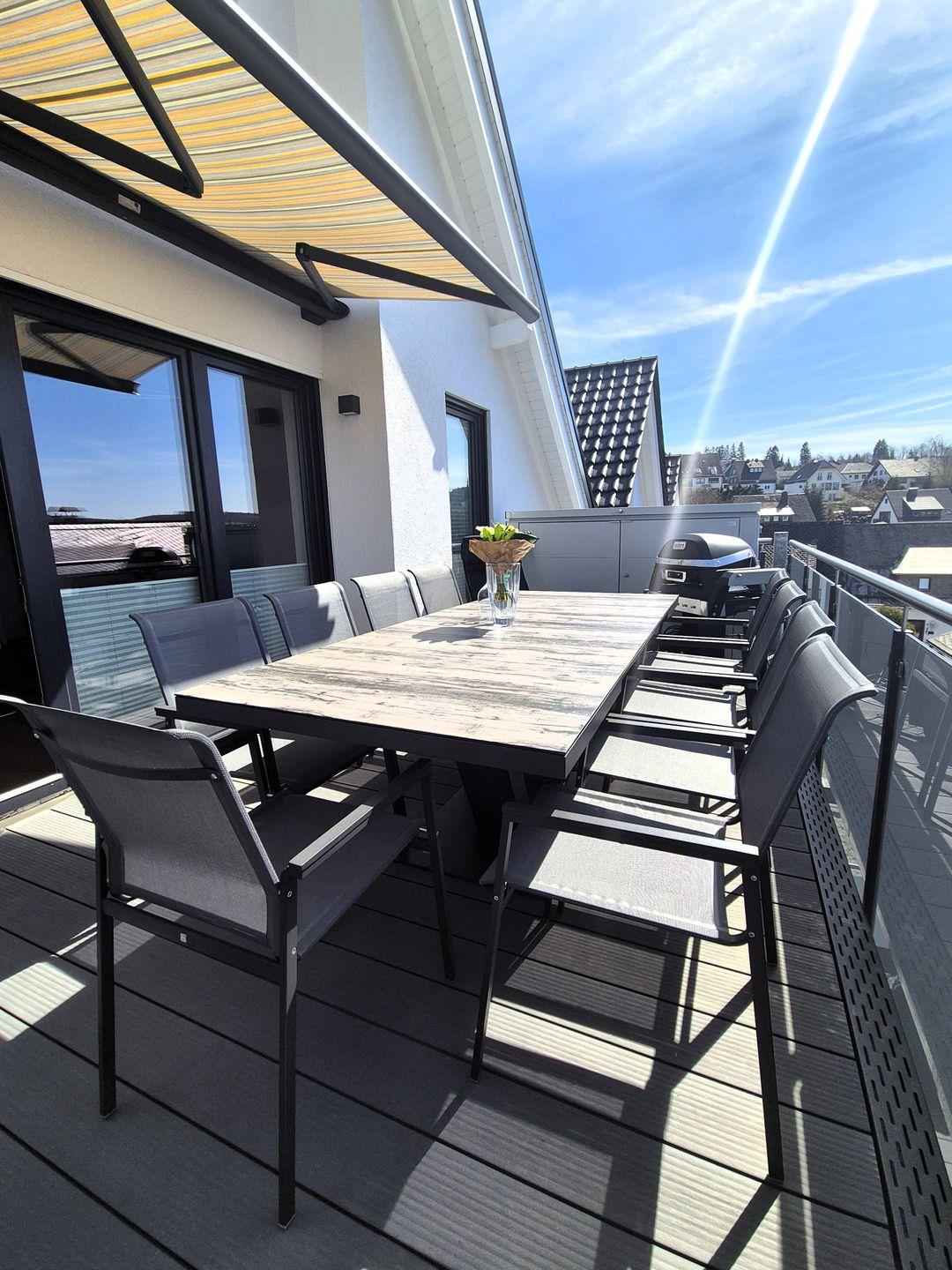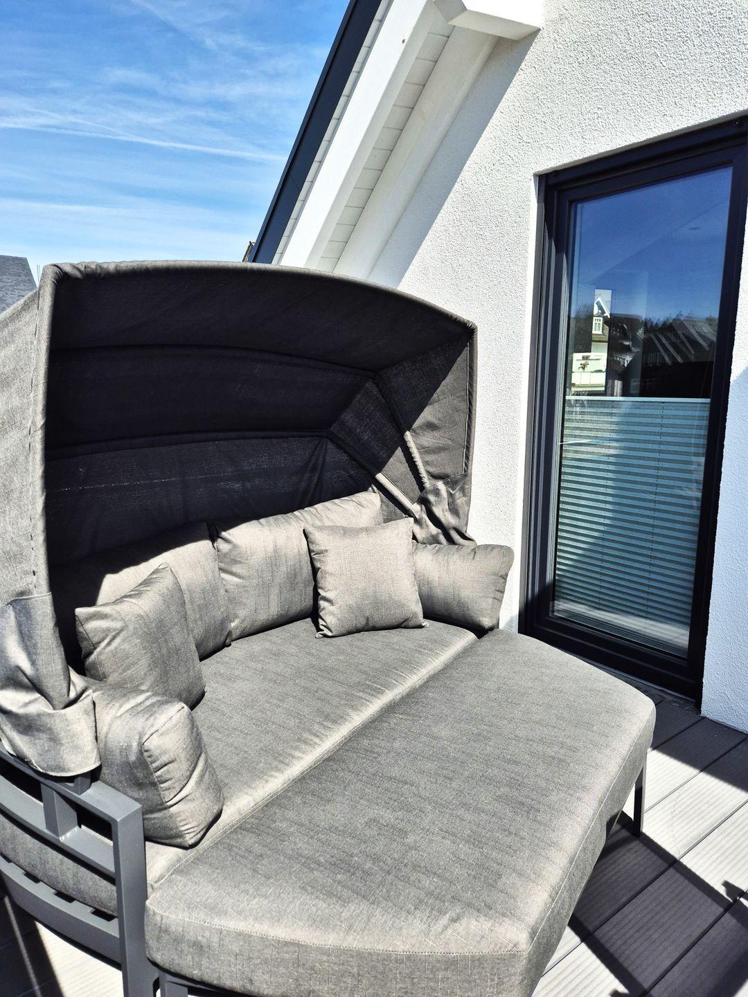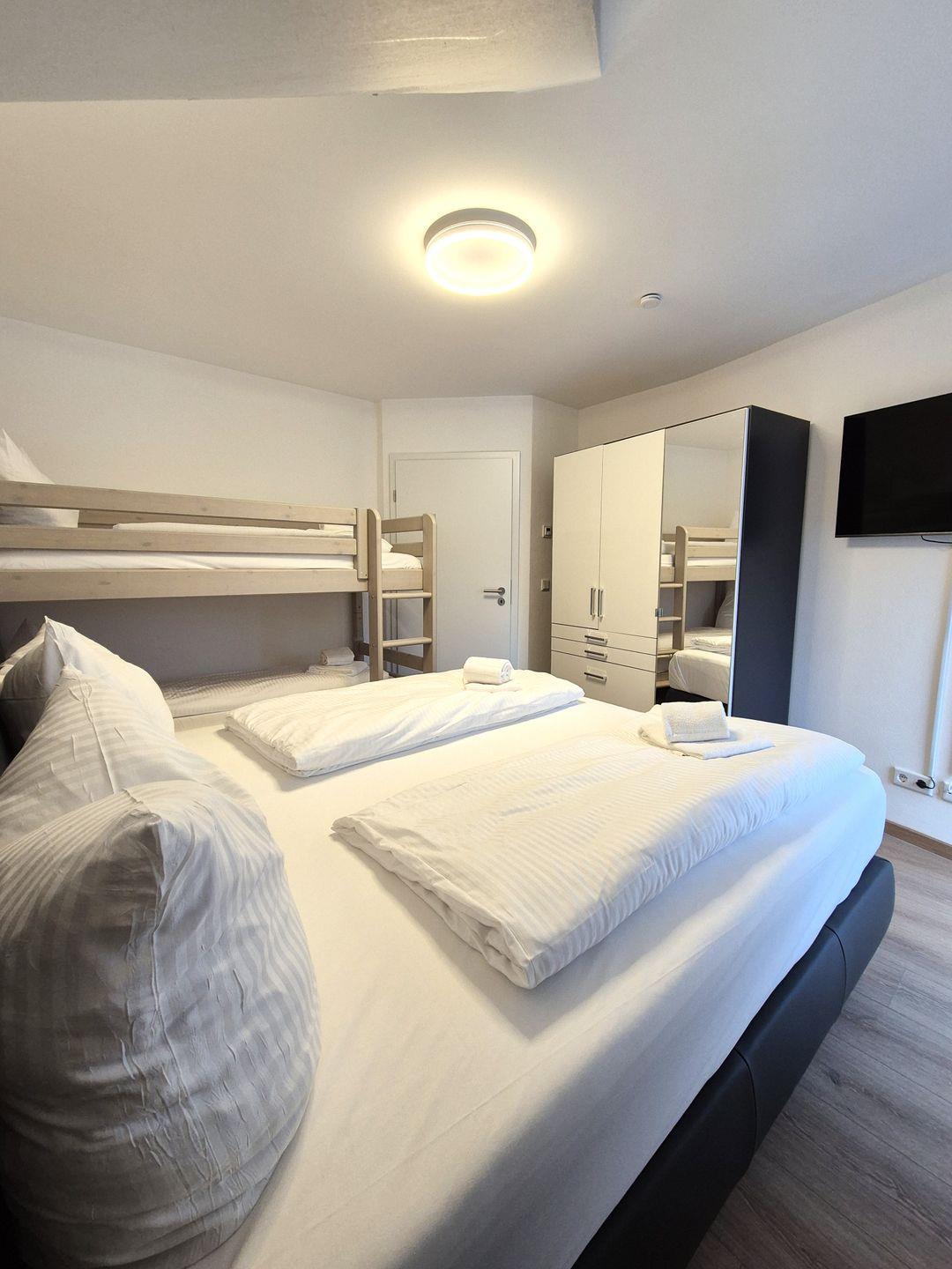 Insgesamt gut 130 m² Wohnfläche verteilen sich über zwei Etagen. Auf der unteren Ebene befinden sich eine Diele mit Garderobe, ein großer Wohn-Essraum mit Fernseher und eine Küche, ein gemütliches Doppelschlafzimmer mit Boxspringbet, Hochbett und einem weiteren Fernseher, ein Gäste-WC mit Waschmaschine sowie ein großes Bad mit Waschbecken, Badewanne und barrierefreier Dusche. Der große Balkon ist sowohl von der Küche als auch vom Wohnzimmer aus begehbar und im Sommer mit Gartenmöbeln bestückt. Vom Flur aus geht es über eine Treppe in die obere Etage, auf der sich zwei weitere Schlafzimmer und das zweite Bad befinden. Ein Schlafzimmer verfügt über ein 1,60 m breites Boxspringbett und ein Hochbett sowie einen Fernseher, das andere Schlafzimmer verfügt über ein 1,80 m breites Boxspringbett und ebenfalls über einen Fernseher. In dem großzügigen Badezimmer mit Dusche, WC und Waschtisch befindet sich außerdem eine Infrarotsauna.