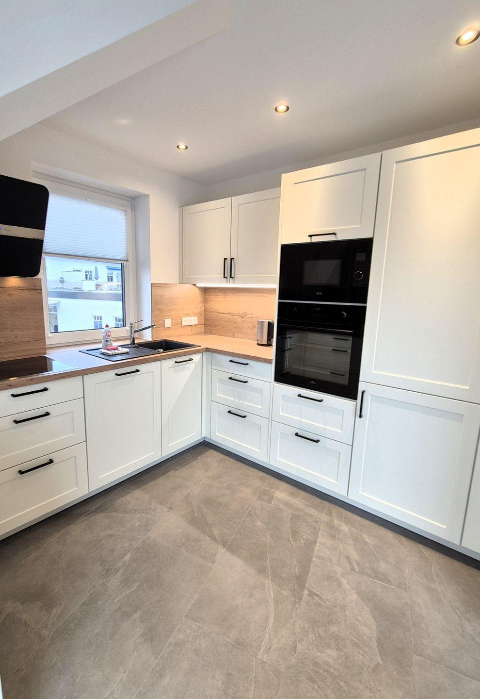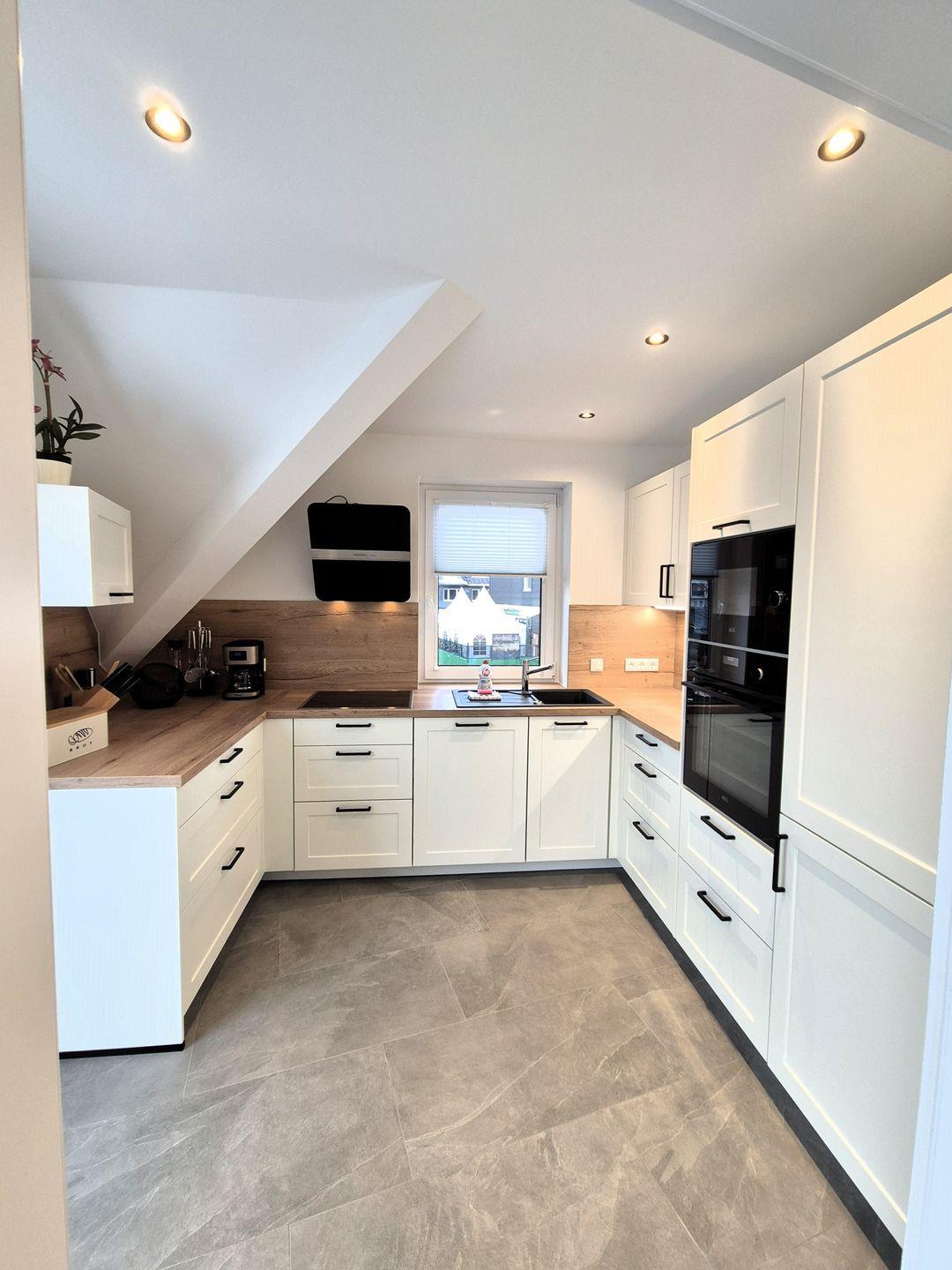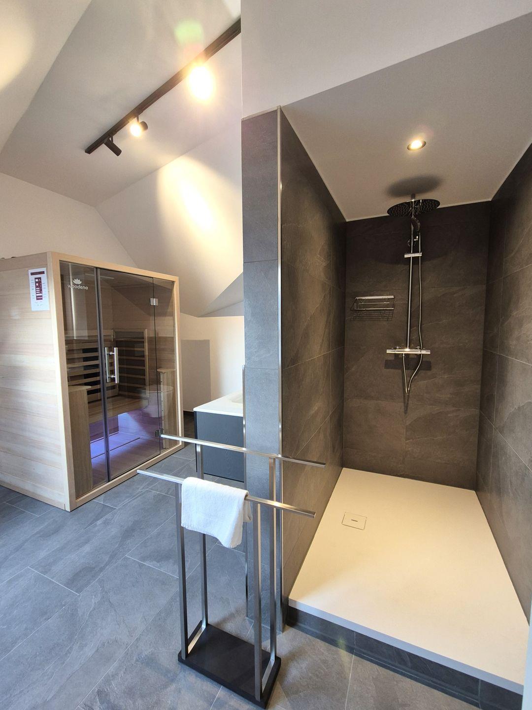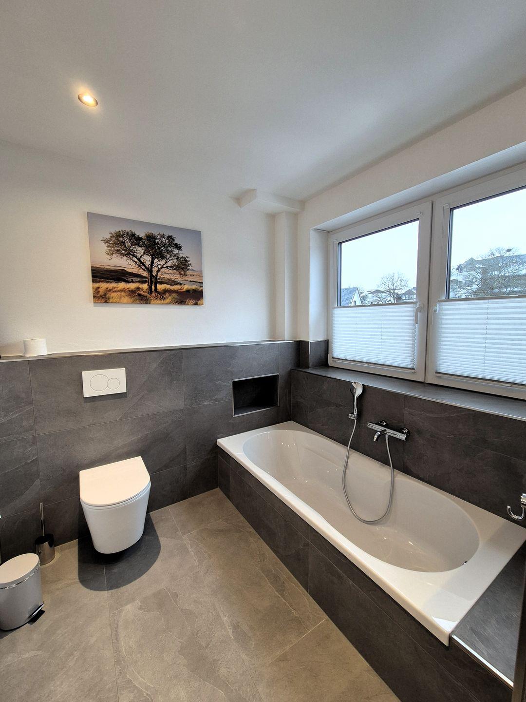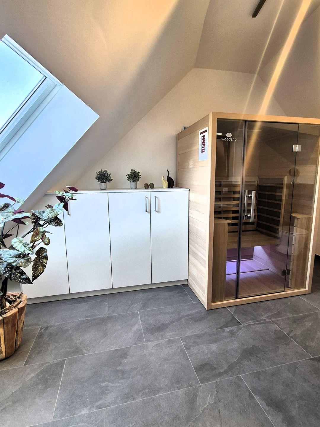 Insgesamt gut 130 m² Wohnfläche verteilen sich über zwei Etagen. Auf der unteren Ebene befinden sich eine Diele mit Garderobe, ein großer Wohn-Essraum mit Fernseher und eine Küche, ein gemütliches Doppelschlafzimmer mit Boxspringbet, Hochbett und einem weiteren Fernseher, ein Gäste-WC mit Waschmaschine sowie ein großes Bad mit Waschbecken, Badewanne und barrierefreier Dusche. Der große Balkon ist sowohl von der Küche als auch vom Wohnzimmer aus begehbar und im Sommer mit Gartenmöbeln bestückt. Vom Flur aus geht es über eine Treppe in die obere Etage, auf der sich zwei weitere Schlafzimmer und das zweite Bad befinden. Ein Schlafzimmer verfügt über ein 1,60 m breites Boxspringbett und ein Hochbett sowie einen Fernseher, das andere Schlafzimmer verfügt über ein 1,80 m breites Boxspringbett und ebenfalls über einen Fernseher. In dem großzügigen Badezimmer mit Dusche, WC und Waschtisch befindet sich außerdem eine Infrarotsauna.