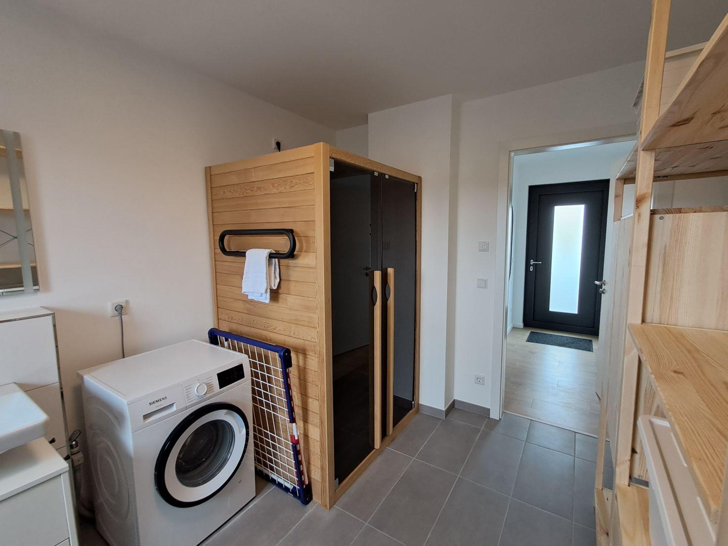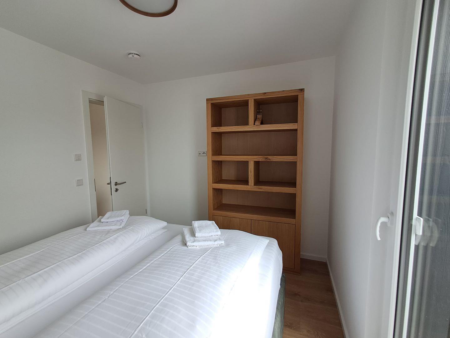 Die Wohnung bietet Schlafmöglichkeiten für bis zu vier Personen. Die moderne Einrichtung schafft eine gemütliche Atmosphäre und lädt zum Entspannen ein. Im Eingangsbereich finden Sie eine Garderobe, die Ihnen genügend Stauraum bietet. Das Badezimmer ist mit einer bodengleichen Dusche, einem Waschbecken, einem WC, einer Infrarotsauna und Waschmaschine ausgestattet. Hier können Sie sich nach einem aktiven Tag in der Natur erfrischen.