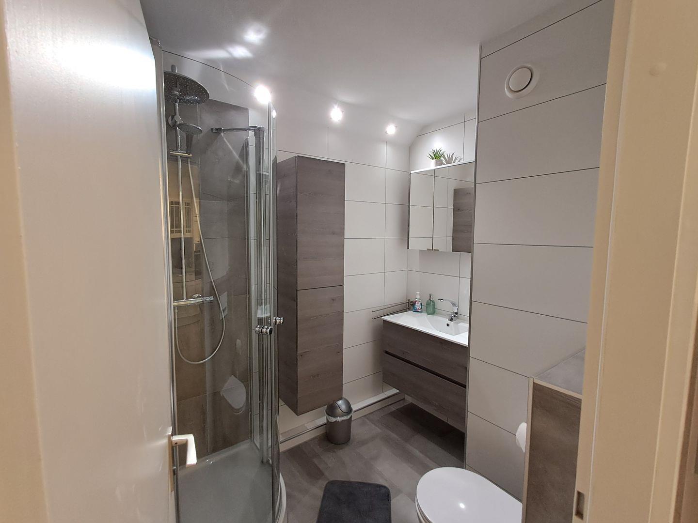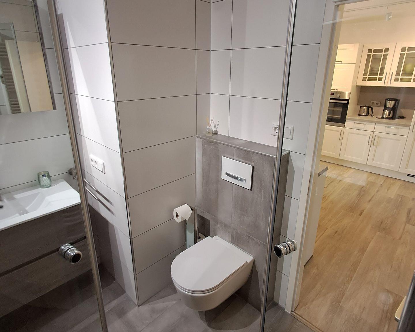 Das Badezimmer bietet Dusche, Waschbecken und WC – kompakt und funktional. WLAN steht Ihnen im gesamten Apartment zur Verfügung.
