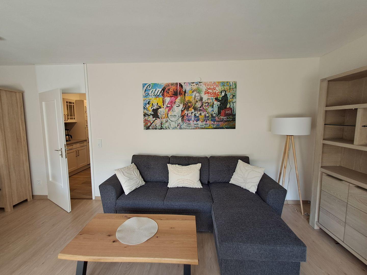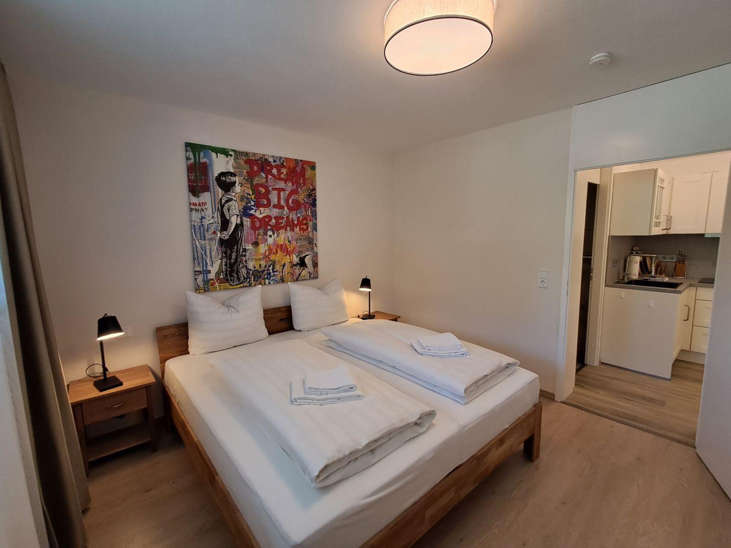 Die Ferienwohnung eignet sich ideal für bis zu vier Personen und überzeugt mit liebevoll eingerichteten Wohnbereichen. Im Schlafzimmer sorgt ein komfortables Bett für erholsamen Schlaf. Der offene Wohnbereich mit gemütlicher Sofaecke, Essplatz und Flachbild-TV lädt zu entspannten Abenden ein. Der hochwertige Vinylboden schafft eine warme und einladende Atmosphäre.