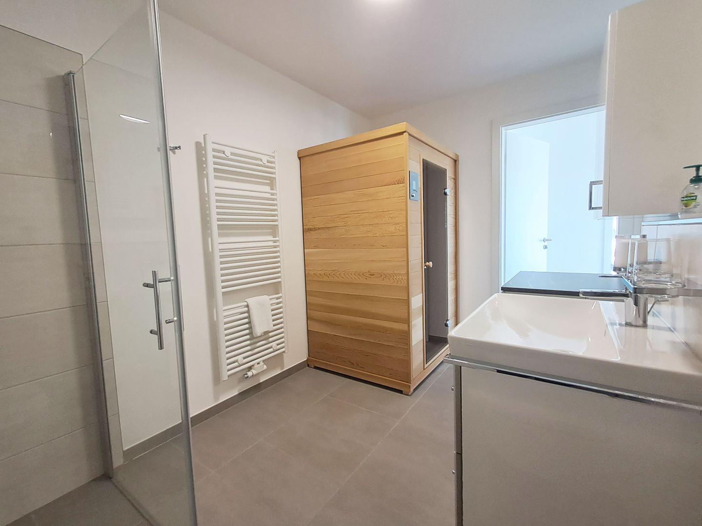 Das Badezimmer ist hell und modern gestaltet: Es verfügt über eine bodengleiche Dusche, Waschbecken, Spiegel, Kosmetikspiegel sowie eine vollständige Ausstattung mit Badetüchern, Handtüchern, Haartrockner und Hygieneartikeln wie Seife und Shampoo. Ergänzt wird der Komfort durch eine private Infrarotkabine und Sauna, die ausschließlich Ihnen zur Eigennutzung zur Verfügung steht.