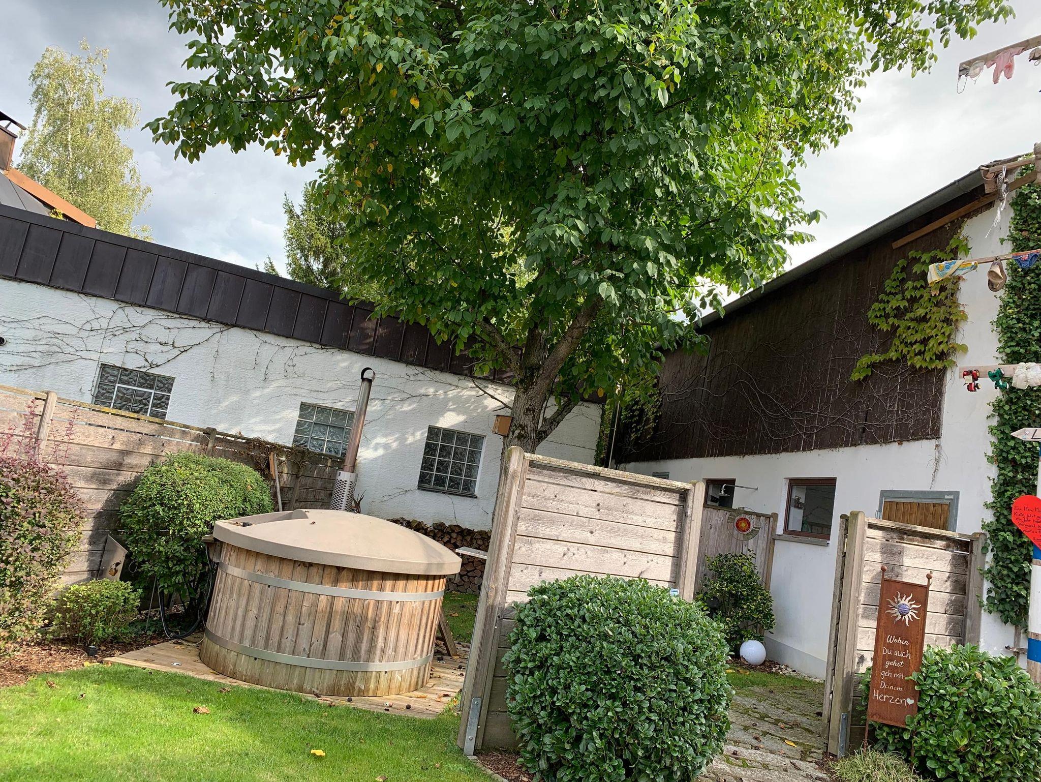 Im Außenbereich ein Badebottich mit Sprudelfunktion (bis 6 Personen) und romantischer Beleuchtung bei Nacht.