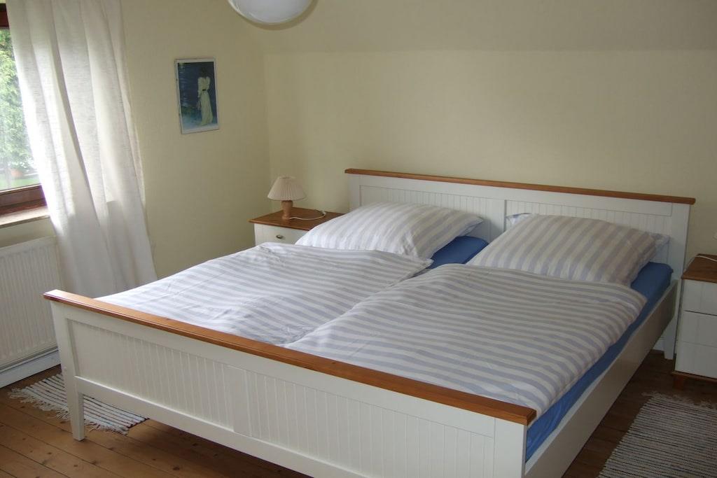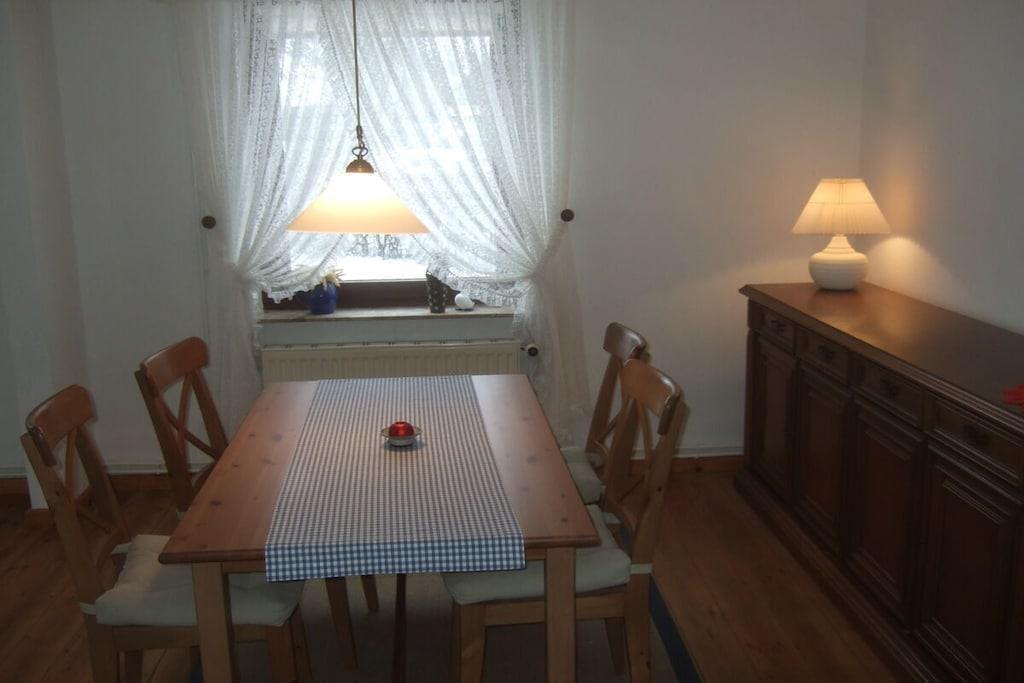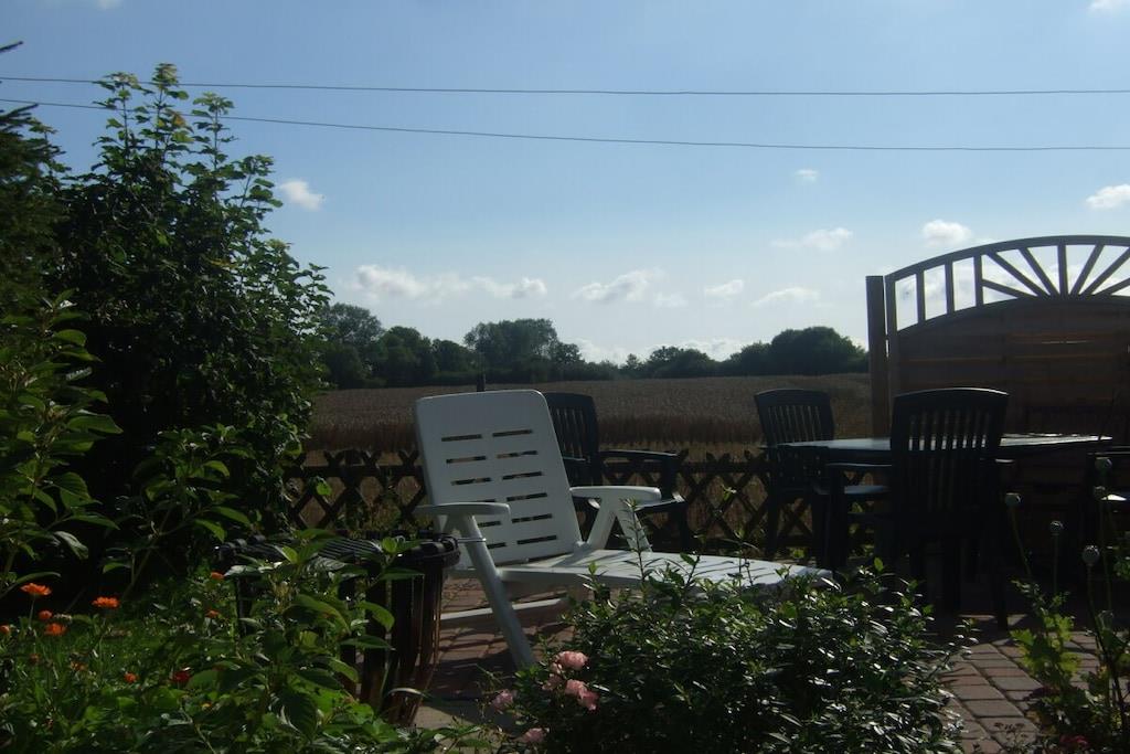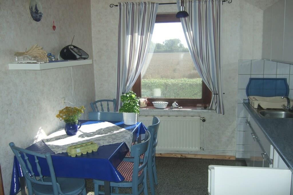 Feriehuset med en lille have og terrasse ligger cirka 200 meter fra vores gård, roligt i udkanten af landsbyen med en smuk udsigt over markerne. Det er cirka 75 kvadratmeter stort og har en stue, 2 soveværelser, et køkken og et badeværelse med bruser. Hvis du har lyst, er du velkommen til at komme til vores gård når som helst for at lege (gynge, vippe, sandkasse, bordtennisbord osv.) og kæle med vores dyr (katte, kaniner, kyllinger, grise).