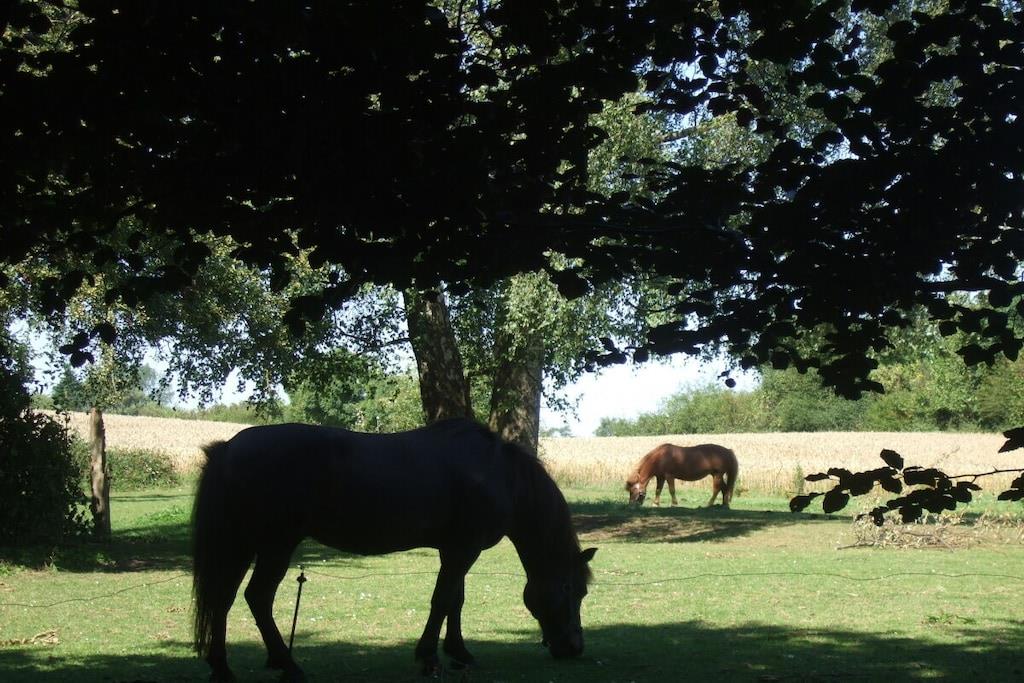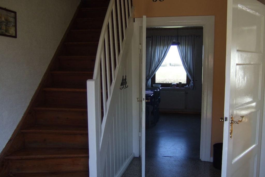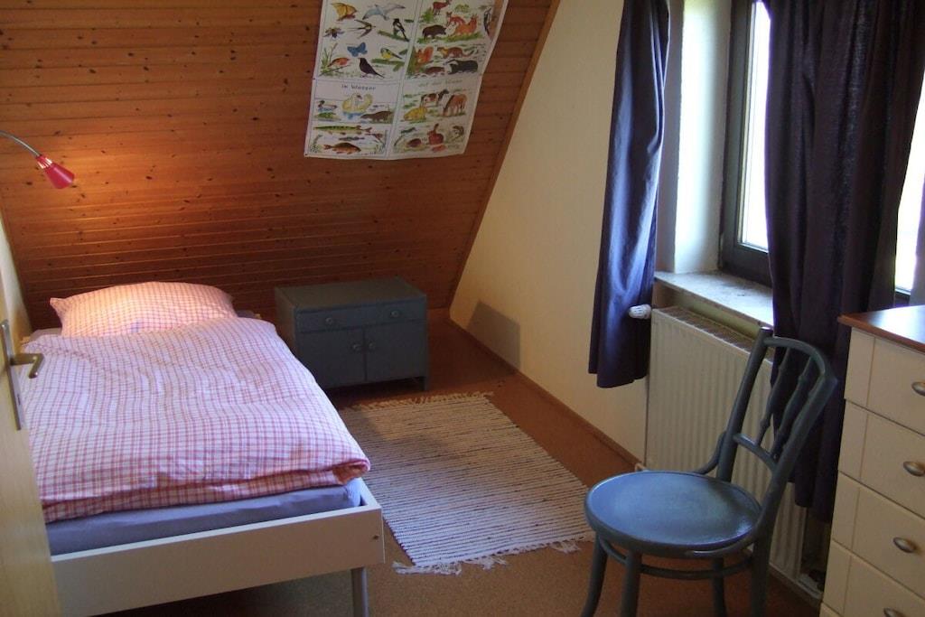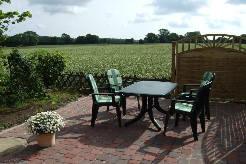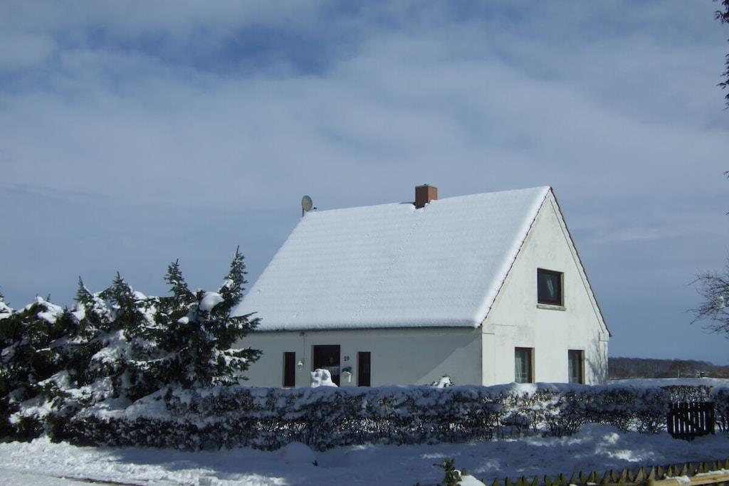 Feriehuset med en lille have og terrasse ligger cirka 200 meter fra vores gård, roligt i udkanten af landsbyen med en smuk udsigt over markerne. Det er cirka 75 kvadratmeter stort og har en stue, 2 soveværelser, et køkken og et badeværelse med bruser. Hvis du har lyst, er du velkommen til at komme til vores gård når som helst for at lege (gynge, vippe, sandkasse, bordtennisbord osv.) og kæle med vores dyr (katte, kaniner, kyllinger, grise).