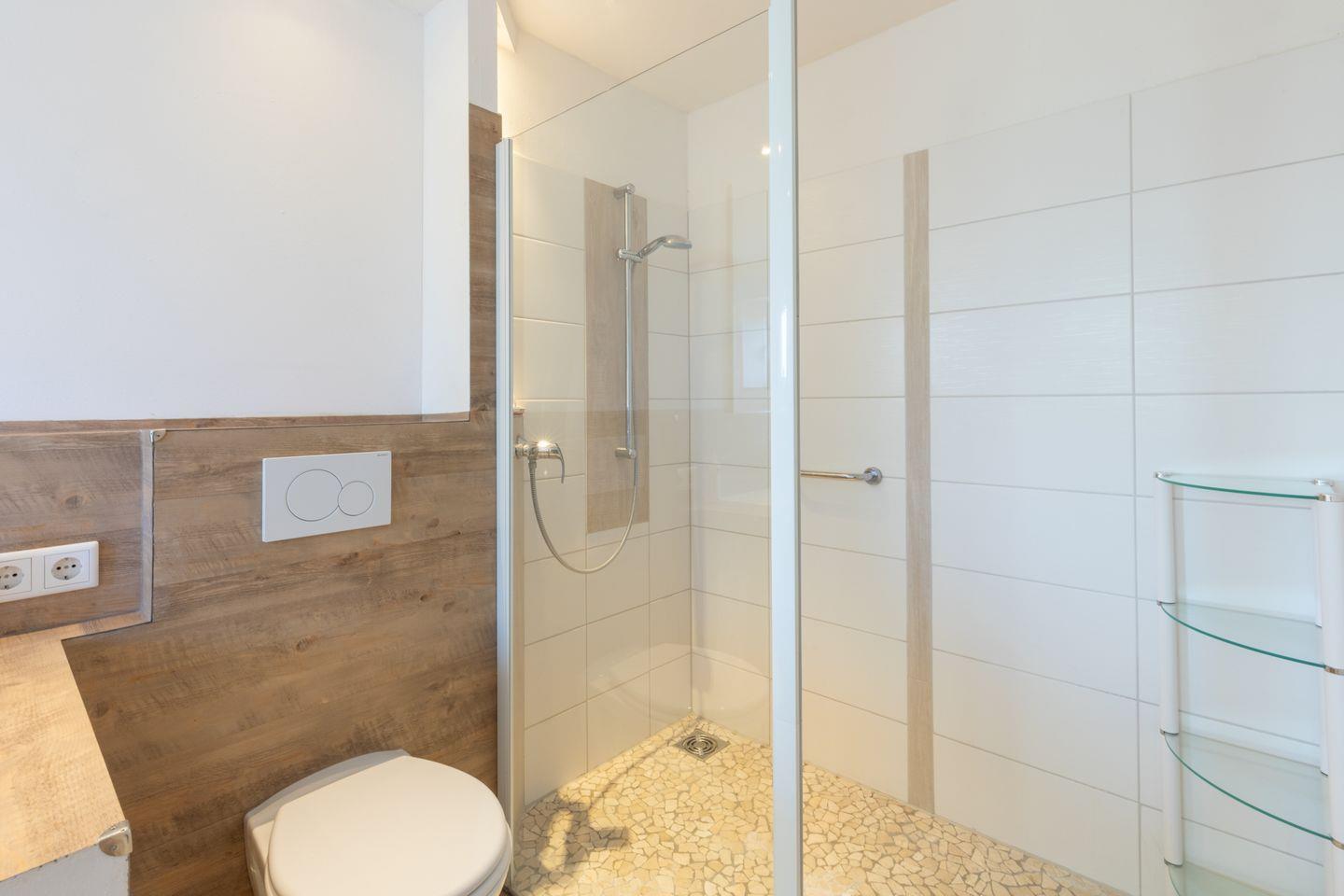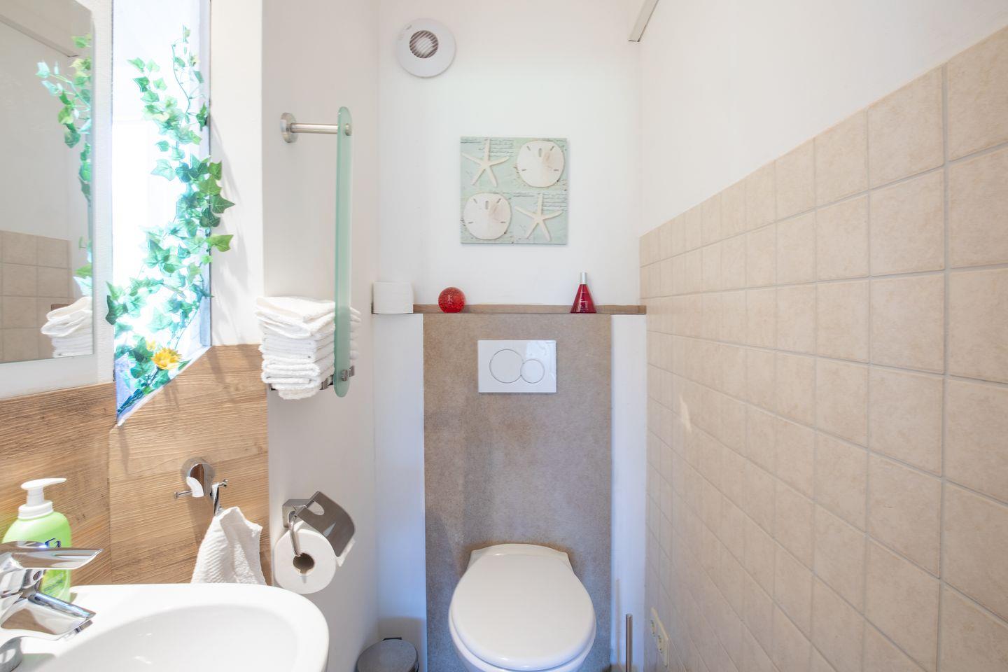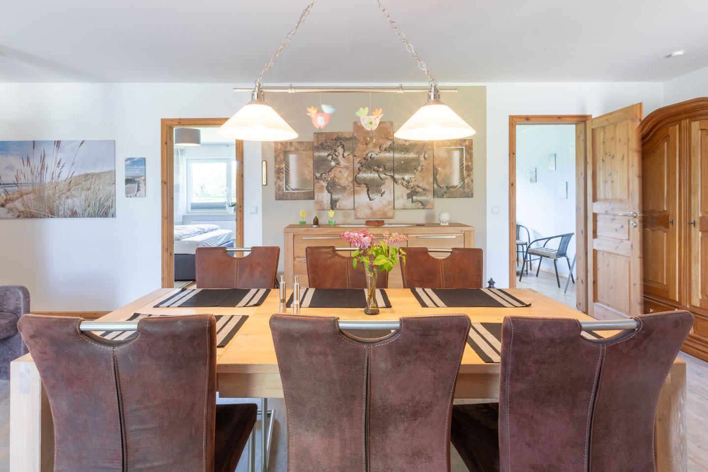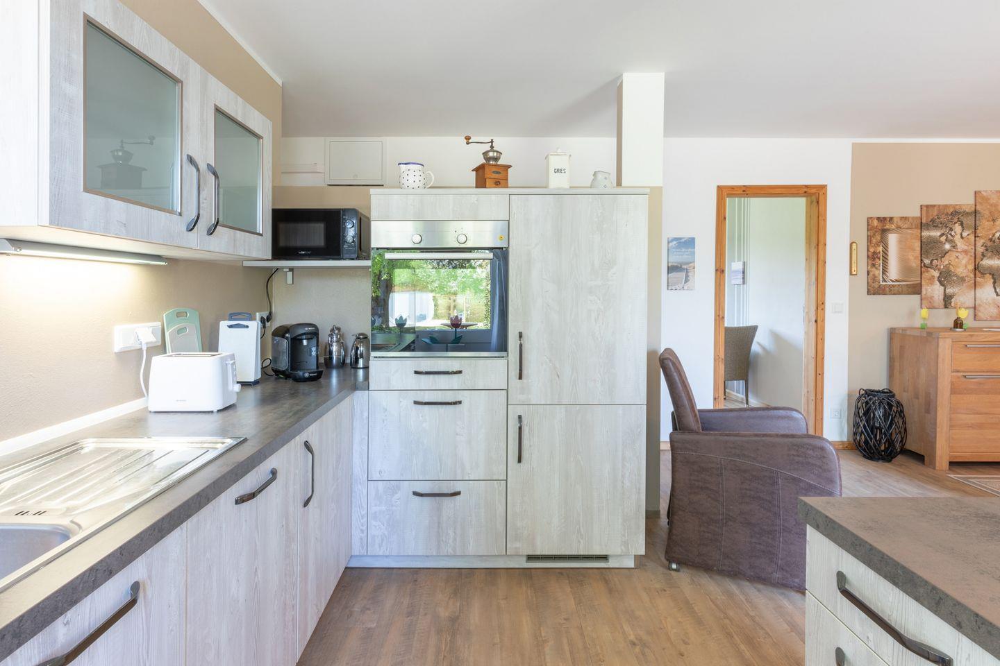 Die Ferienwohnung ist großzügig bemessen und bietet auf 130 Quadratmetern Platz für bis zu sechs Personen. Das ebenerdige Appartement zeichnet sich durch seine offene Küche mit angrenzendem Essbereich aus, der ausreichend Platz für gemeinsame Mahlzeiten und Aktivitäten bietet. Die Küche ist vollständig ausgestattet mit einem Herd samt Backofen, einer Mikrowelle, einer Kaffeemaschine (Filtergröße 4), einem Toaster, Mixer und einem Radio. Das moderne Duschbad im Erdgeschoss verfügt über eine ebenerdige Dusche. Zusätzlich gibt es ein Gäste-WC.