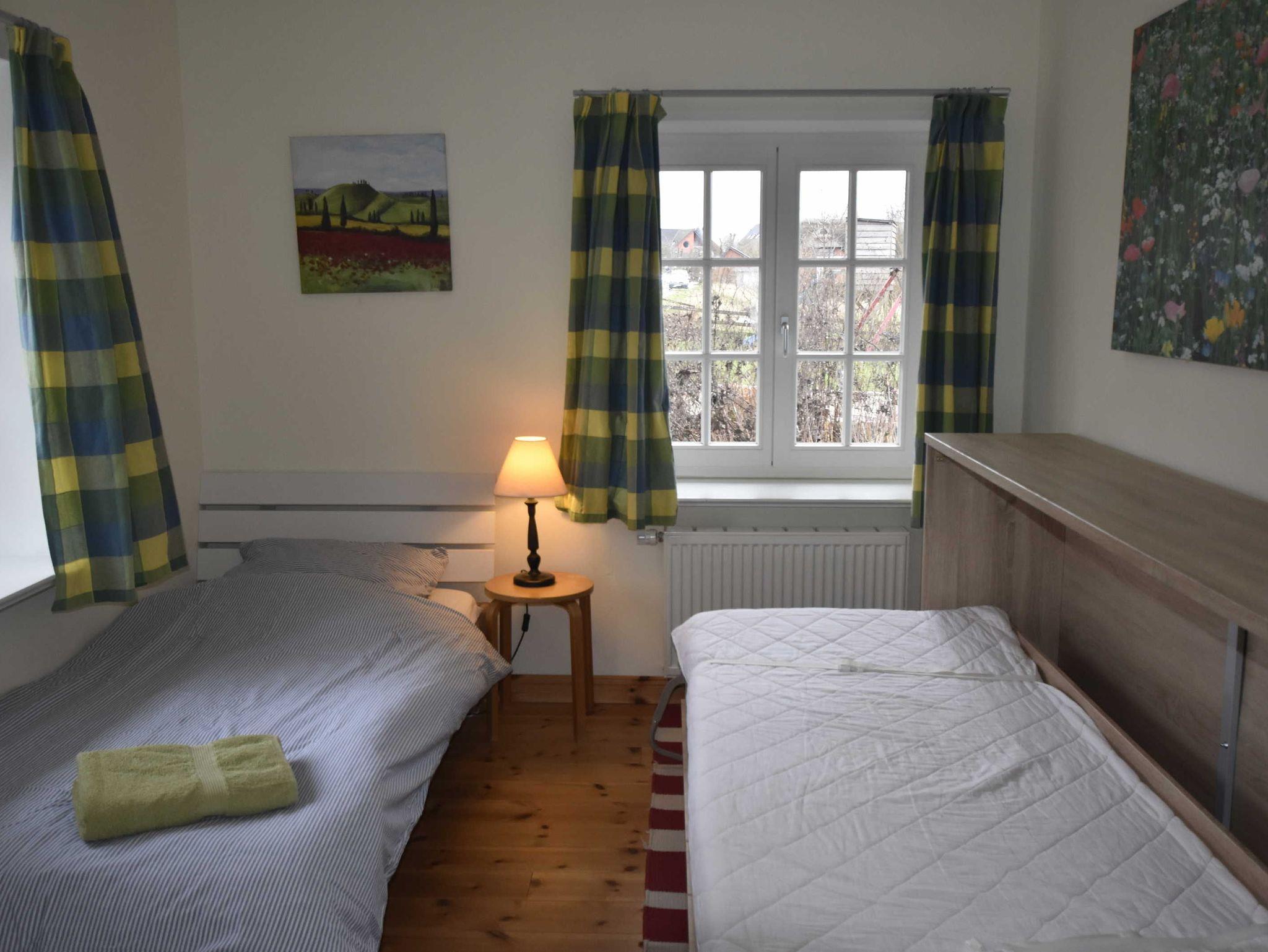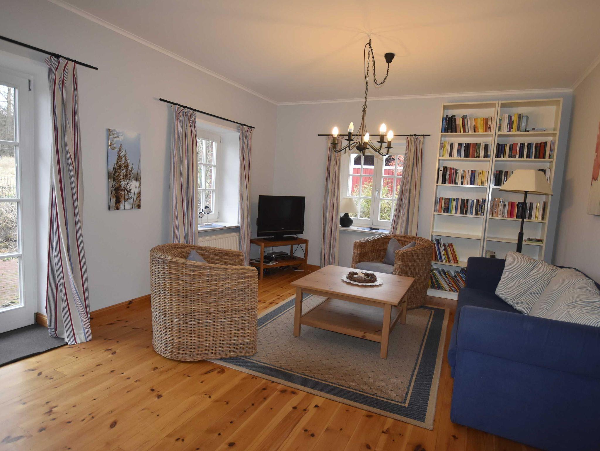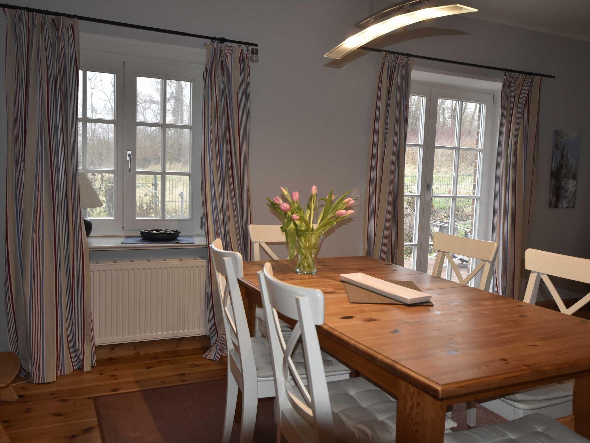 3-Raum-Ferienwohung im eleganten Landhausstil. Wohnbereich mit gemütliche Sitzecke und Eßbereich und Zugang zur Terrasse. Küche mit Backofen, 4-Plattenherd, Mikrowelle, Geschirrspüler, Kühlschrank mit Gefierfach, Toaster, Kaffeemaschine, Wasserkocher. 1 Schlafzimmer mit Doppelbett, 1 Schlafzimmer mit Einzelbett und ausklappbaren Schrankbett Zusätzliche Aufbettung für 2 Personen auf Schlafcouch im Wohnzimmer. Badezimmer mit Du / WC / Waschmaschine.