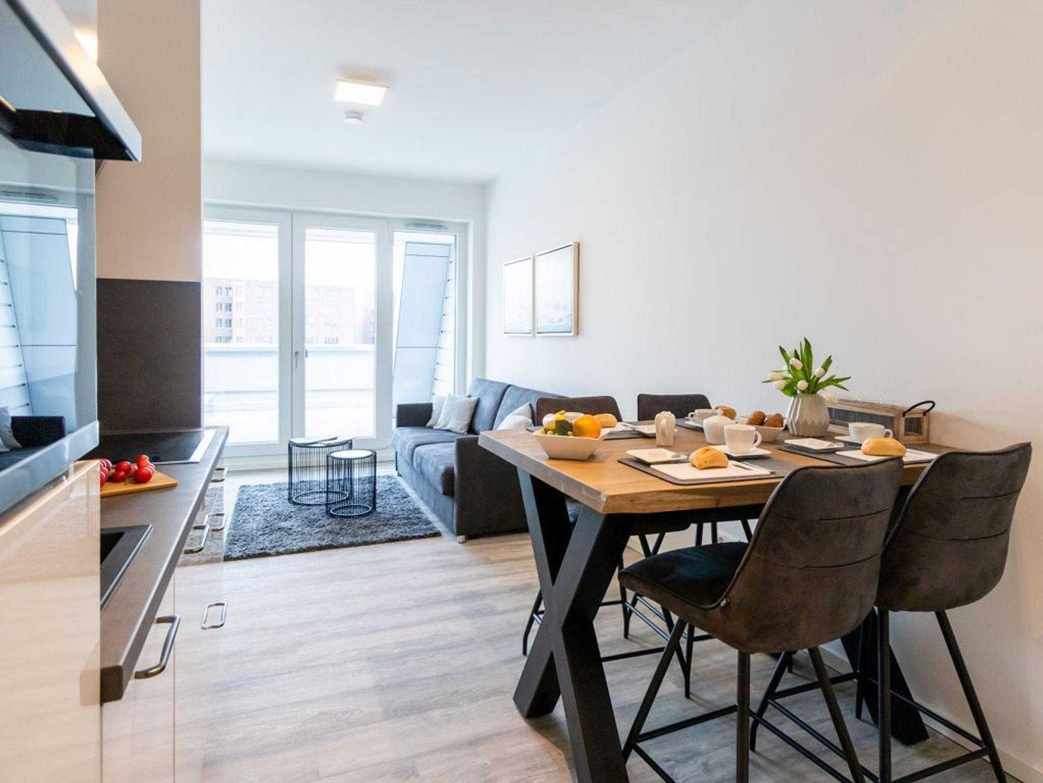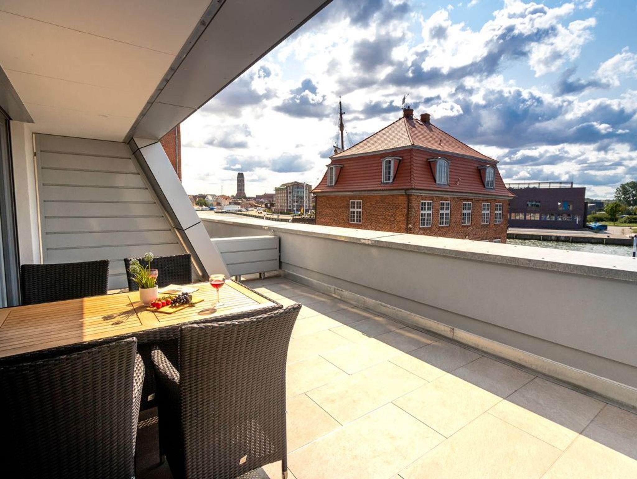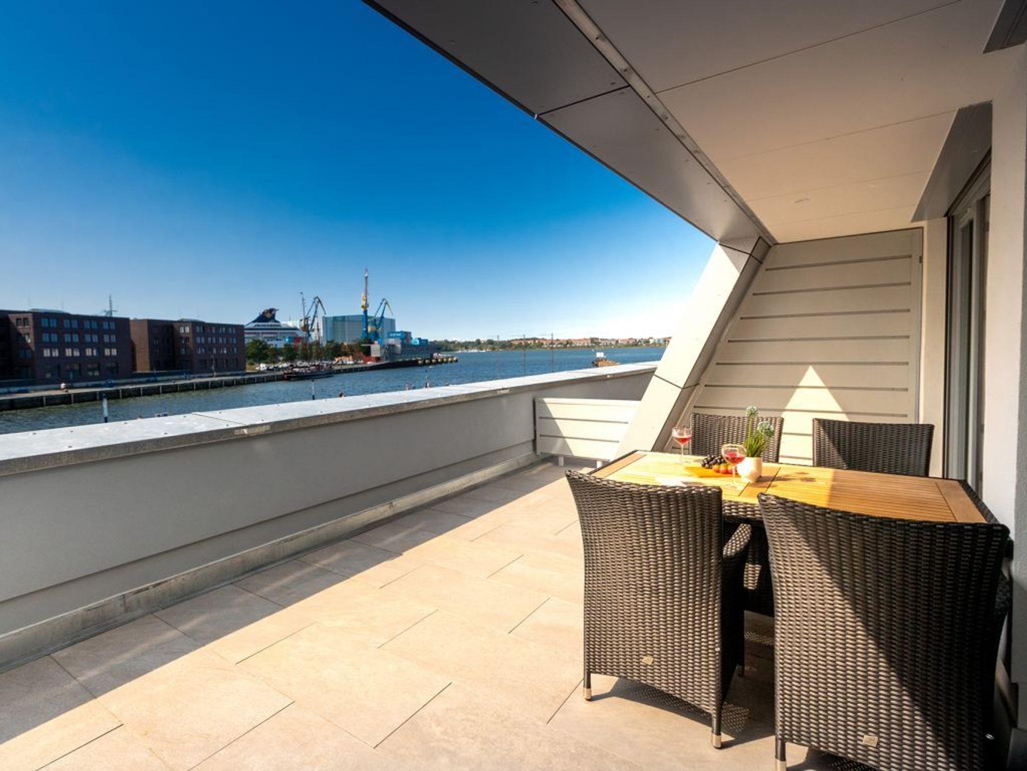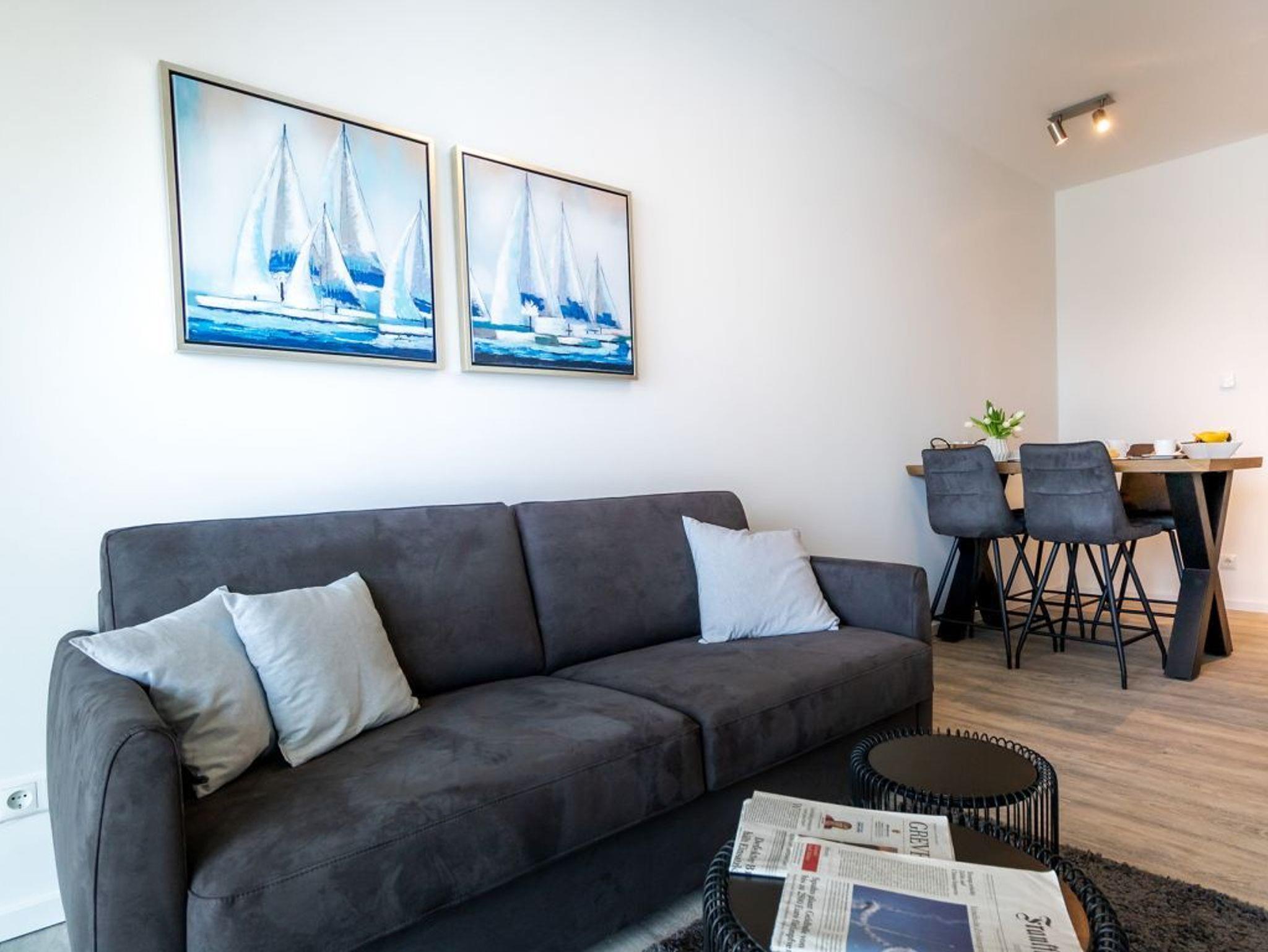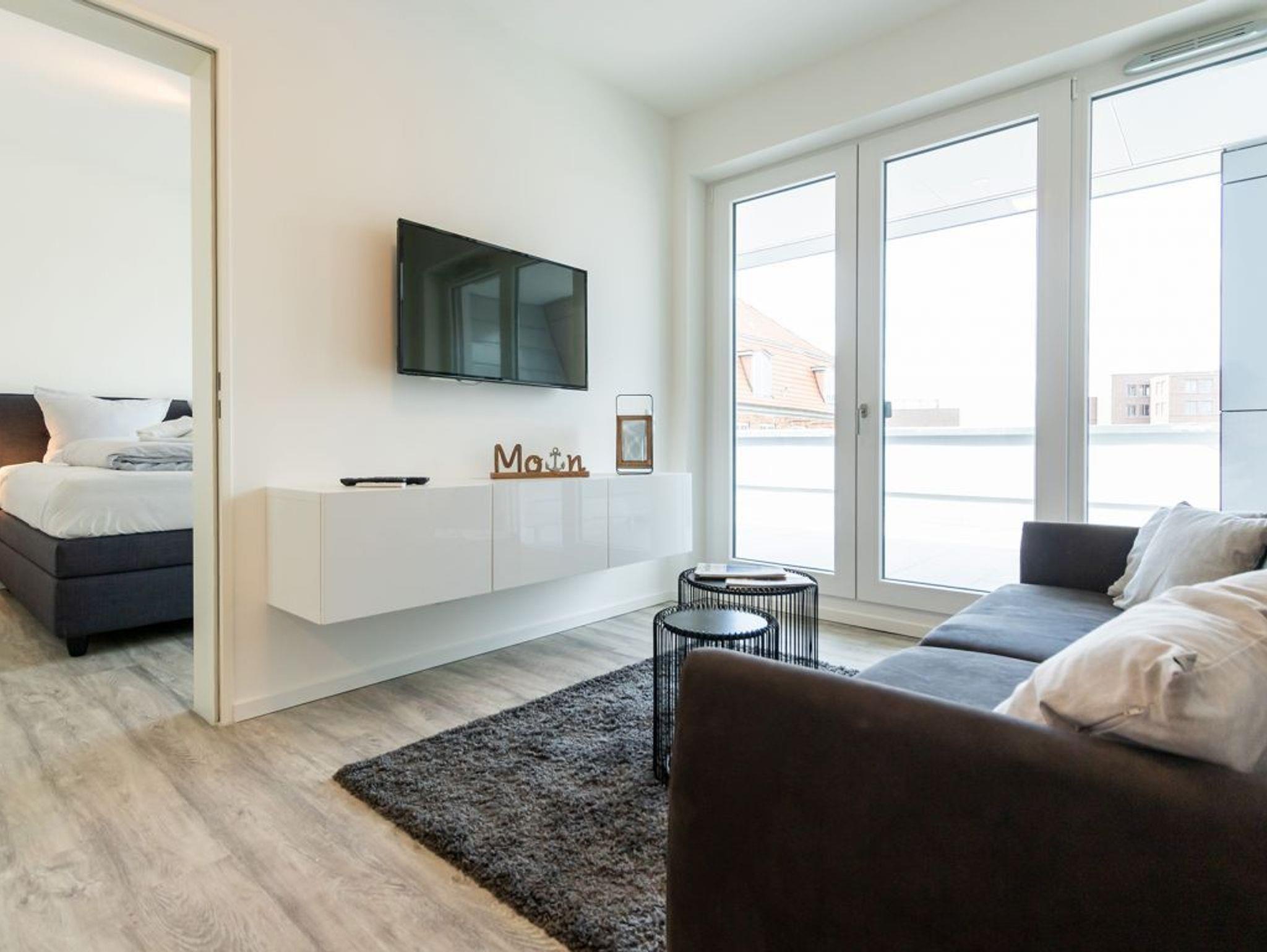 Das hochwertig eingerichtete 2-Zimmer Ferienappartement Hafenspitze 10 liegt im 1. Obergeschoss des Hauses und ist mit einer Wohnfläche von 49qm auf eine Belegung mit bis zu 4 Personen ausgerichtet. Von der sonnigen Dachloggia genießen Sie den Blick auf das Hafengebiet. Der helle Wohn-Essbereich verfügt über bodentiefe Fenster, die mit elektrischen Sonnenschutzrollos ausgestattet sind. Des Weiteren befinden sich im Wohnbereich internetfähiges TV mit Hotelmodus sowie Internet Radio. WLAN nutzen Sie selbstverständlich kostenfrei. Zudem sind im Wohnzimmer zwei weitere Schlafmöglichkeiten vorhanden, falls sie mit mehr als 2 Personen anreisen möchten.