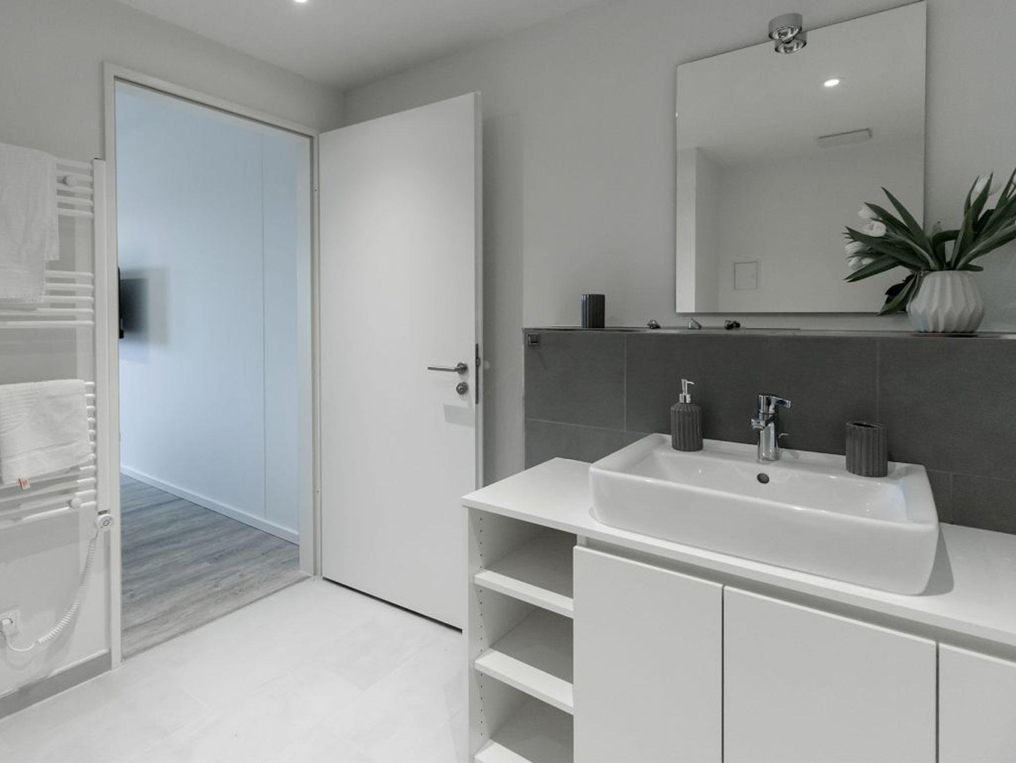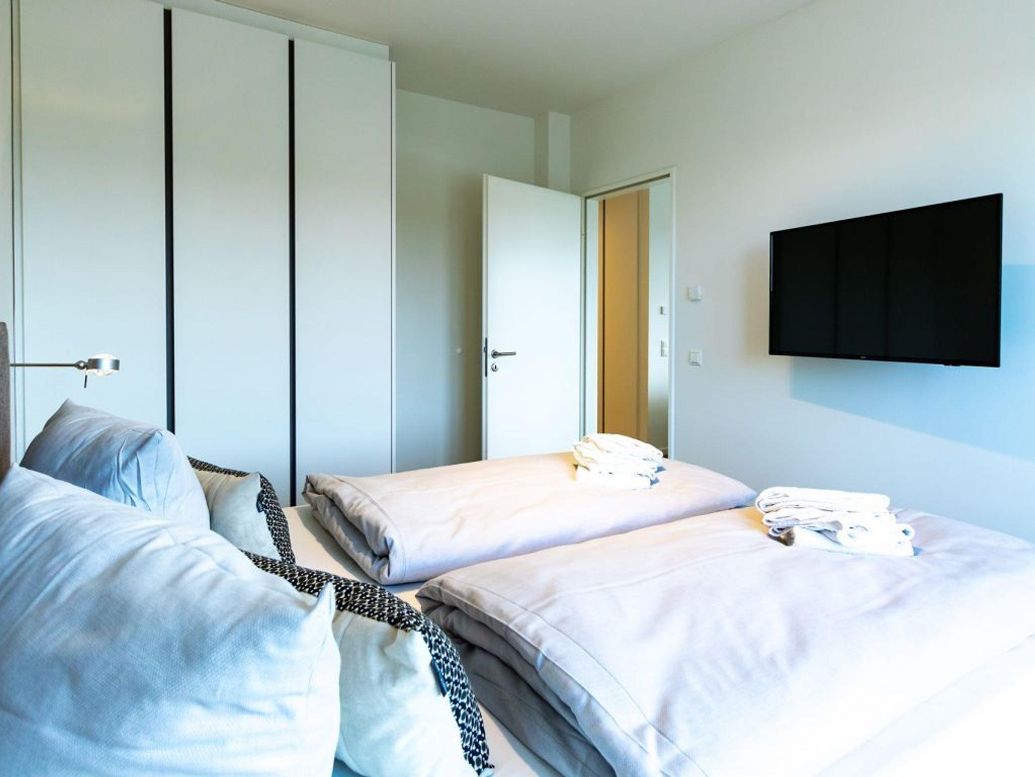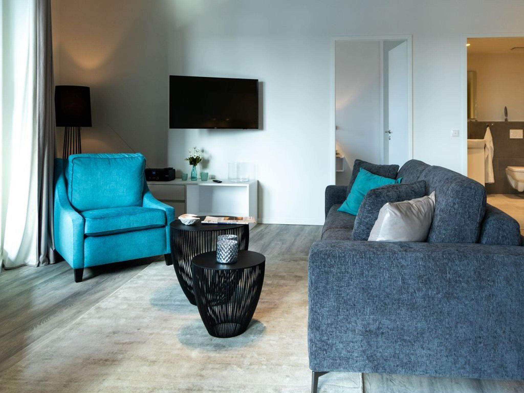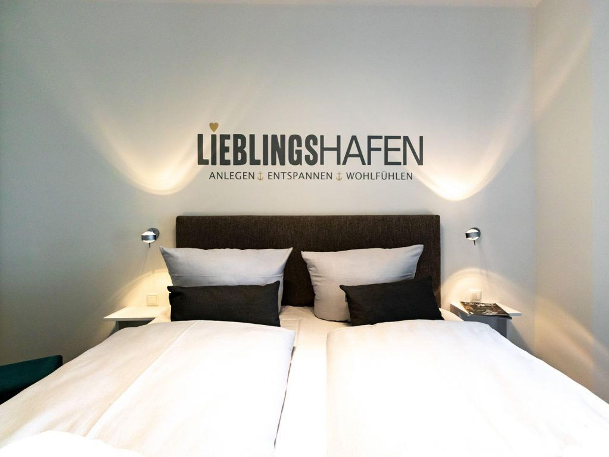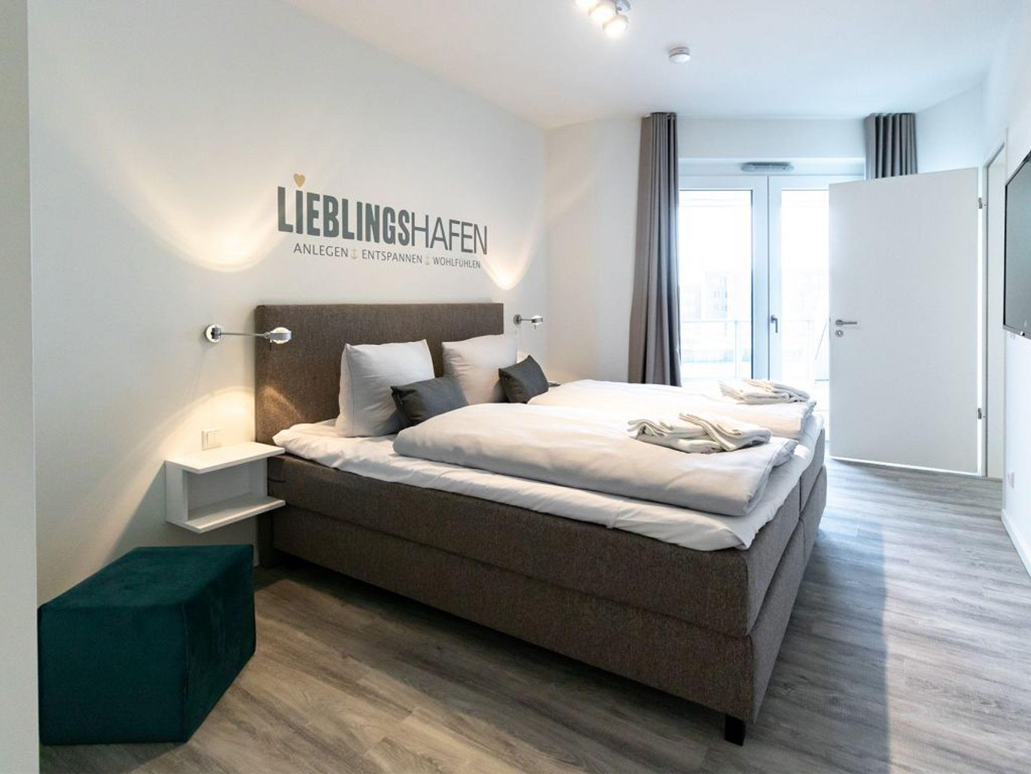 Der helle Wohn-/Essbereich bietet eine charmant moderne Möblierung und für technische Unterhaltung sorgen Flatscreen und Internetradio mit Hotelmodus. WLAN nutzen Sie selbstverständlich kostenfrei. Integriert ist zudem eine bestens ausgestattete Komfort Küchenzeile, so dass Sie sich bei Bedarf auch selbst versorgen können. Vom sonnigen Balkon blicken Sie entspannt auf das lebendige Hafenleben. Während der warmen Jahreszeit sorgen elektrisch bedienbare Außenrollos für die Beschattung der Wohnräume. Insbesondere ist hervorzuheben, dass dieses Appartement mit zwei separaten Schlafzimmern jeweils mit Garderobenschrank sowie mit zwei Duschbädern ausgestattet ist. Somit eignet sich diese Wohneinheit auch gut für befreundete Paare.