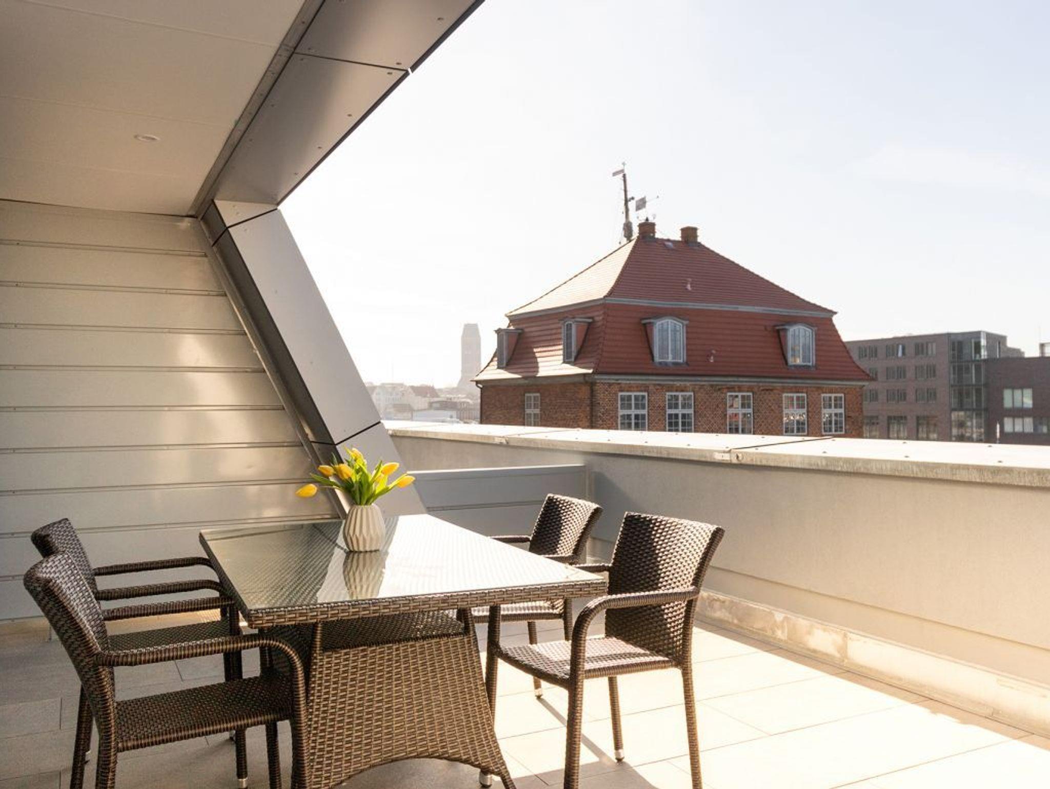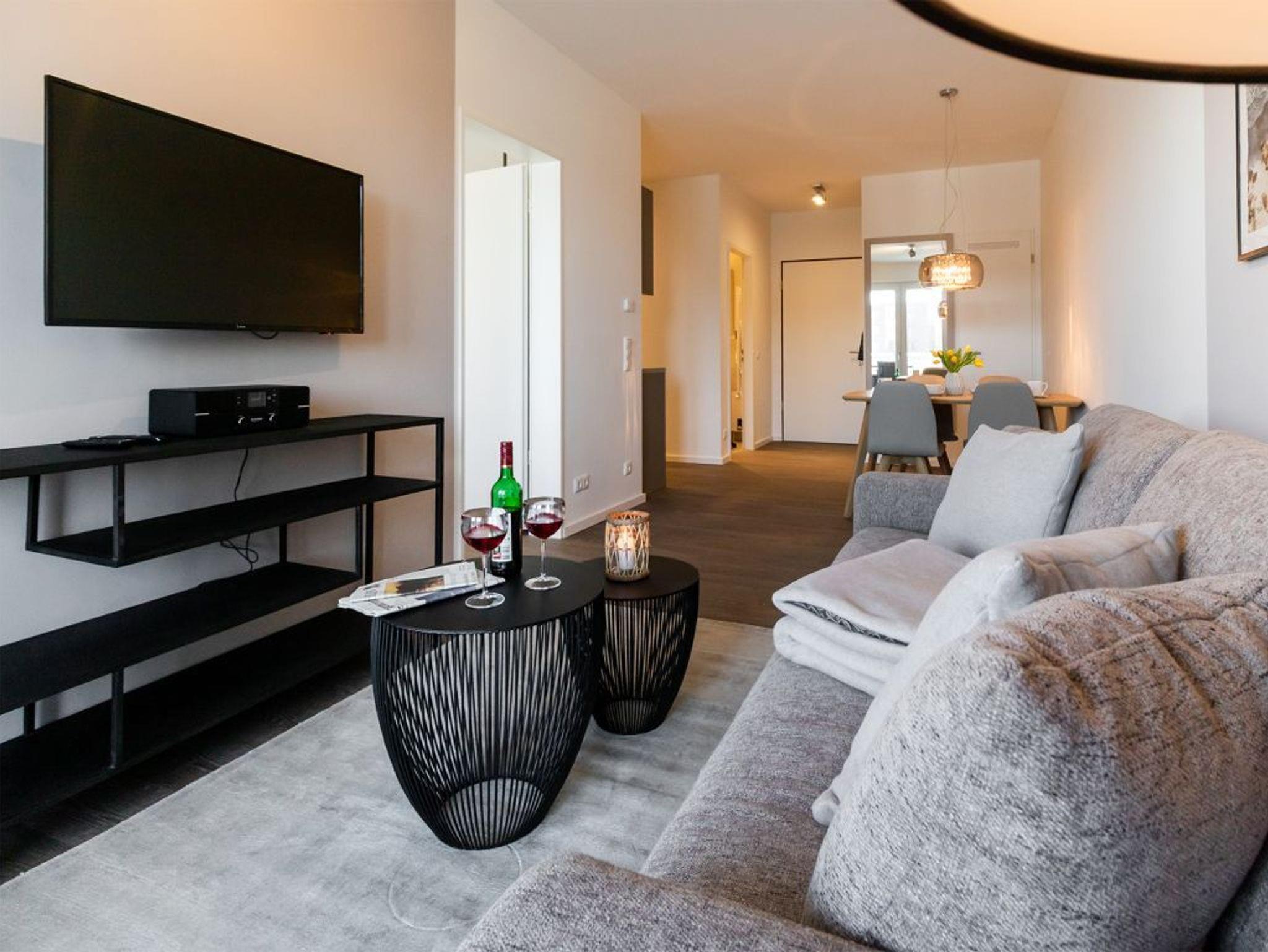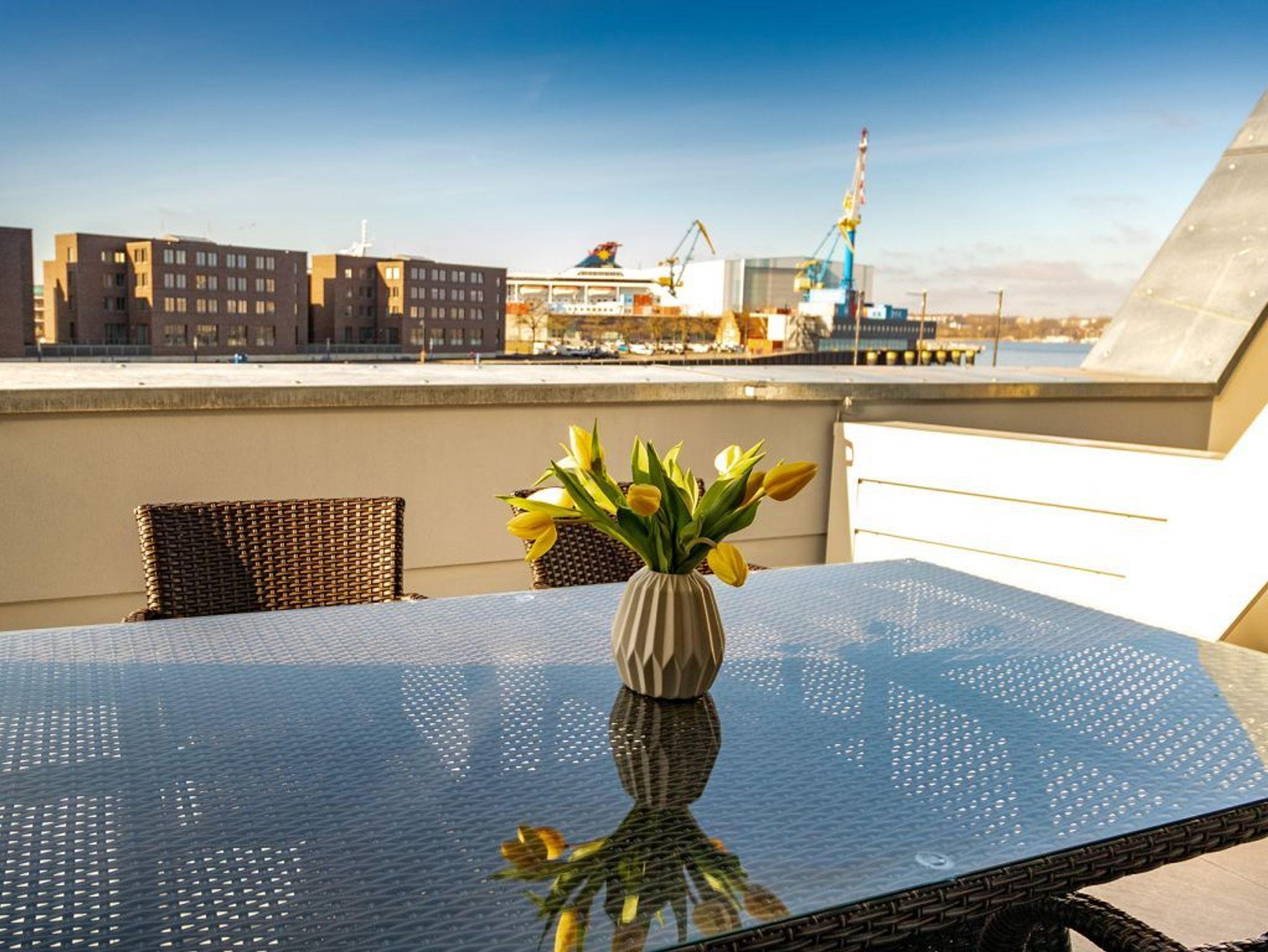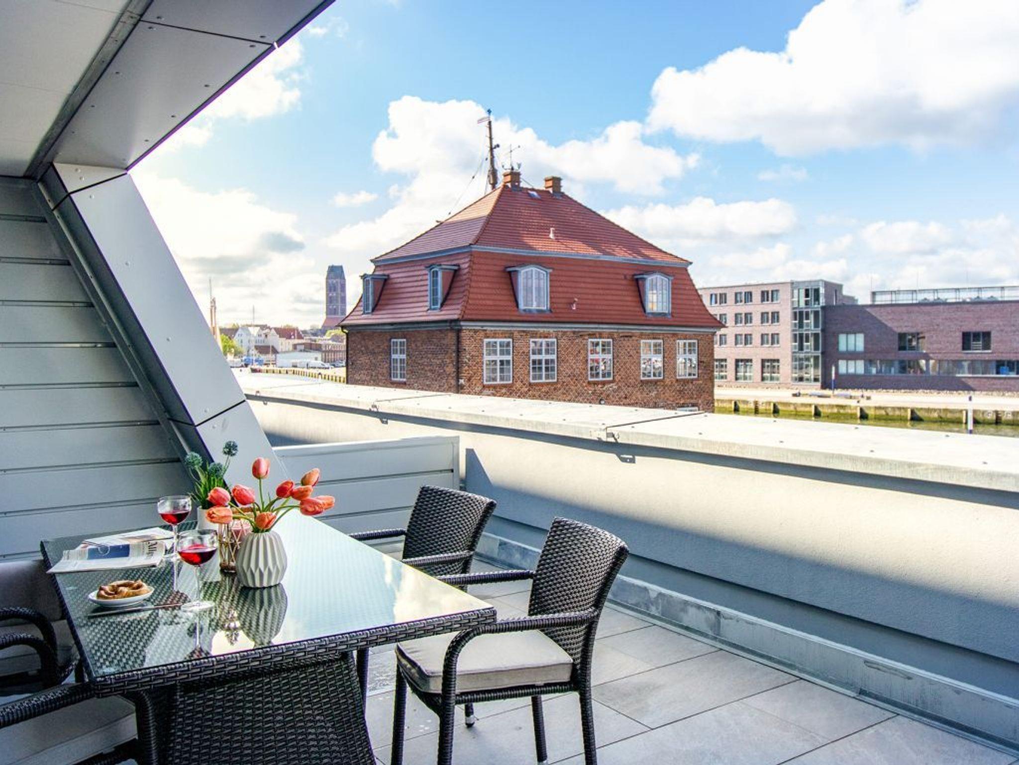 In dem exklusiv möblierten Ferienappartement Hafenspitze 13 genießen Sie einen Aufenthalt der Extraklasse. Mit dem Fahrstuhl gelangen Sie in die 1. Etage des Hauses. Es empfängt Sie ein modernes Appartement mit einer Wohnfläche von 58 qm, die für bis zu 4 Personen bestens geeignet ist. Von der sonnigen Dachterrasse schauen Sie direkt auf das maritime Hafenumfeld und auch auf die Ostsee. Bodentiefe Fenster lassen den Wohn-Essbereich mit Tageslicht fluten und selbstverständlich wurde elektrisch schaltbarer Sonnenschutz integriert. Zudem sind im Wohn-Esszimmer ein schickes Sofa sowie ein Esstisch. Internet Fernseher mit Hotelmodus und Internetradio sind ebenfalls vorhanden. Die Internetnutzung über WLAN erfolgt kostenfrei.