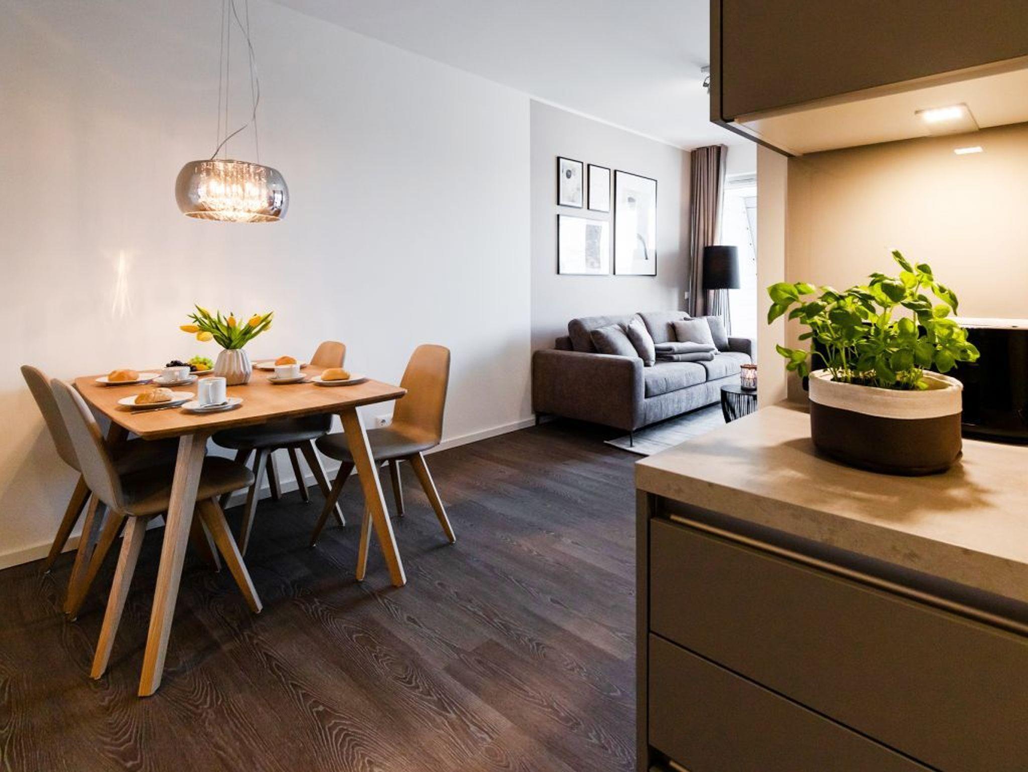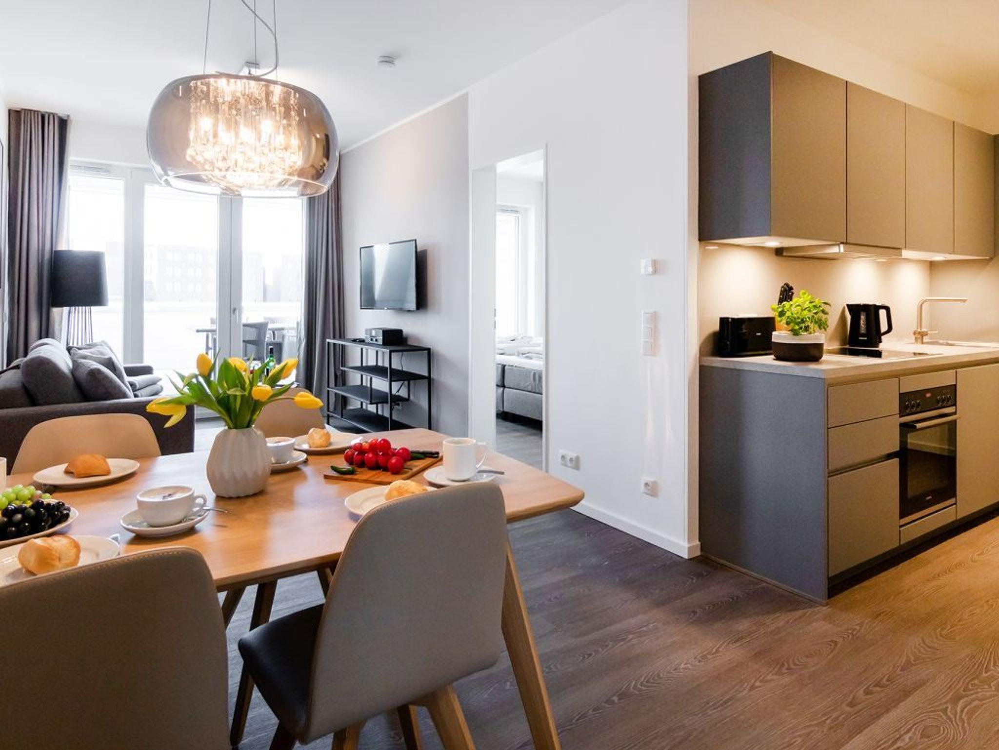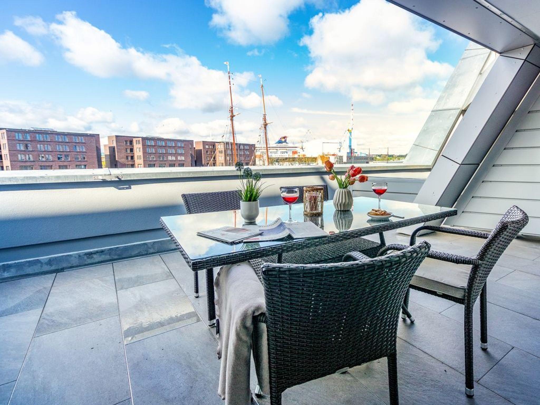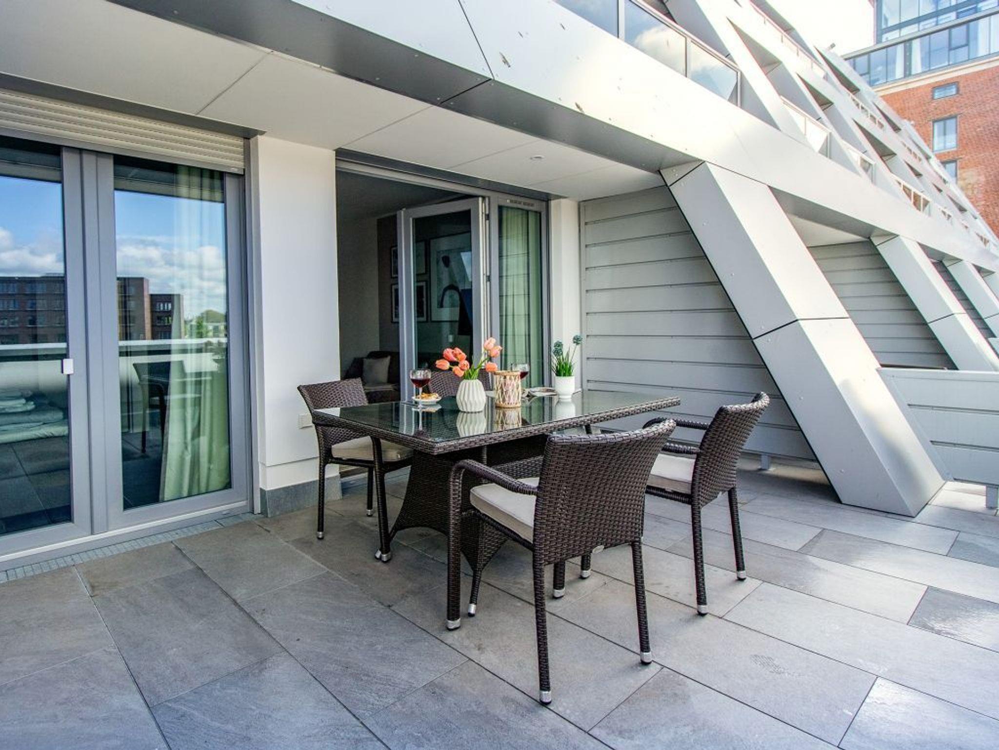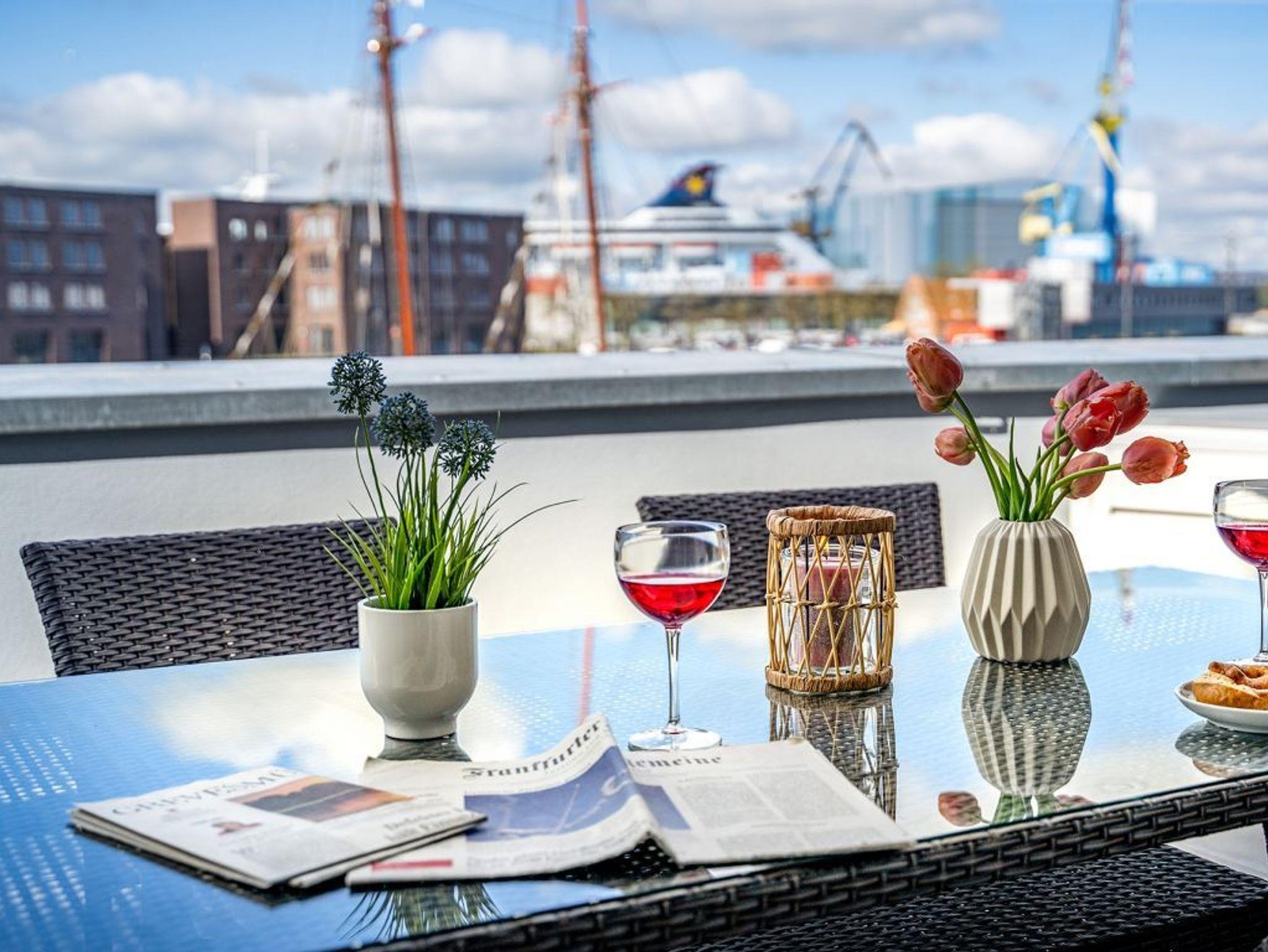 In dem exklusiv möblierten Ferienappartement Hafenspitze 13 genießen Sie einen Aufenthalt der Extraklasse. Mit dem Fahrstuhl gelangen Sie in die 1. Etage des Hauses. Es empfängt Sie ein modernes Appartement mit einer Wohnfläche von 58 qm, die für bis zu 4 Personen bestens geeignet ist. Von der sonnigen Dachterrasse schauen Sie direkt auf das maritime Hafenumfeld und auch auf die Ostsee. Bodentiefe Fenster lassen den Wohn-Essbereich mit Tageslicht fluten und selbstverständlich wurde elektrisch schaltbarer Sonnenschutz integriert. Zudem sind im Wohn-Esszimmer ein schickes Sofa sowie ein Esstisch. Internet Fernseher mit Hotelmodus und Internetradio sind ebenfalls vorhanden. Die Internetnutzung über WLAN erfolgt kostenfrei.