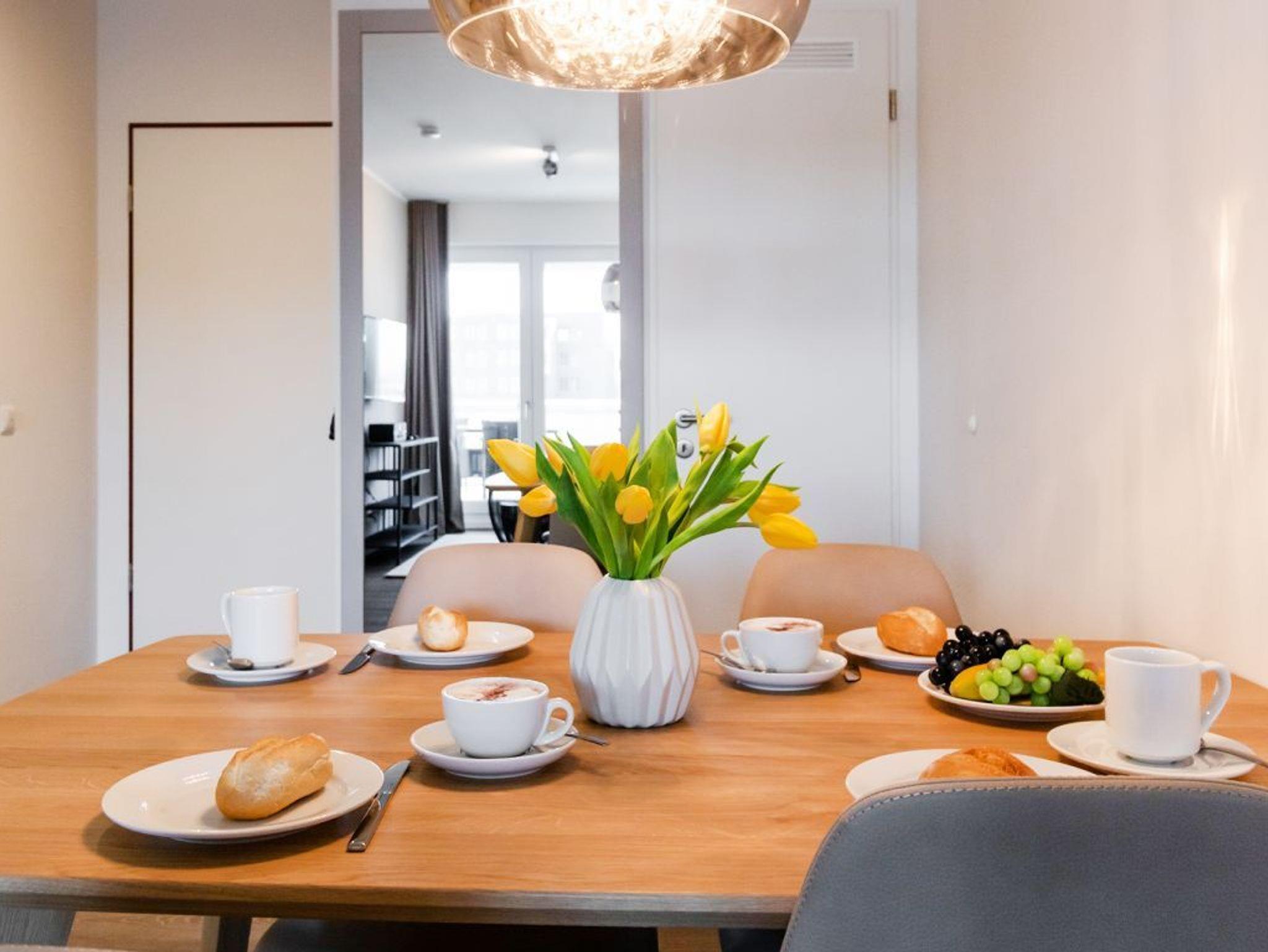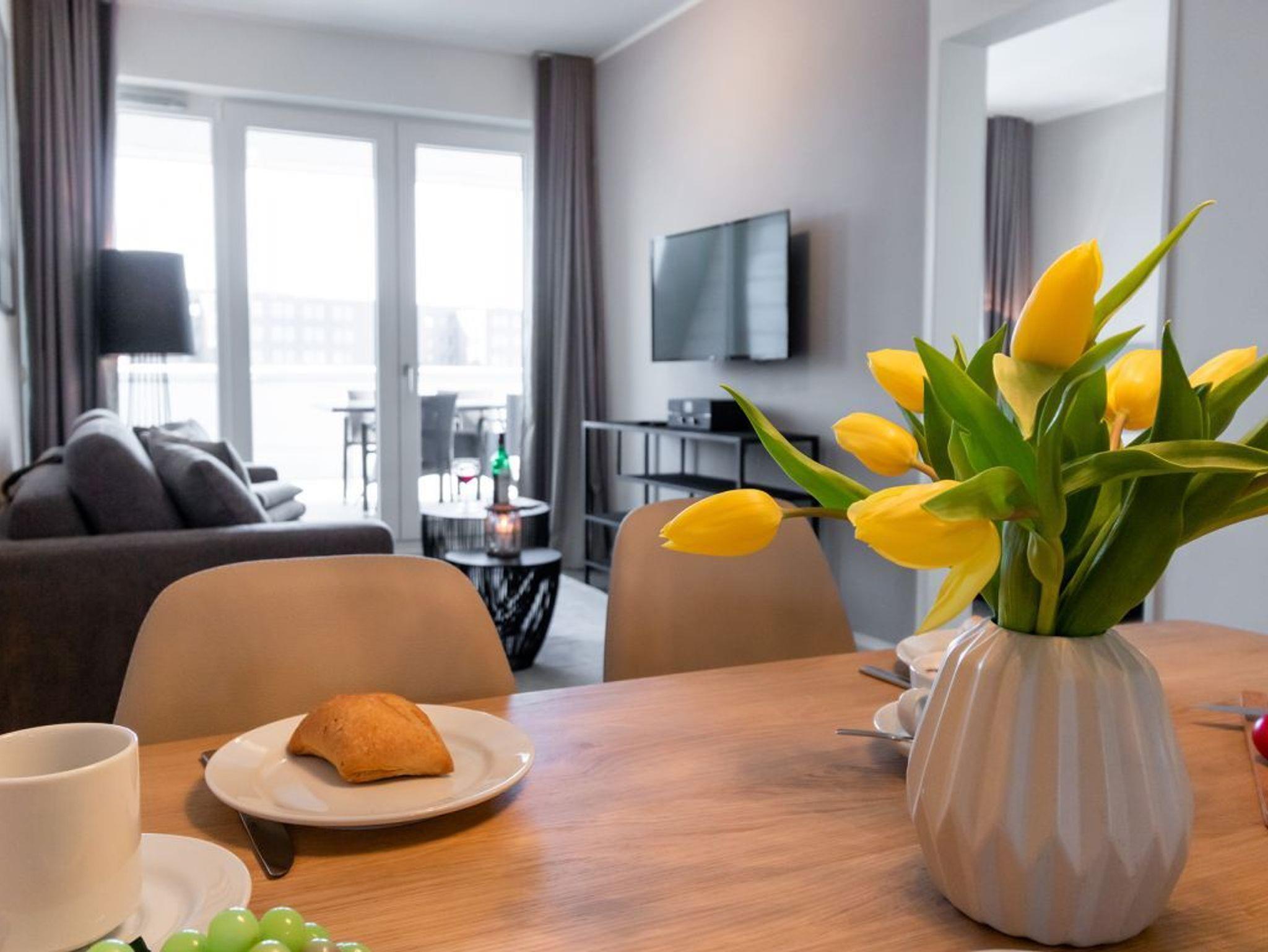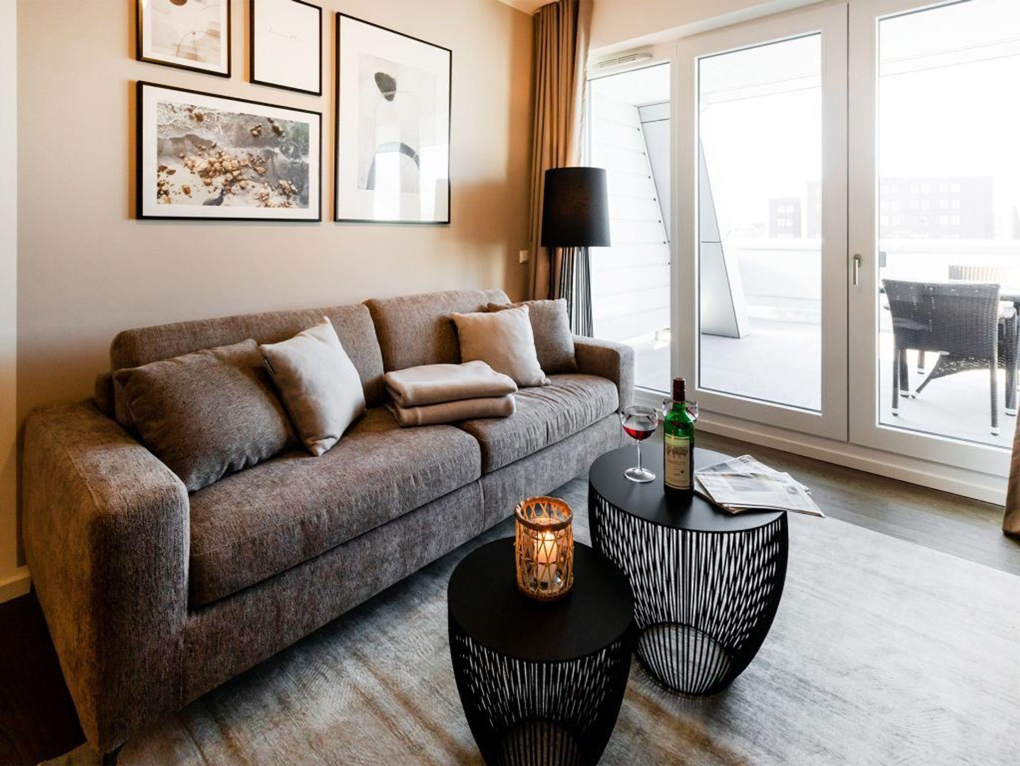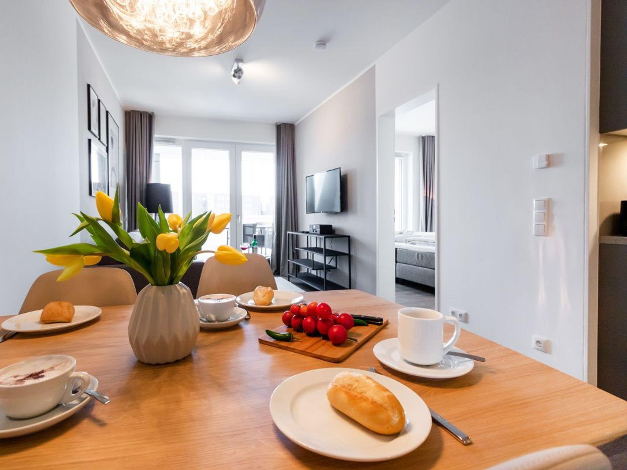 In dem exklusiv möblierten Ferienappartement Hafenspitze 13 genießen Sie einen Aufenthalt der Extraklasse. Mit dem Fahrstuhl gelangen Sie in die 1. Etage des Hauses. Es empfängt Sie ein modernes Appartement mit einer Wohnfläche von 58 qm, die für bis zu 4 Personen bestens geeignet ist. Von der sonnigen Dachterrasse schauen Sie direkt auf das maritime Hafenumfeld und auch auf die Ostsee. Bodentiefe Fenster lassen den Wohn-Essbereich mit Tageslicht fluten und selbstverständlich wurde elektrisch schaltbarer Sonnenschutz integriert. Zudem sind im Wohn-Esszimmer ein schickes Sofa sowie ein Esstisch. Internet Fernseher mit Hotelmodus und Internetradio sind ebenfalls vorhanden. Die Internetnutzung über WLAN erfolgt kostenfrei.