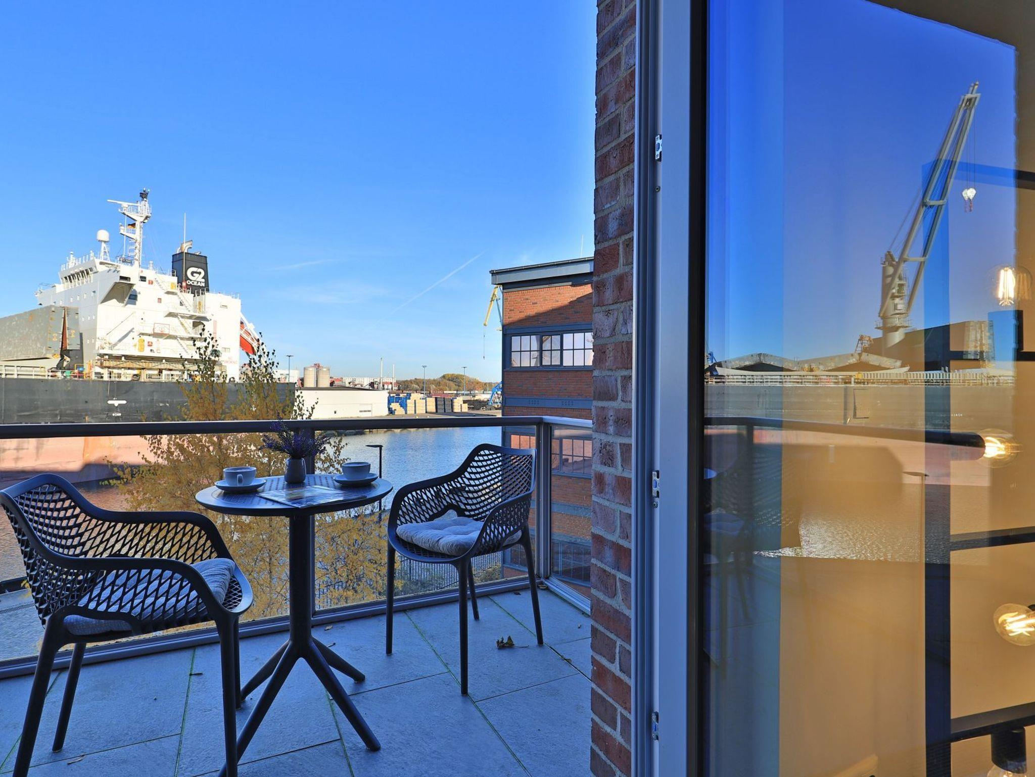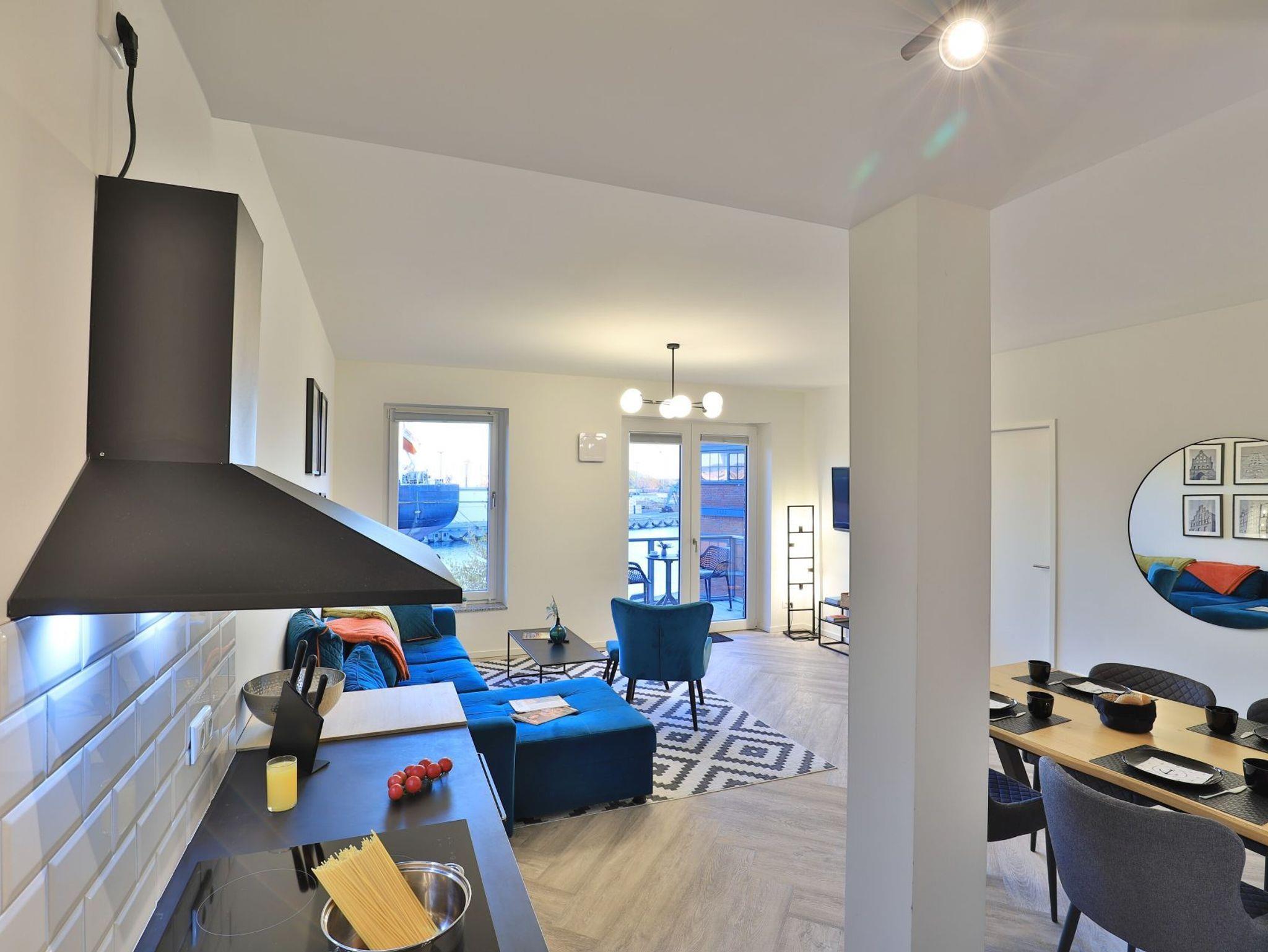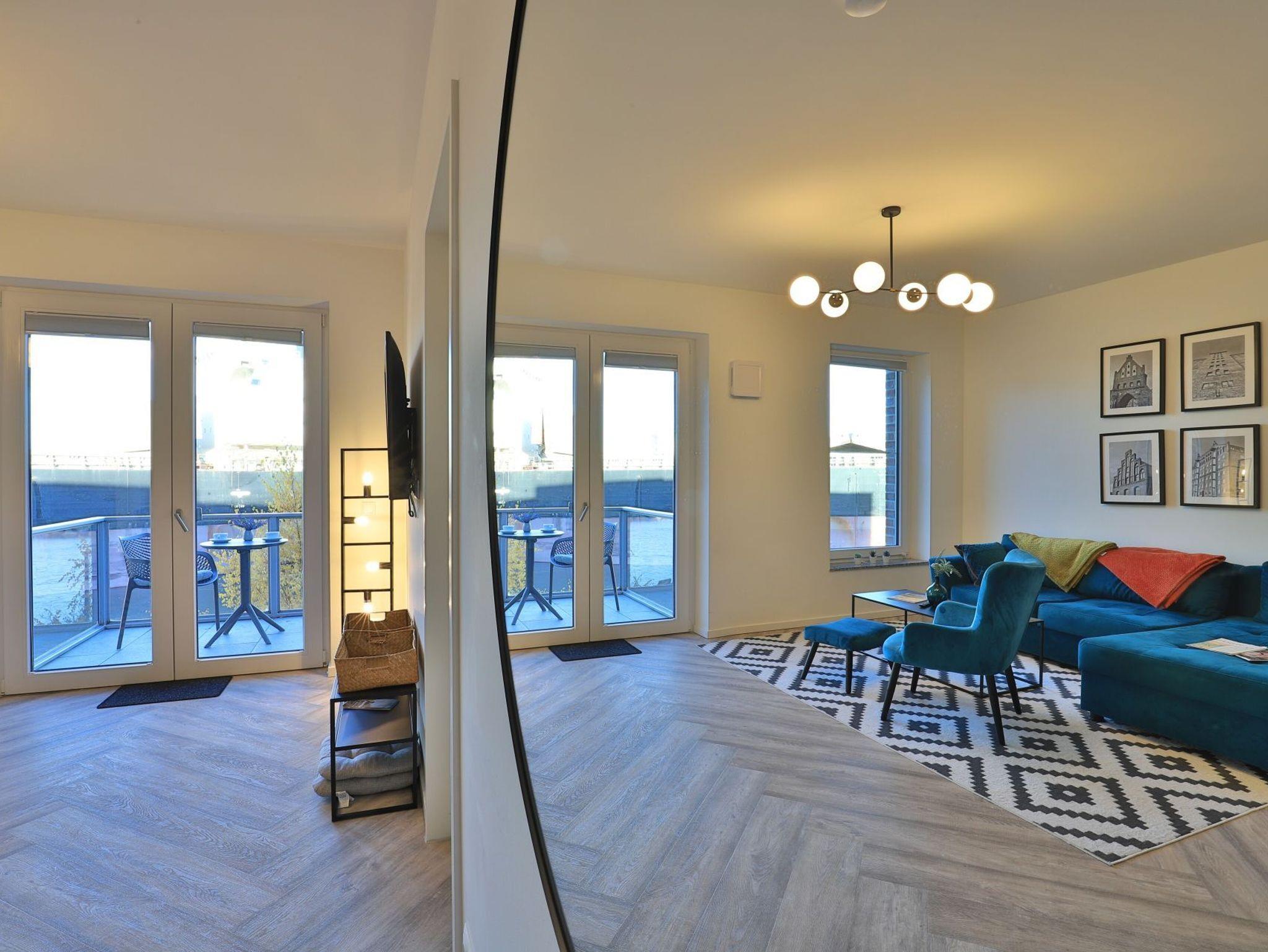 Das Appartement in der Hafenspitze 21 befindet sich im 2. Obergeschoss des Hauses und ist mit dem Personenaufzug leicht erreichbar. Die attraktive 2-Zimmer-Wohnung besitzt einen saisonal möblierten Balkon mit Blickrichtung zum Alten Holzhafen. Es empfängt Sie ein sehr modernes Ferienappartement für maximal 4 Personen mit einer Wohnfläche von 56qm. Der elegant gestaltete Wohn-Essbereich empfängt Sie herzlich mit einer bequemen Sitzgarnitur, welche Ihnen zwei zusätzliche Schlafgelegenheiten bieten kann, einem Ruhesessel sowie technischer Unterhaltung mit Internet fähigem TV sowie Radio mit Hotelmodus. WLAN nutzen Sie selbstverständlich kostenfrei.