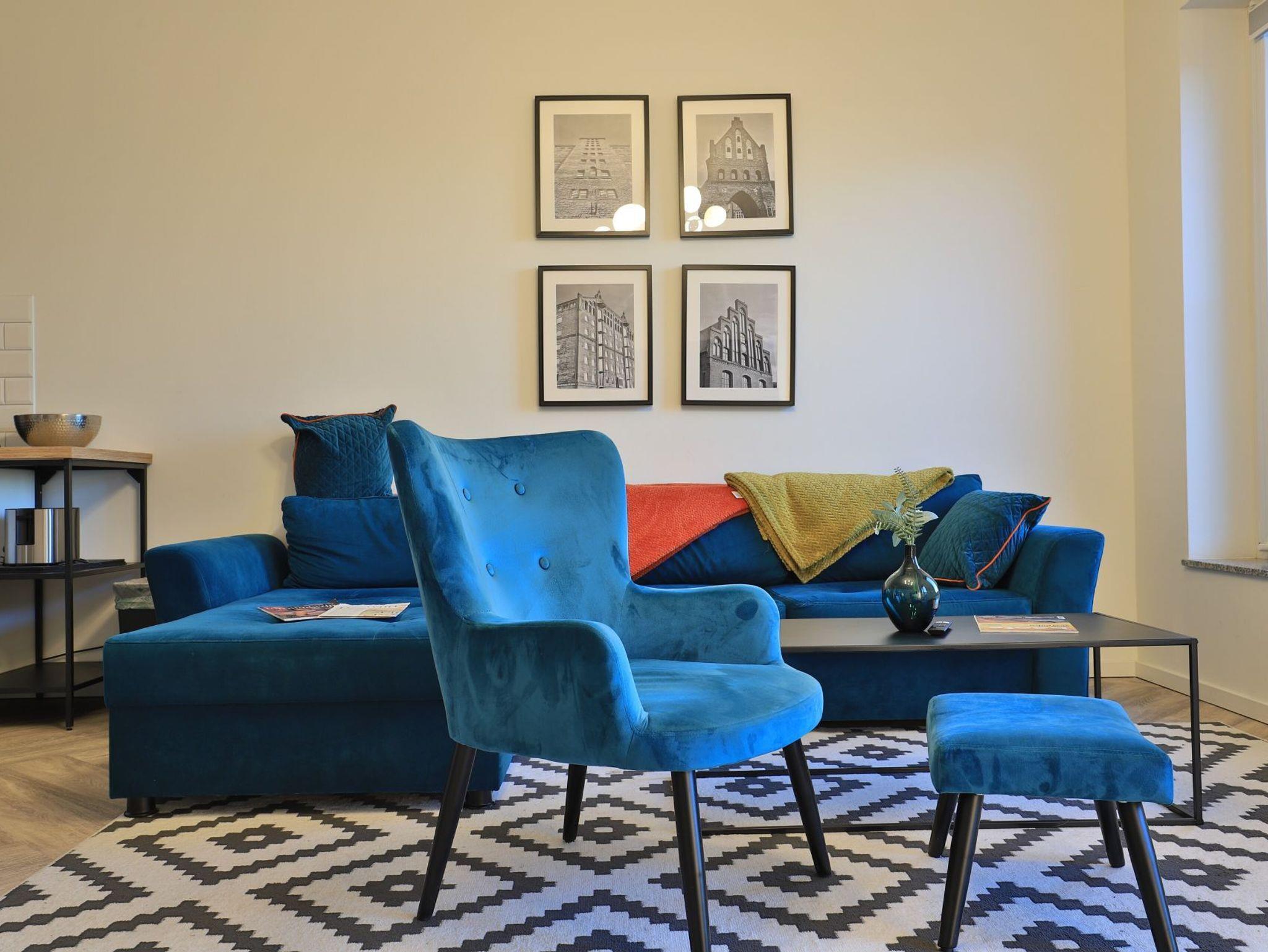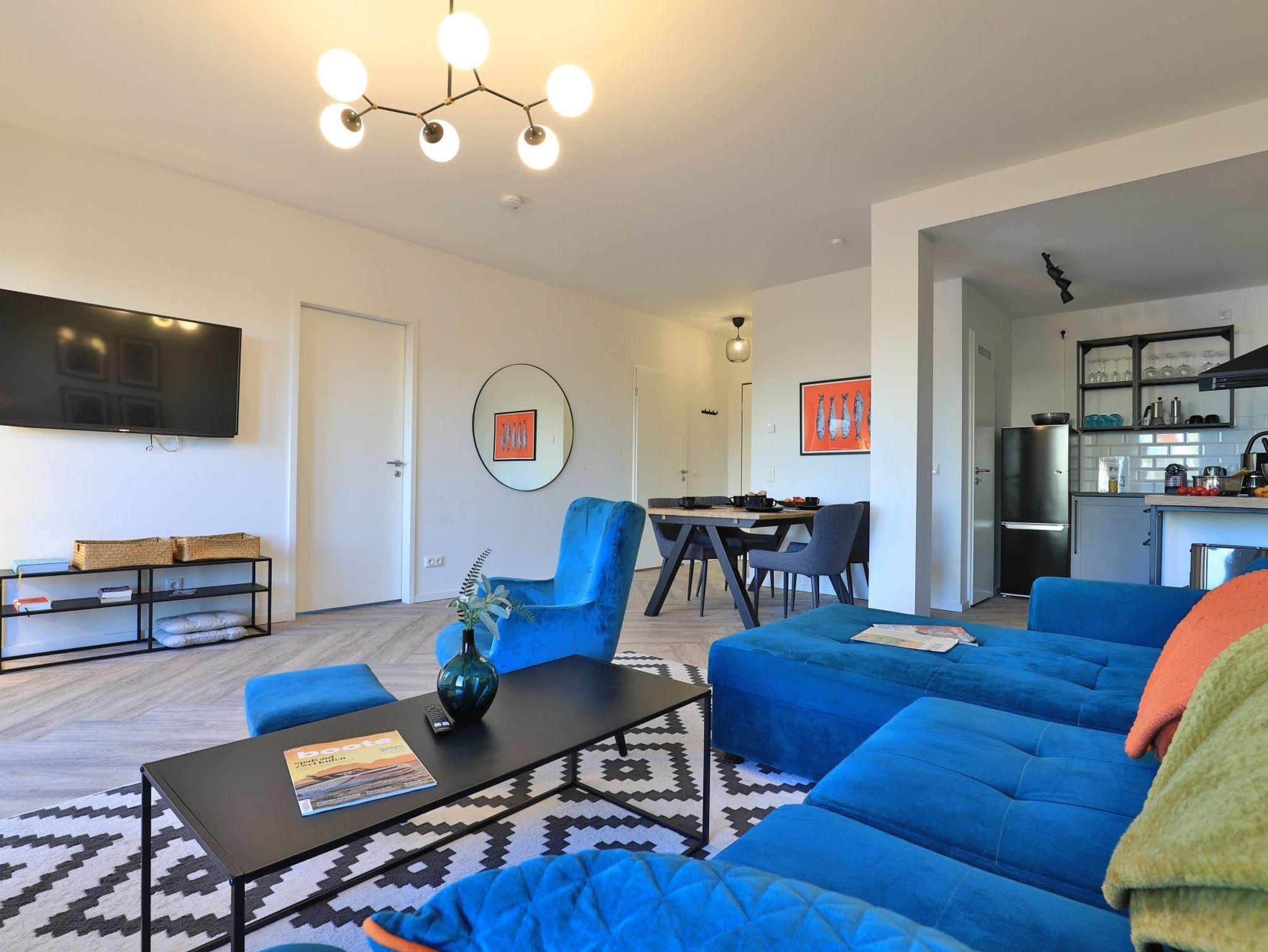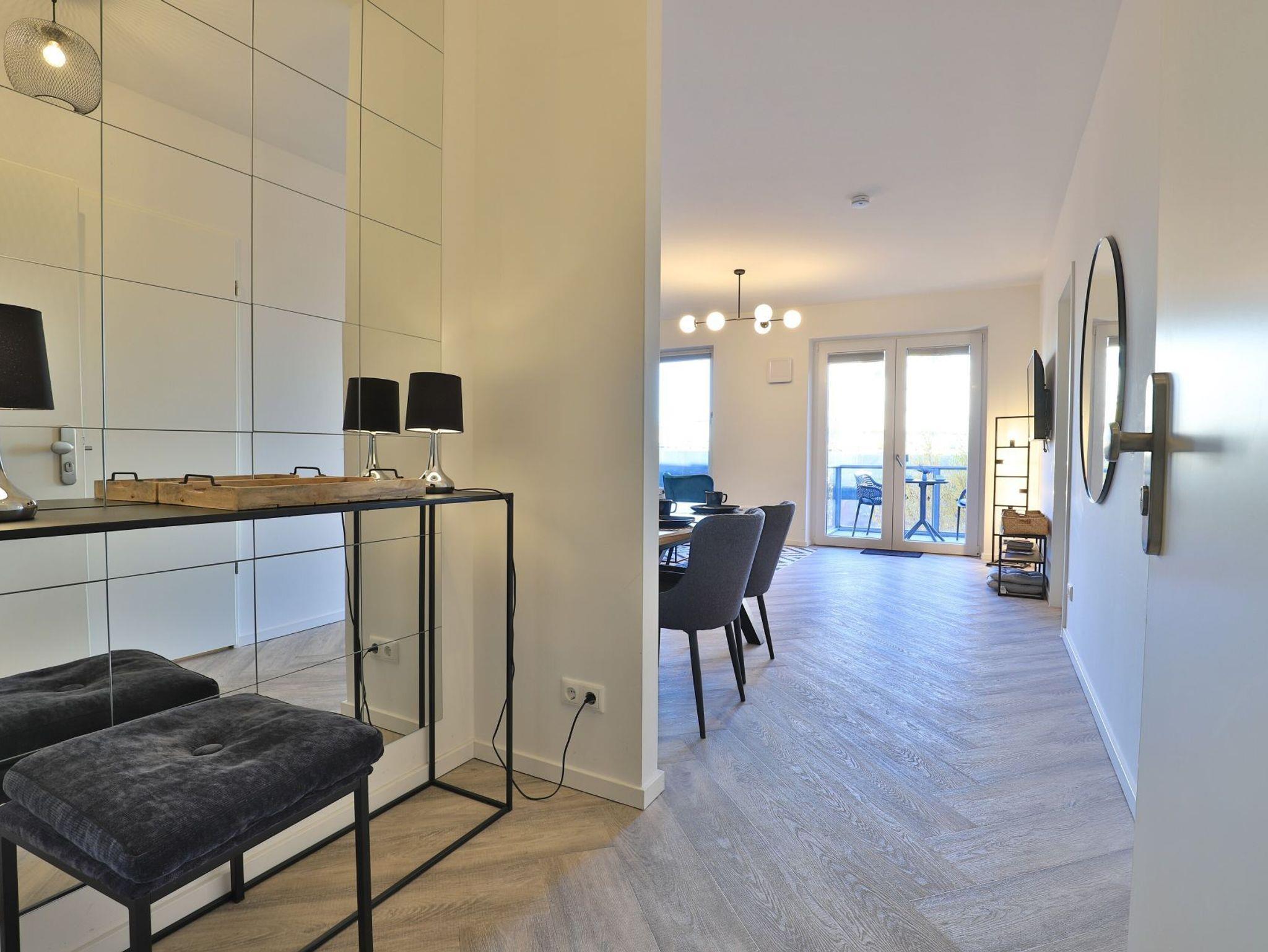 Das Appartement in der Hafenspitze 21 befindet sich im 2. Obergeschoss des Hauses und ist mit dem Personenaufzug leicht erreichbar. Die attraktive 2-Zimmer-Wohnung besitzt einen saisonal möblierten Balkon mit Blickrichtung zum Alten Holzhafen. Es empfängt Sie ein sehr modernes Ferienappartement für maximal 4 Personen mit einer Wohnfläche von 56qm. Der elegant gestaltete Wohn-Essbereich empfängt Sie herzlich mit einer bequemen Sitzgarnitur, welche Ihnen zwei zusätzliche Schlafgelegenheiten bieten kann, einem Ruhesessel sowie technischer Unterhaltung mit Internet fähigem TV sowie Radio mit Hotelmodus. WLAN nutzen Sie selbstverständlich kostenfrei.