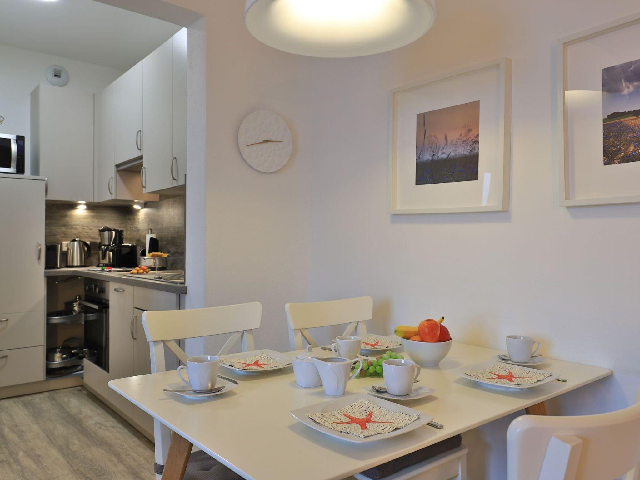 Appartementhaus mit 48 Appartements. Das hochwertig ausgestattete 3-Zimmer-Appartement befindet sich in der 2.Etage des Gebäudes. In dem Appartement können auf 63 m² bis zu 6 Personen einen traumhaften Urlaub verbringen. Das komfortable Wohnzimmer mit Fernseher und integrierter Küche lädt zum Verweilen ein. Die 2 separaten Schlafzimmer bieten für 4 Personen erholsame Nächte. Des Weiteren verfügt das stilvolle Appartement über ein Duschbad und eine Sauna. Bei Anreise sind 2 Betten bezogen und Handtücher liegen für Sie bereit. WLAN steht Ihnen kostenfrei zur Verfügung. In unmittelbarer Nähe sind öffentliche Parkplätze vorhanden.