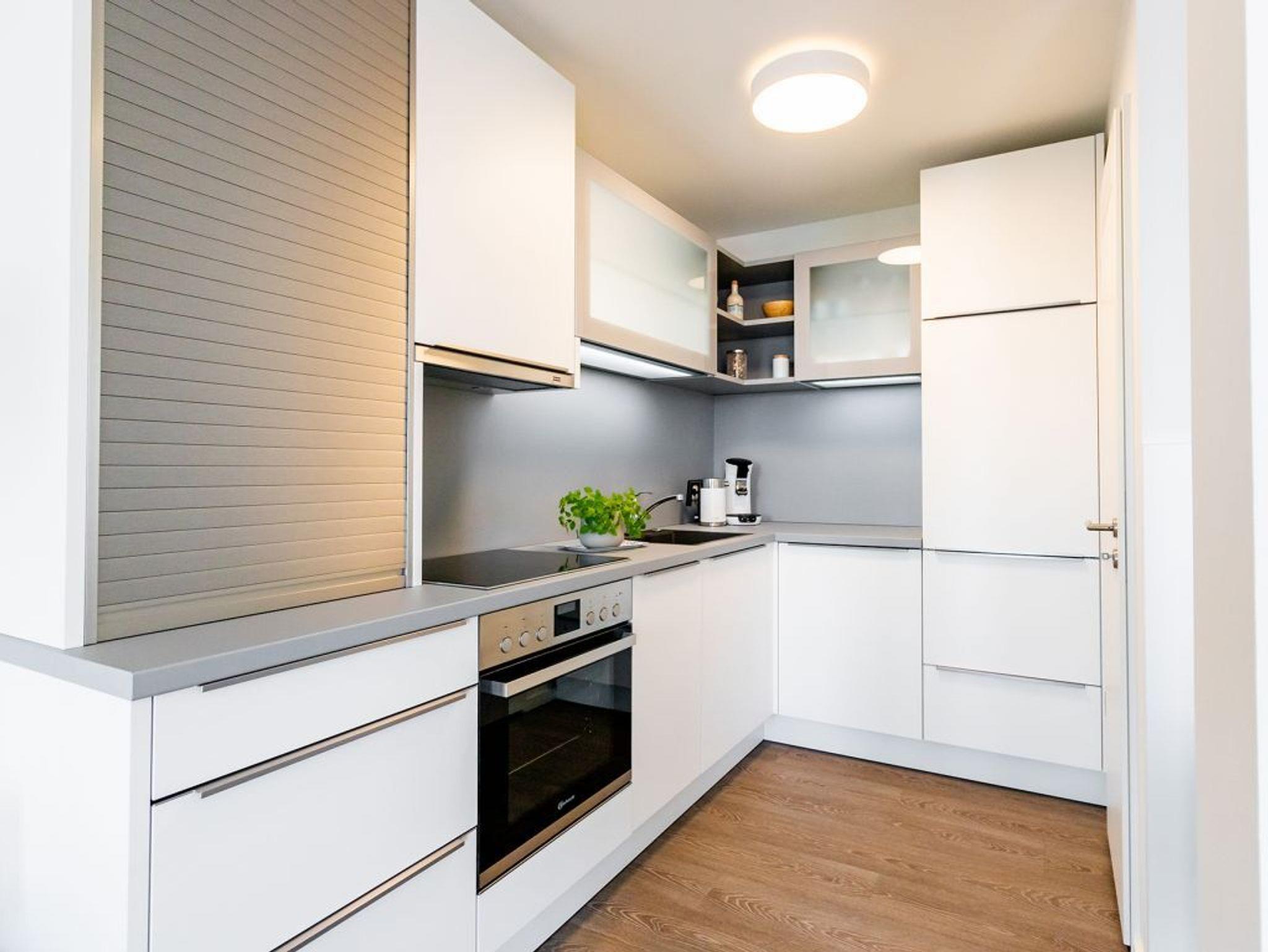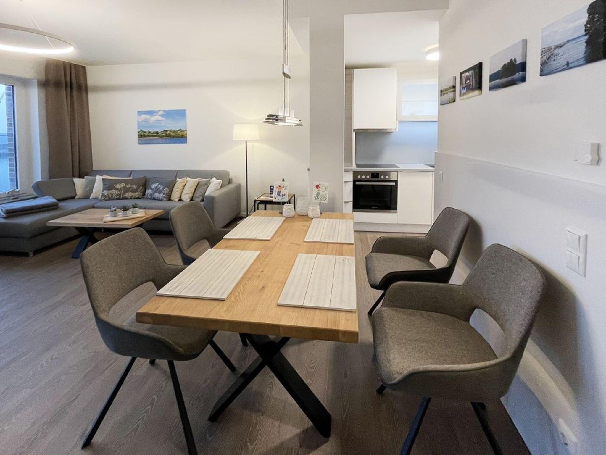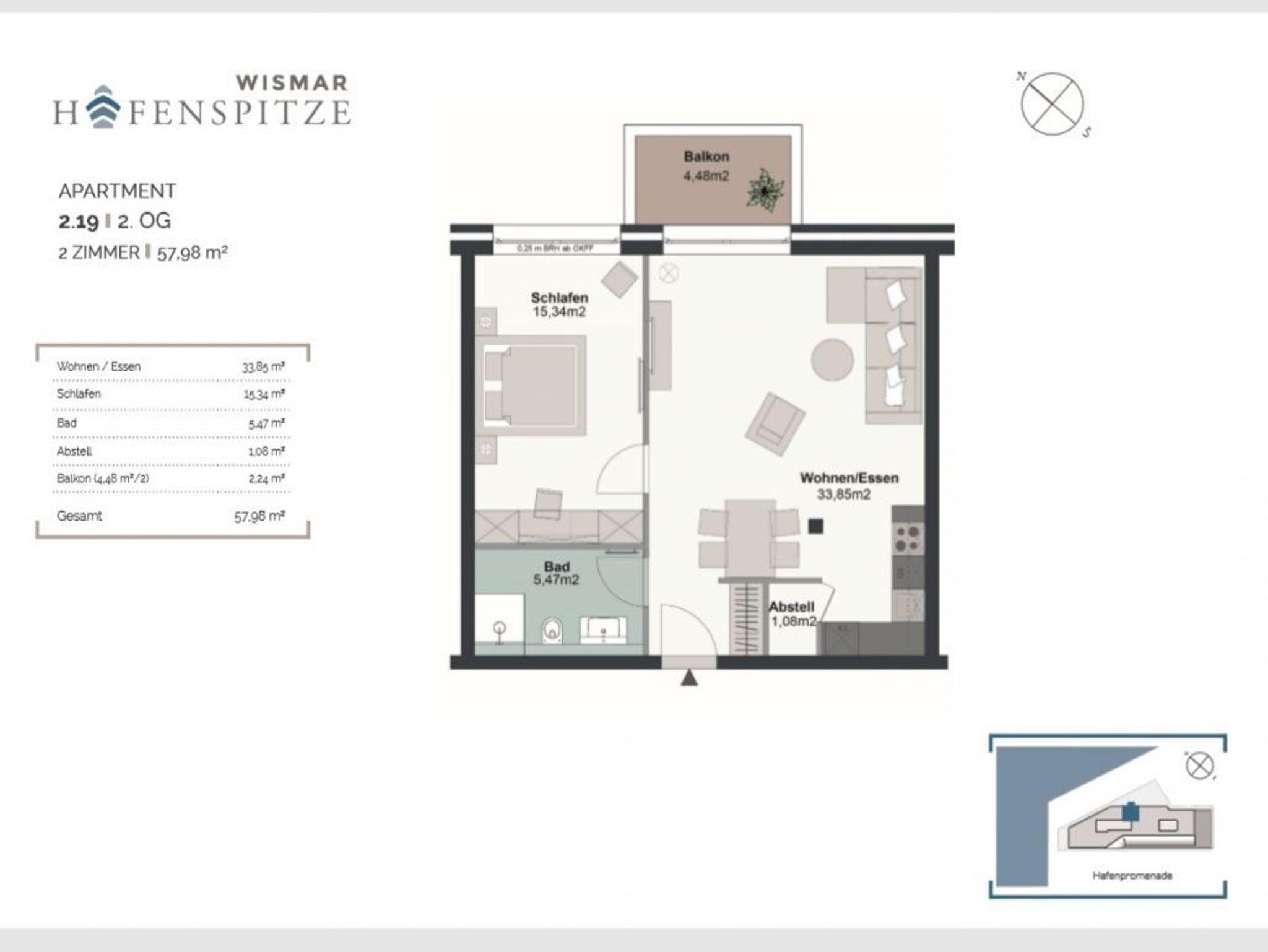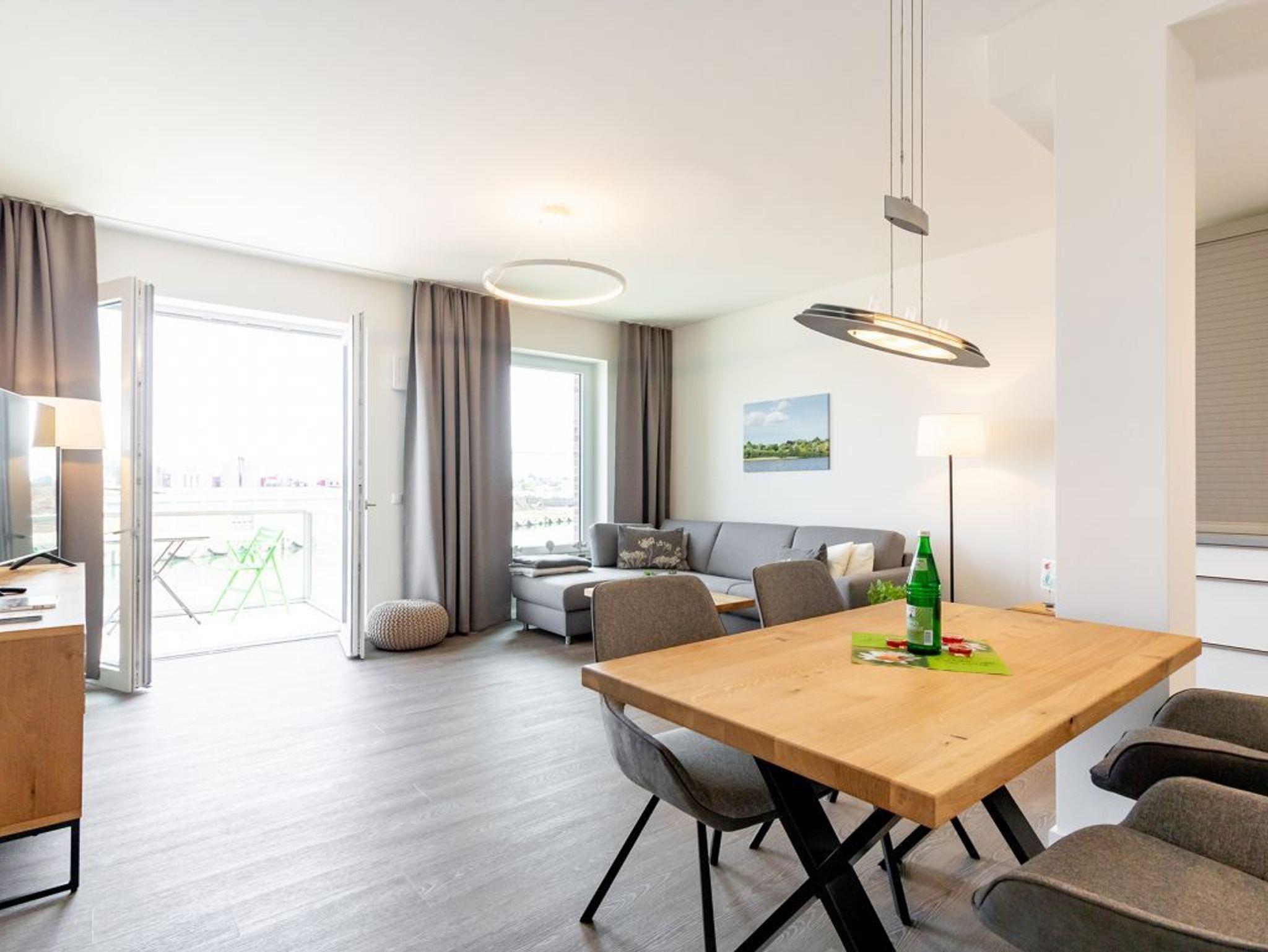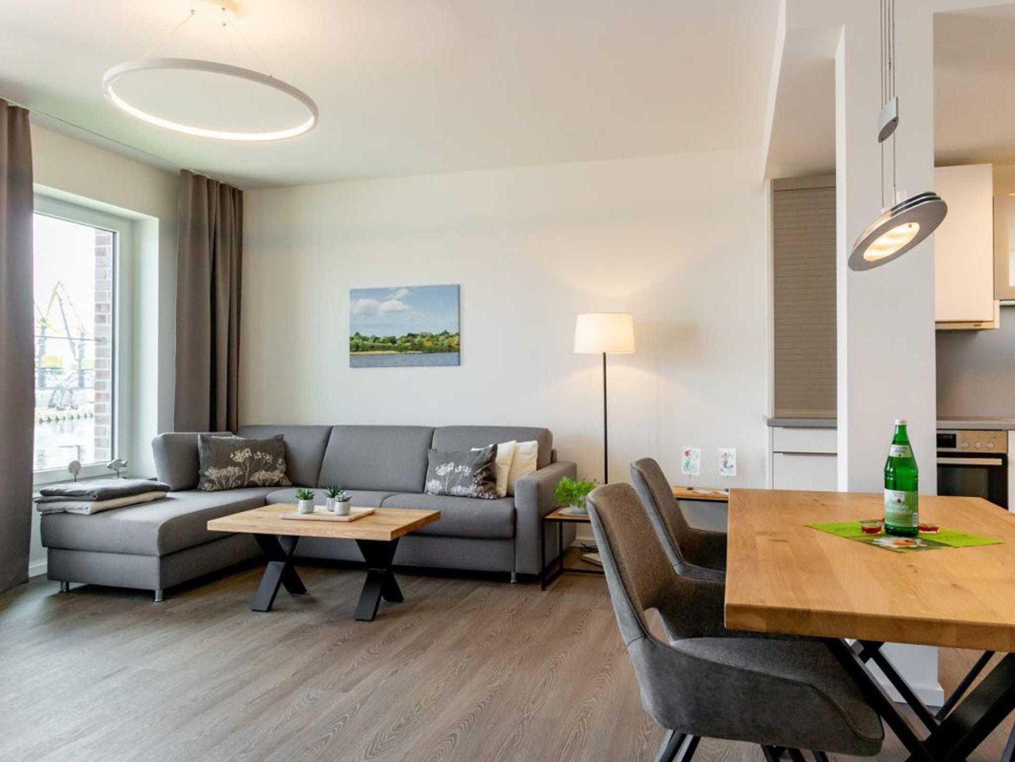 In der Ferienwohnung Hafenspitze 19 mit Hotelkomfort und Hafenblick werden Sie sich Rund um wohlfühlen. Mit einer großzügigen Wohnfläche von 59 qm empfängt Sie das helle 2-Zimmer-Ferienappartement im 2. Obergeschoss des Hauses, wohin Sie bequem mit dem Fahrstuhl gelangen. Das attraktive Komfort Appartement besitzt einen Balkon mit Blickrichtung zum Holzhafen. Der Wohn-/Essbereich lädt zum Entspannen ein und bietet ein insgesamt modernes Design mit Komfort Sofa sowie Esstisch und voll ausgestatteter Küchenzeile. Die Internetnutzung über WLAN ist selbstverständlich kostenfrei. Für Unterhaltung sorgen ein Fernseher mit Hotelmodus sowie ein Internetradio. Ihre Nächte verbringen Sie in einem separaten Schlafzimmer mit Doppelbett und Garderobenschrank.